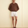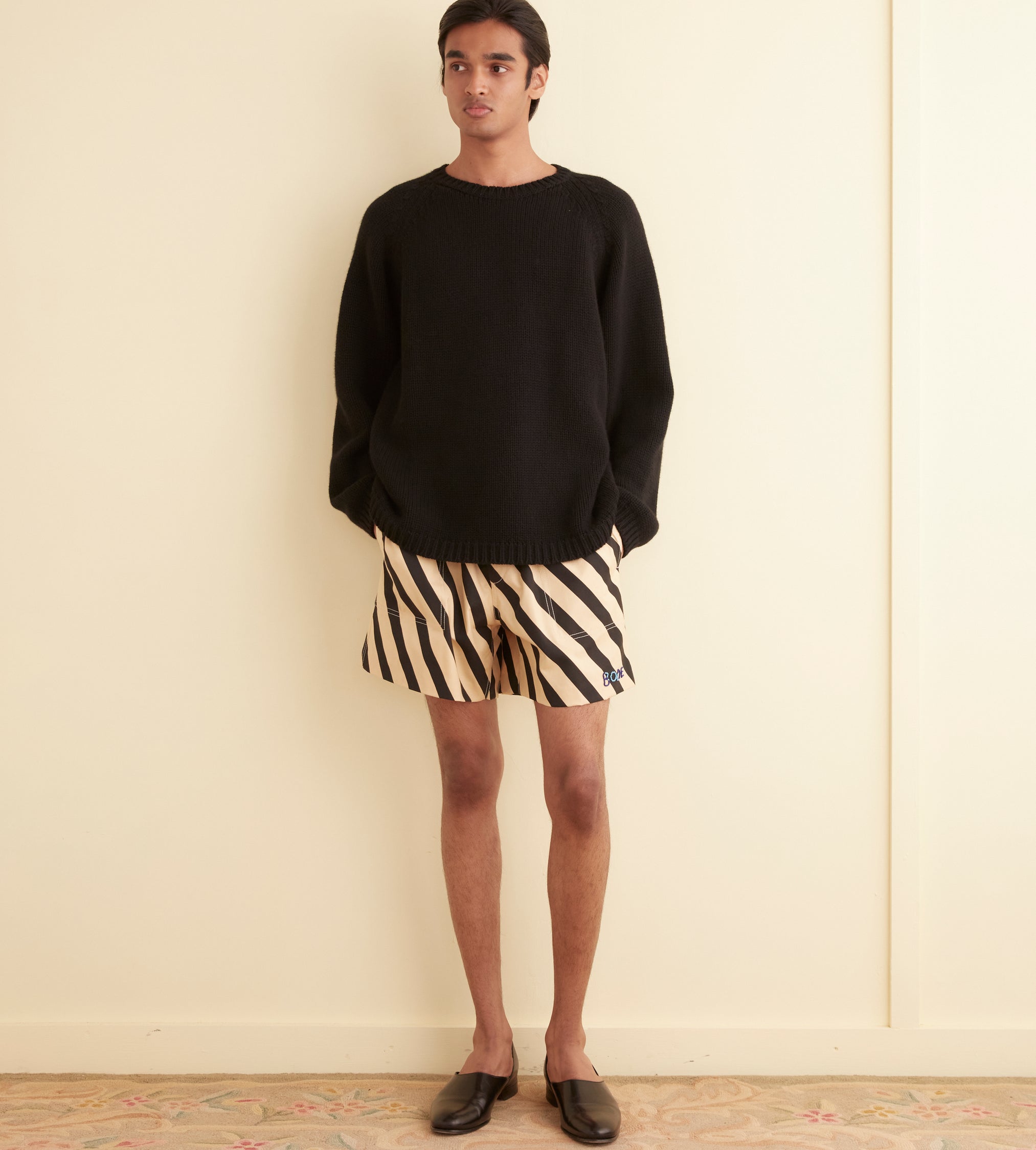 These shorts are inspired by a striped costume hat from the early 20th century. We reproduced the pattern and hand-beaded lettering for this style. The shorts feature a beaded “Bode” on the front left hem.