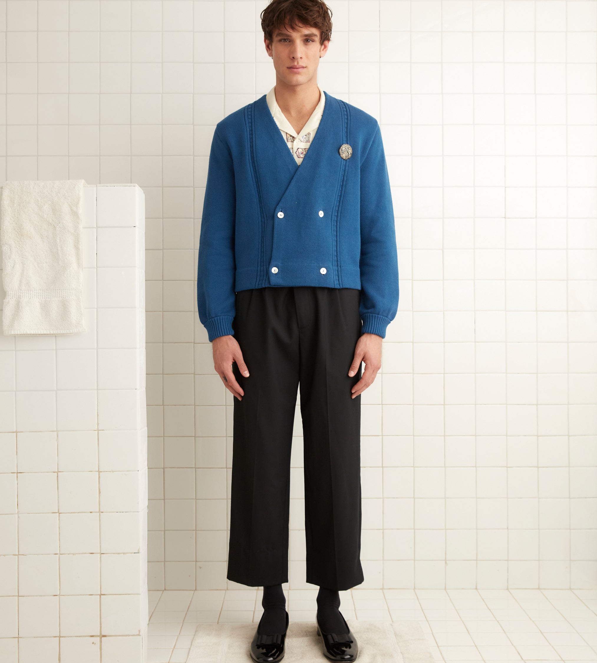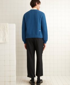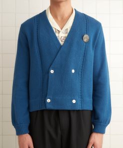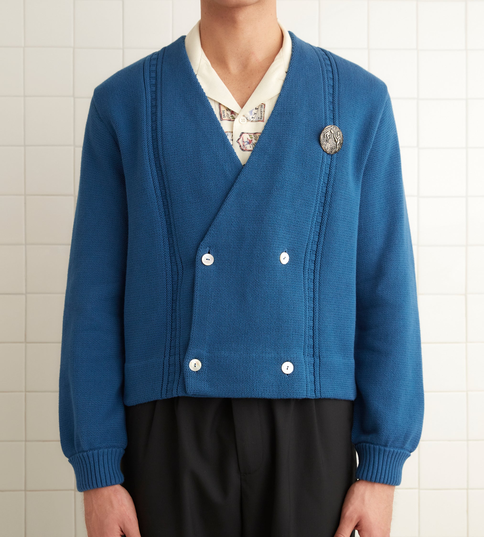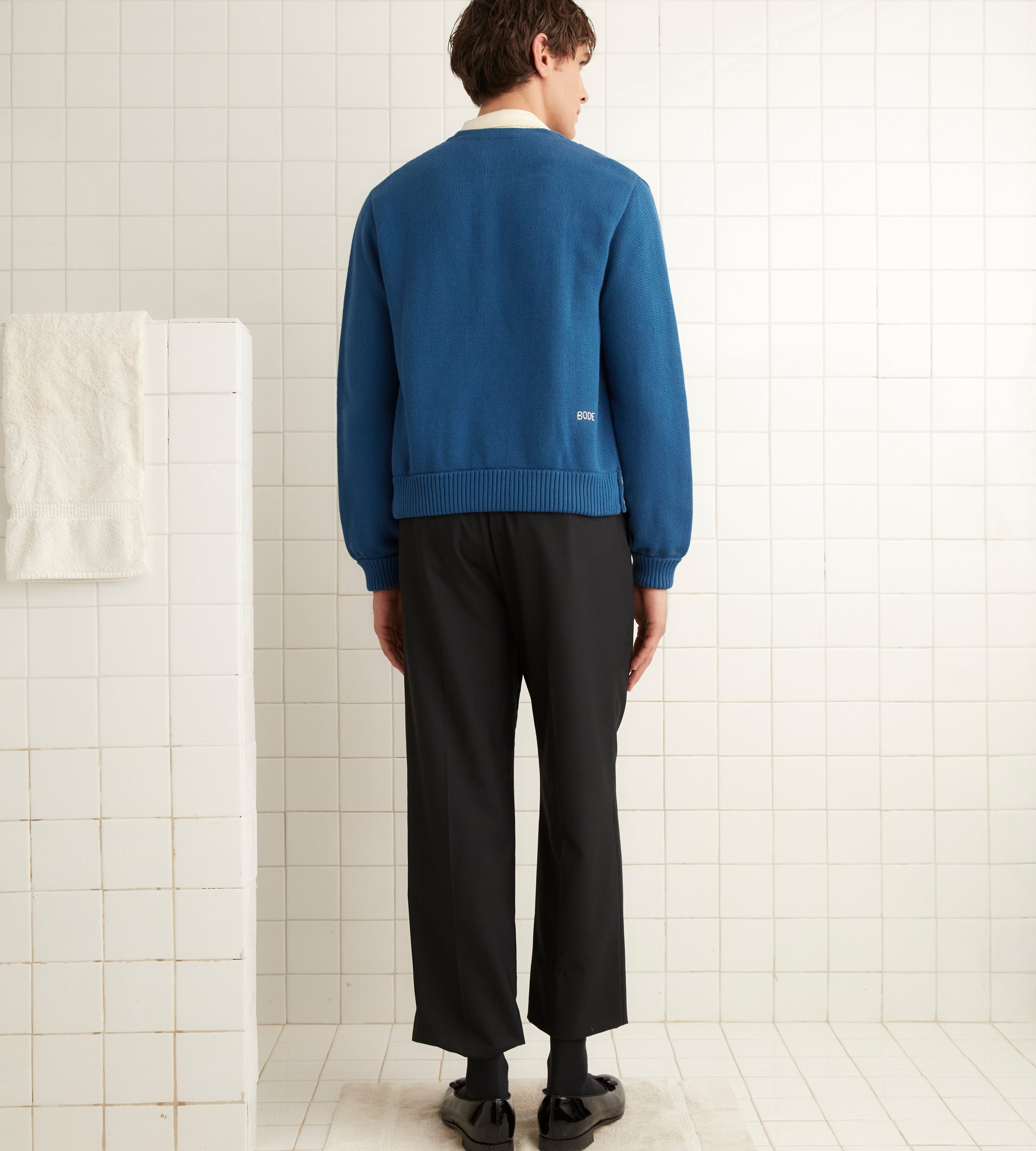 This cardigan is a core Bode style, inspired by a golf cardigan from the 1960s. We reproduced the original silhouette for this season. The sweater features a hand-embroidered “Bode” on the back.