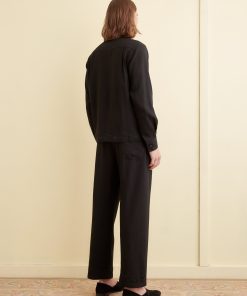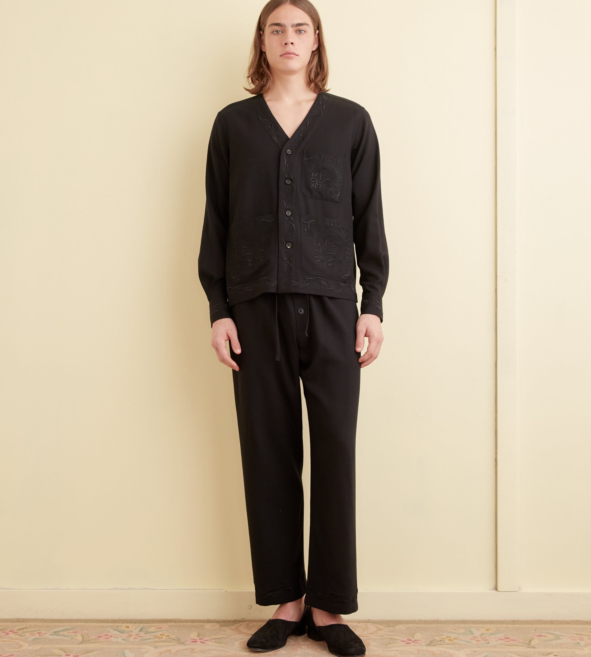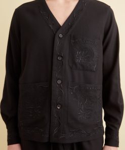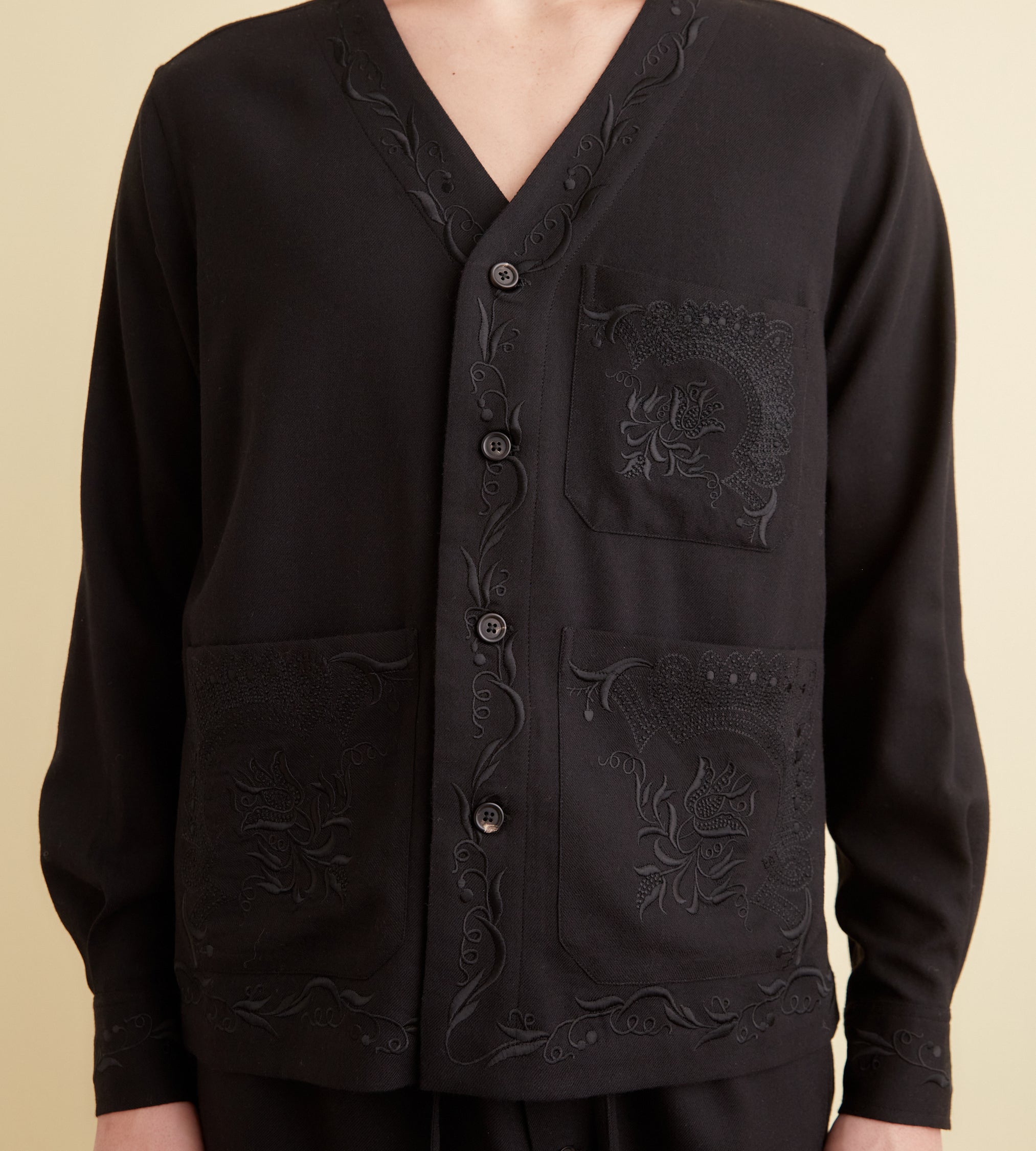 This shirt is inspired by an embroidered tablecloth from the early 20th century. We reproduced the tonal black embroidery along the placket and front pockets. The collarless silhouette is taken from a midcentury workwear style, likely something meant to be worn as a shop jacket over a collared shirt.