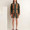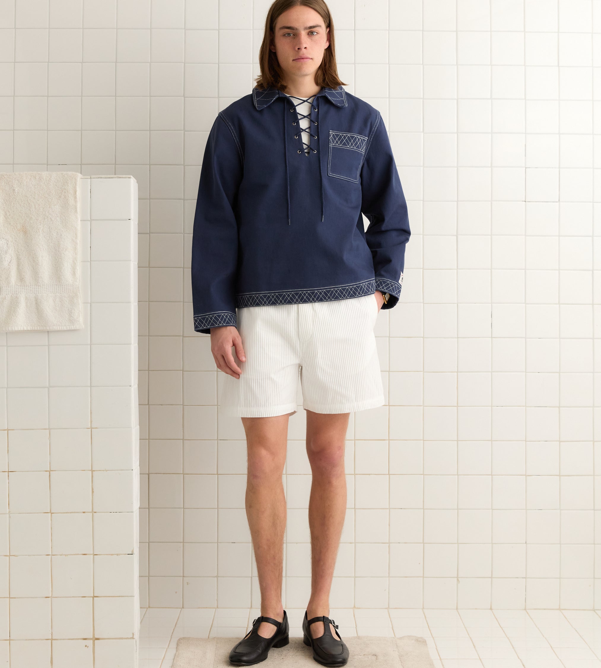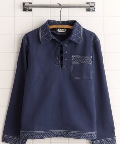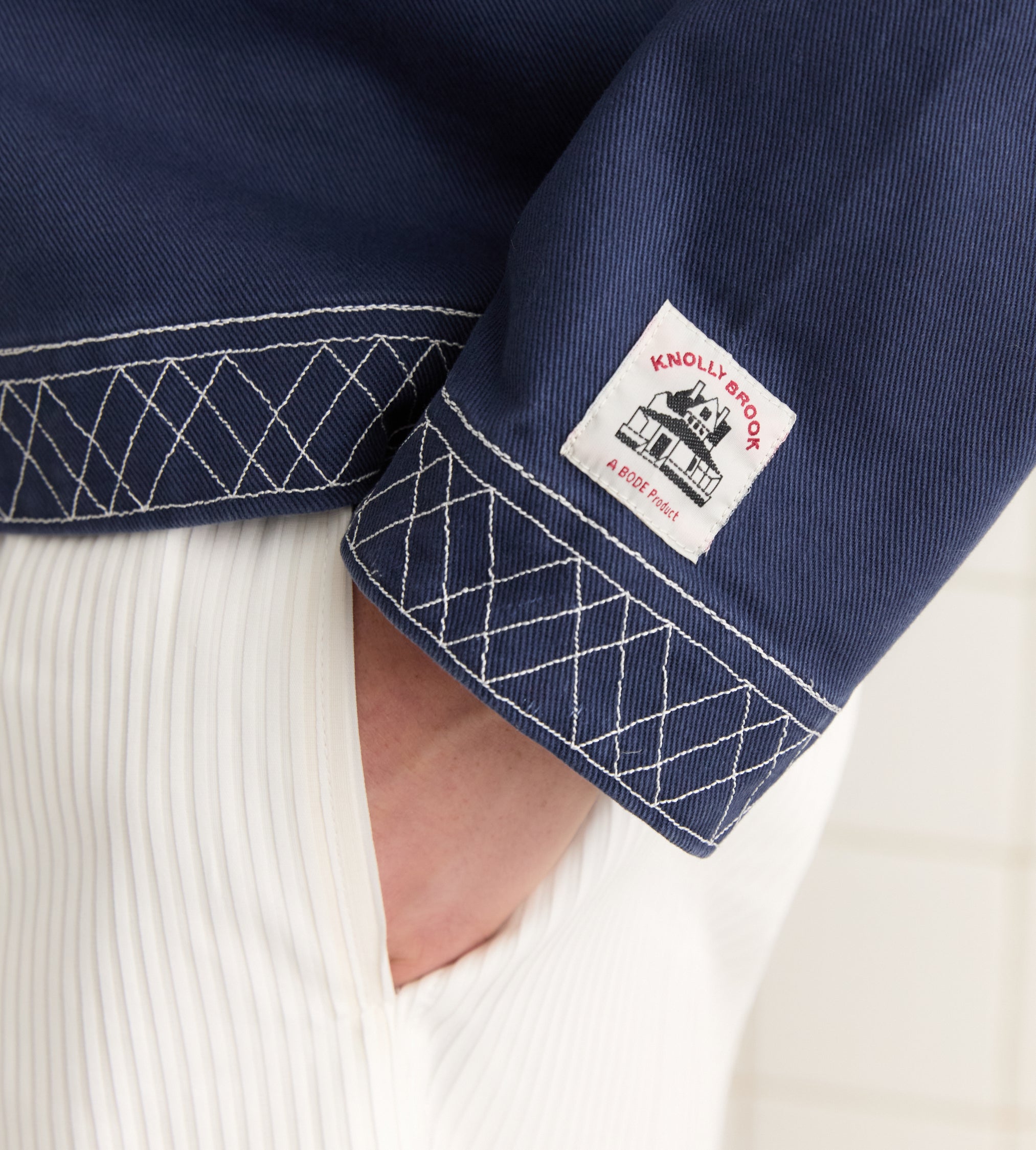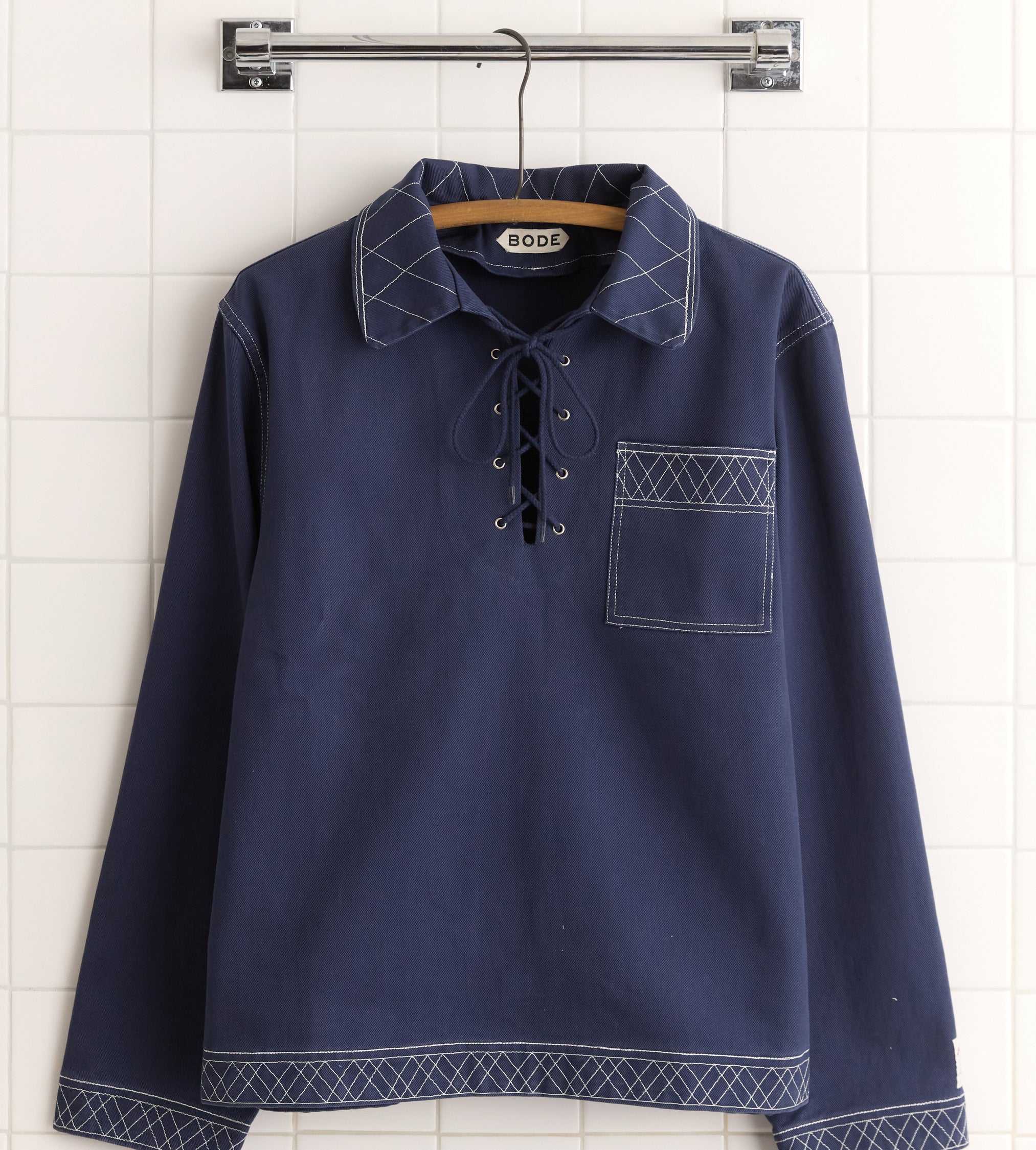 This pullover is based on a vintage smock from Emily’s collection. We reproduced the geometric embroidery around the collar, cuffs, and hem. The pullover features a lace-up neckline and a “Knolly Brook, a Bode Product” label on one sleeve.