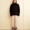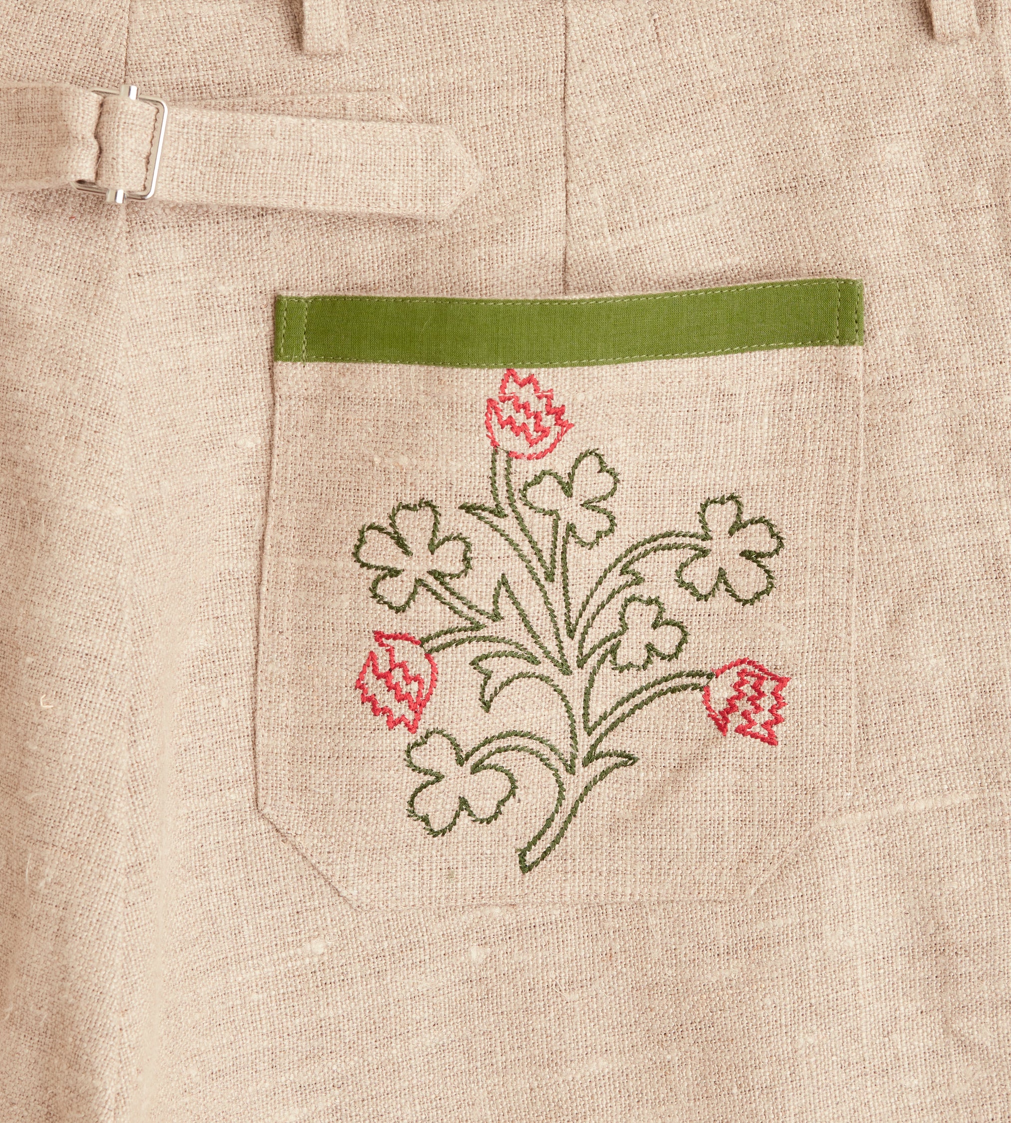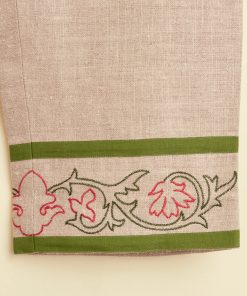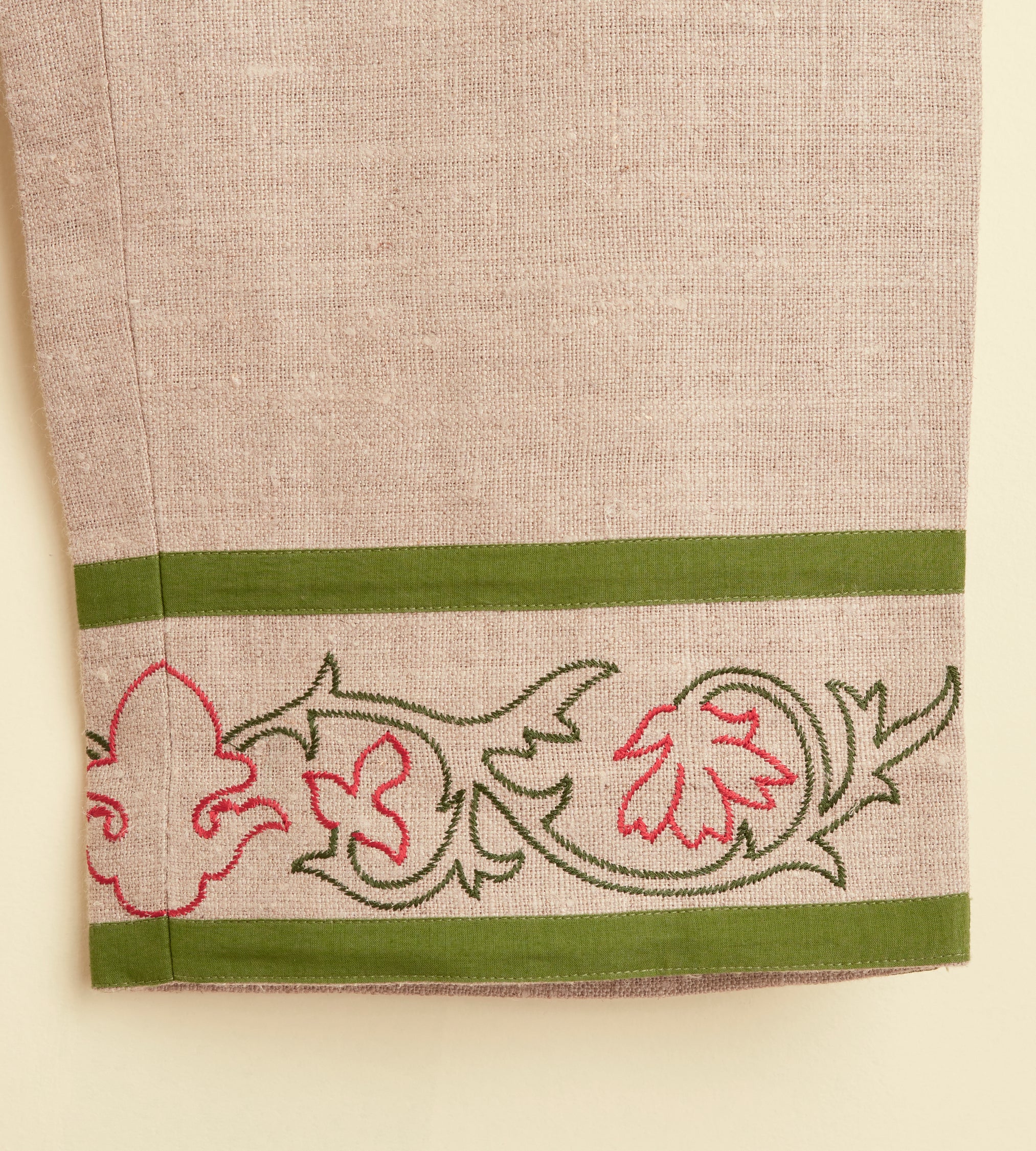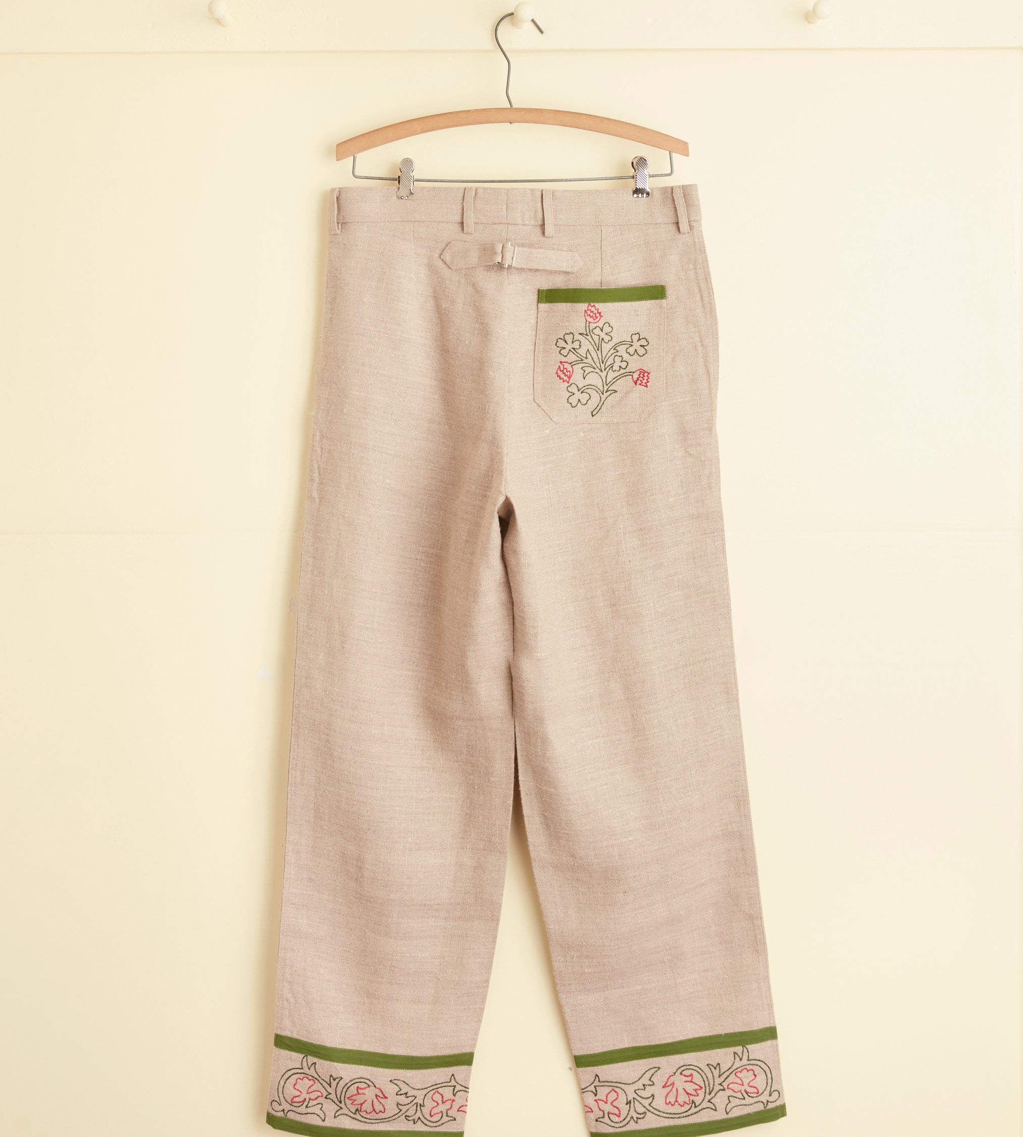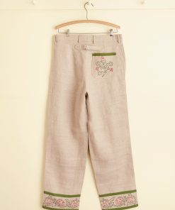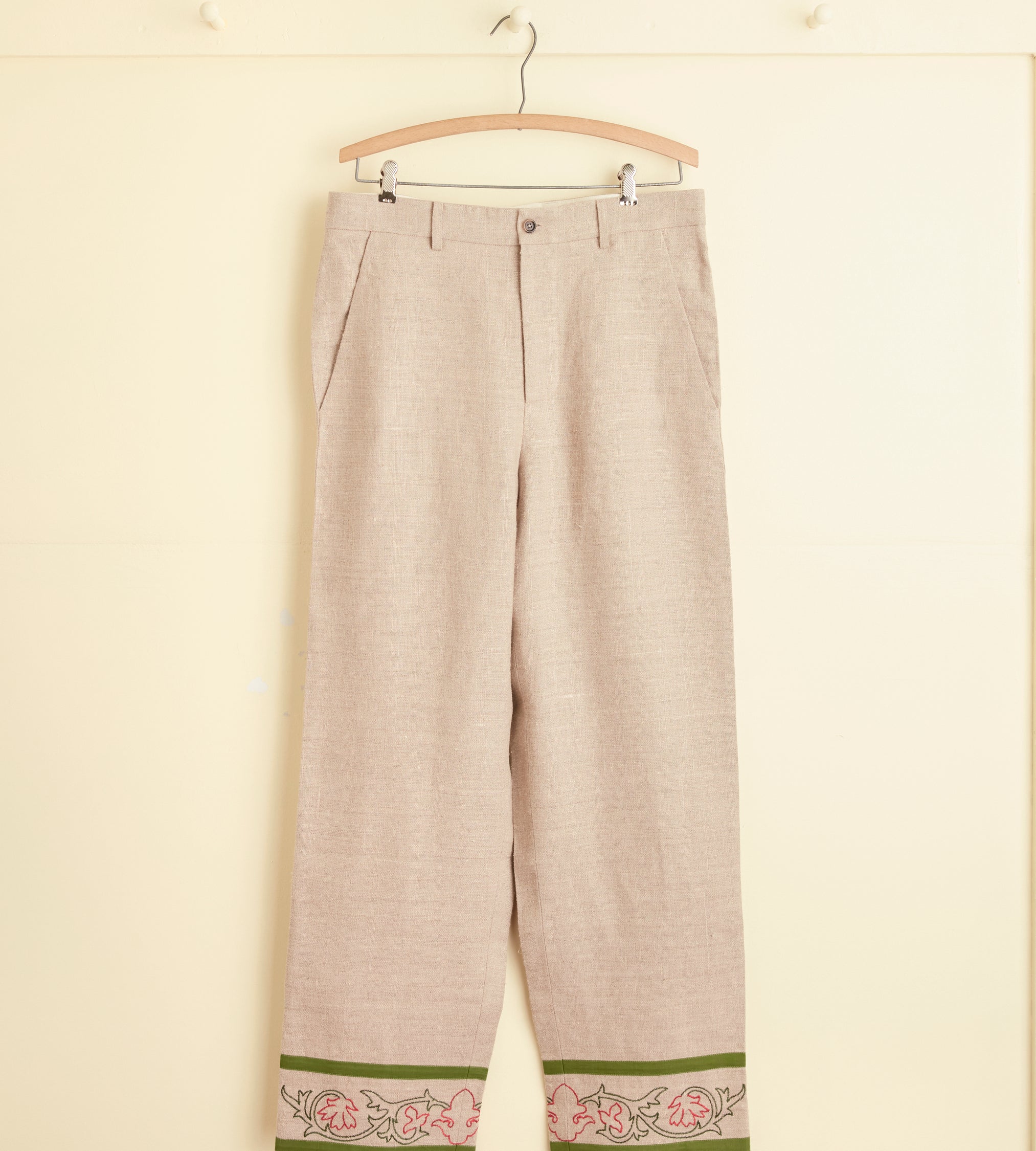 These trousers are inspired by an embroidered Victorian travel bag, circa 1860s-1890s. We reproduced the fabric and floral embroidery along the hem. The trousers are cut with a mid-rise and a wide leg.