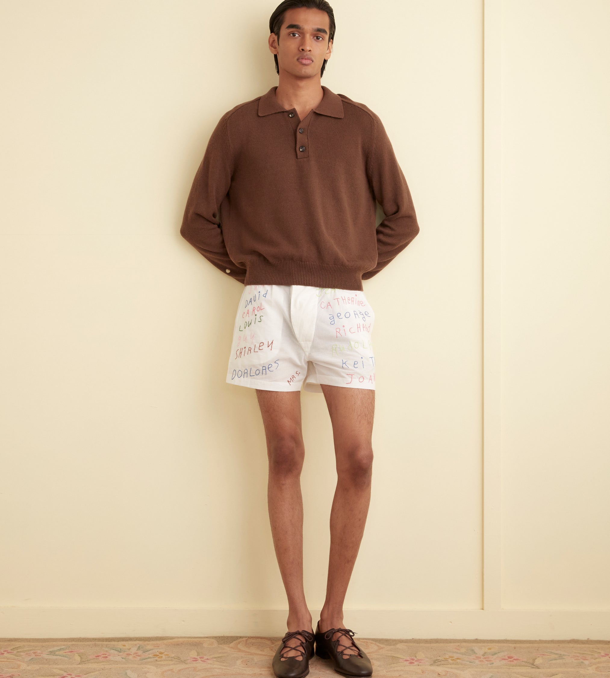 These boxers are inspired by an embroidered autograph apron from 1948. The apron was signed by all the students in a class and each signature was embroidered in different-colored thread. We reproduced the autographs for this style.
