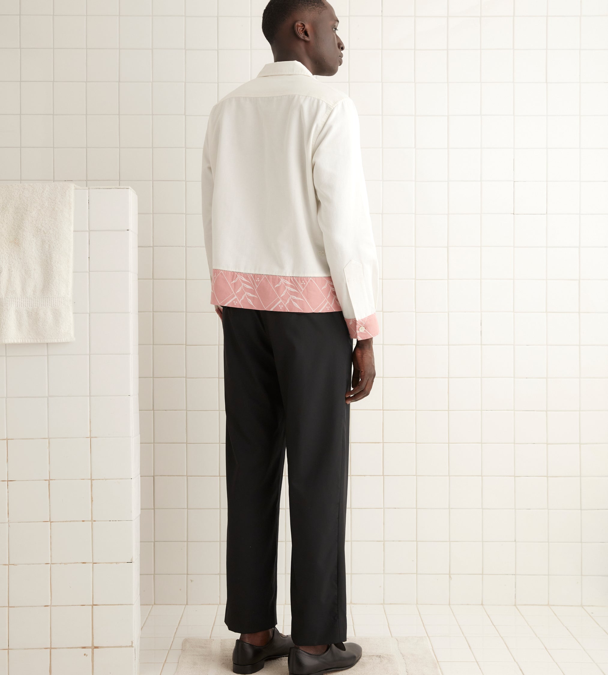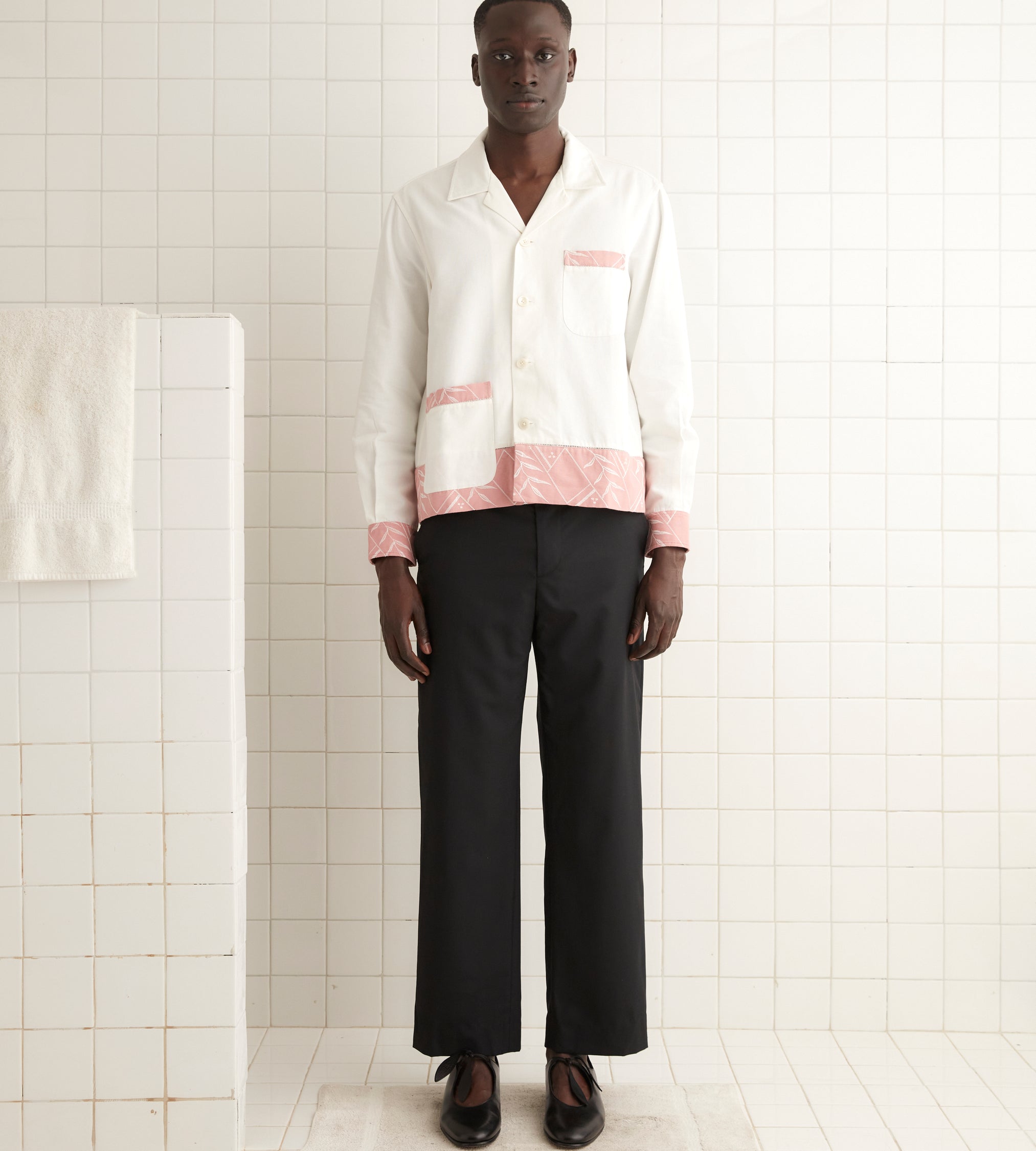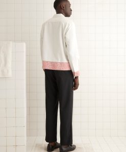 This shirt is inspired by a 1920s pillowcase. We reproduced the fabric, with its pink trim embroidered with a geometric fern pattern, for this style. This shirt features ladderwork detailing near the hem.