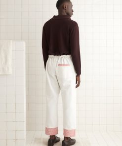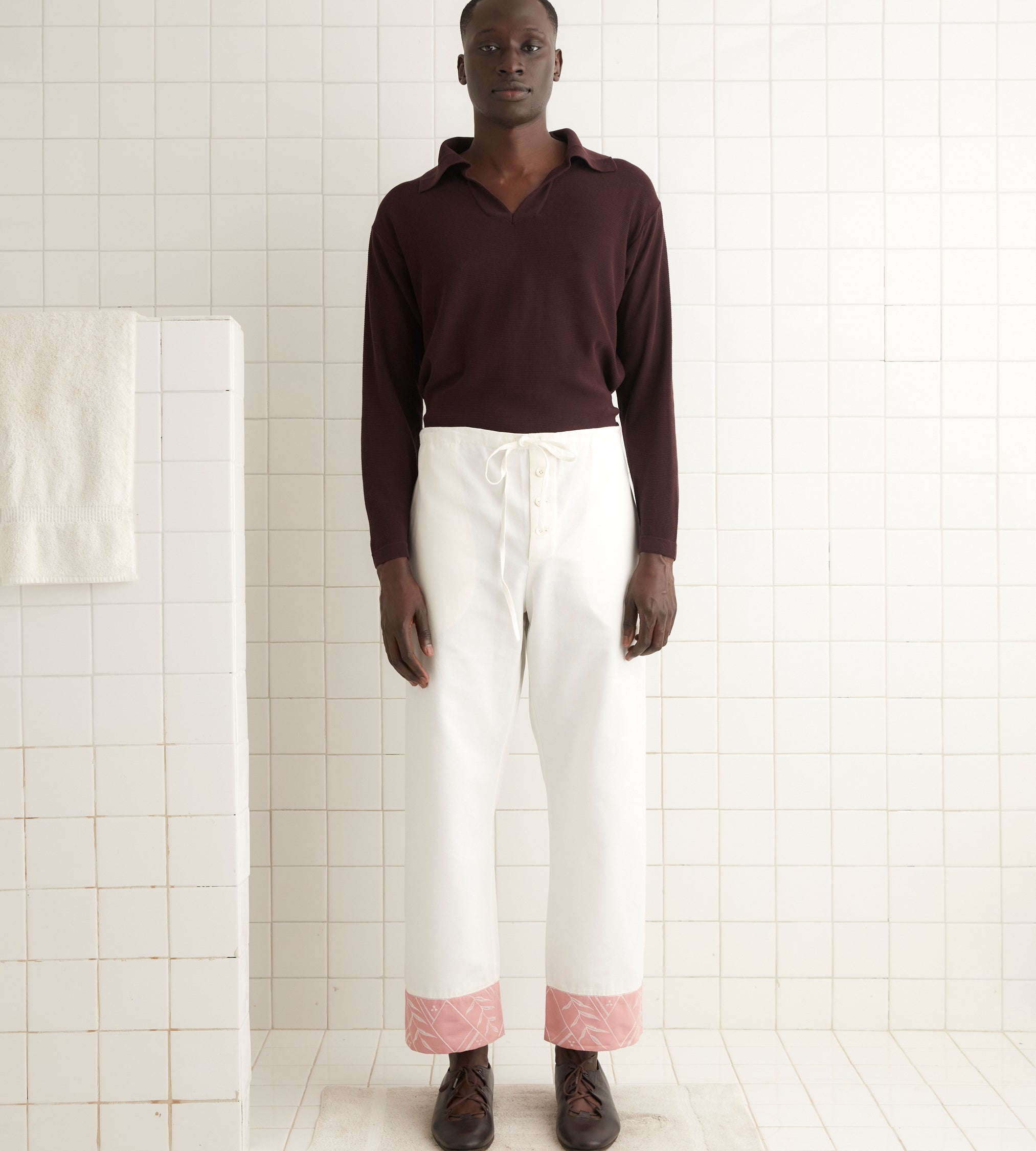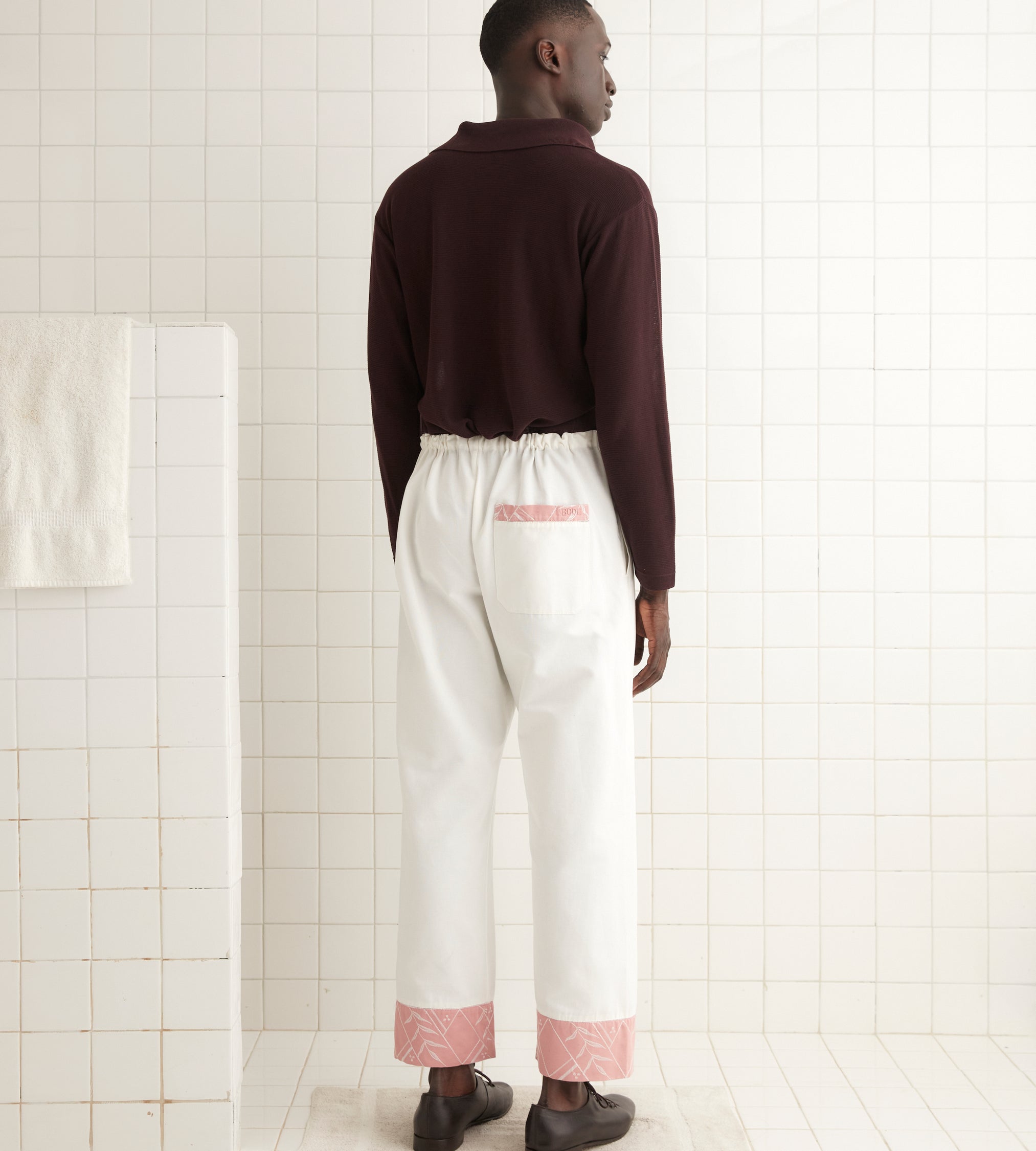 These trousers are inspired by a 1920s pillowcase. We reproduced the fabric, with its pink trim embroidered with a geometric fern pattern, for this style.