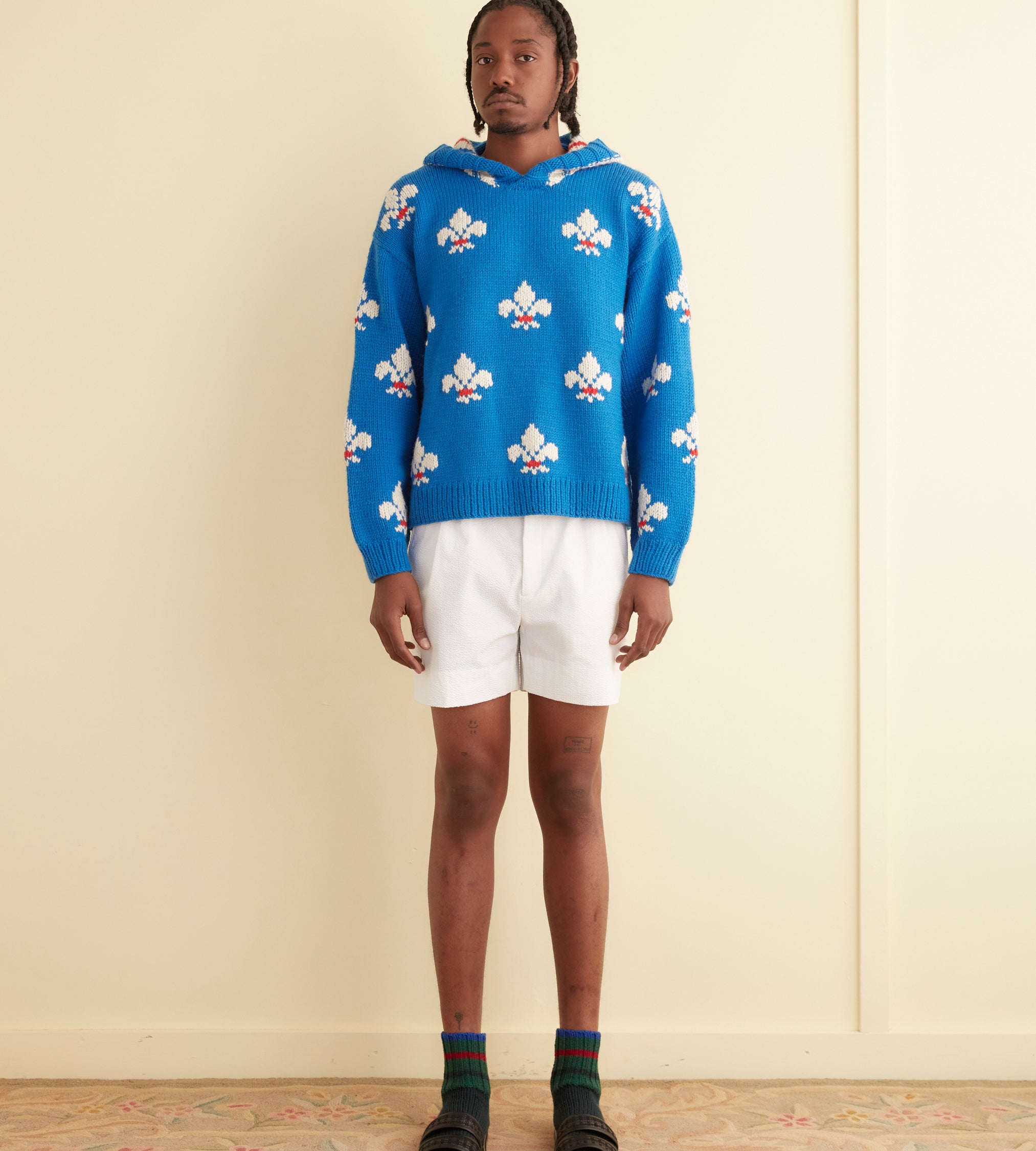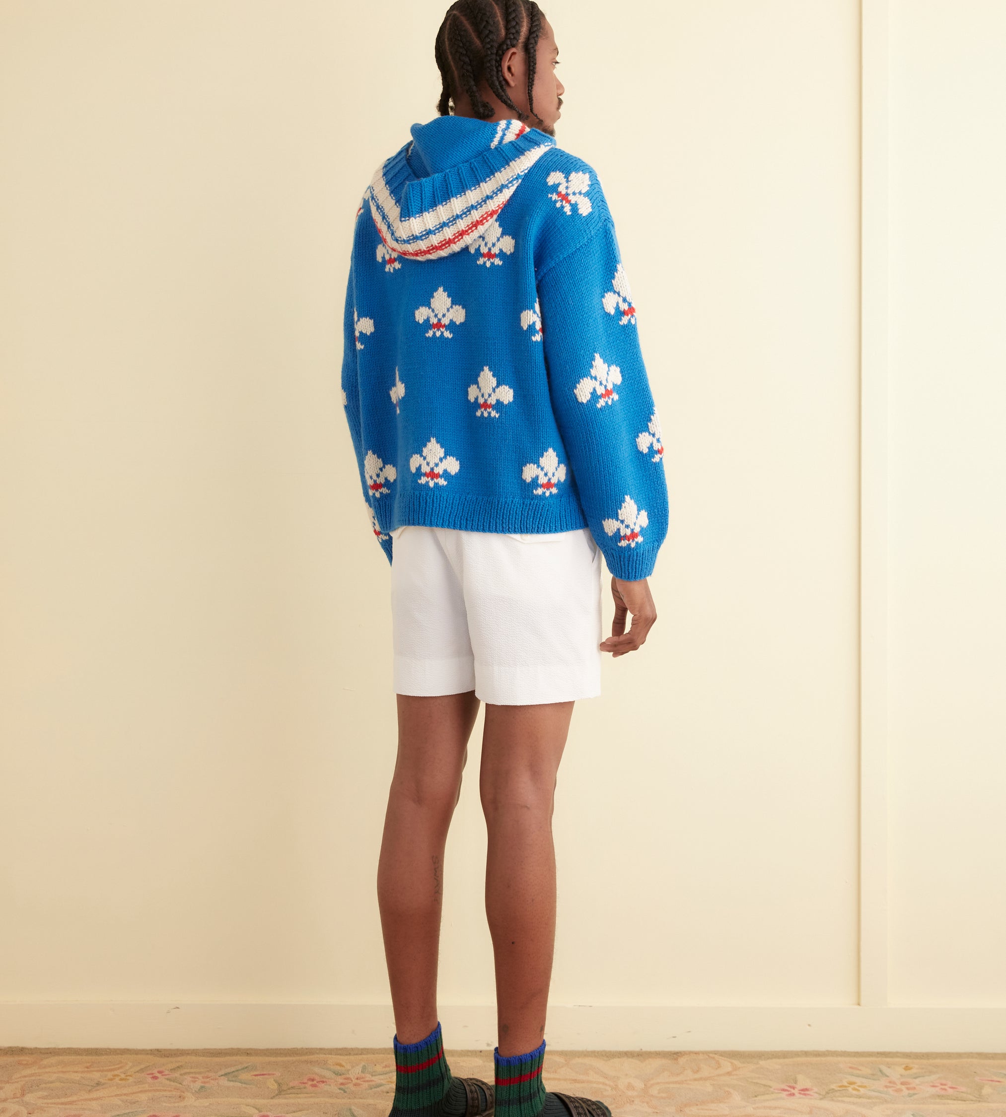This knit is inspired by a hooded sweater from the 1970s. The original sweater likely came from a DIY kit, which were widespread throughout the 1960s and 1970s, especially for crochet and knitting patterns. We replicated its electric blue fleur-de-lis pattern on this hand-knit jacquard hoodie.