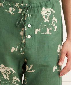 These pajama pants are inspired by a scrap of fabric from the 1930s. We recreated the pattern with images of football players for this style, which is cut according to a classic pajama pant silhouette.