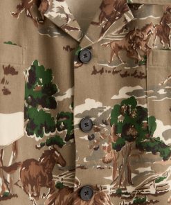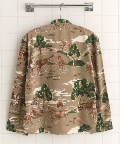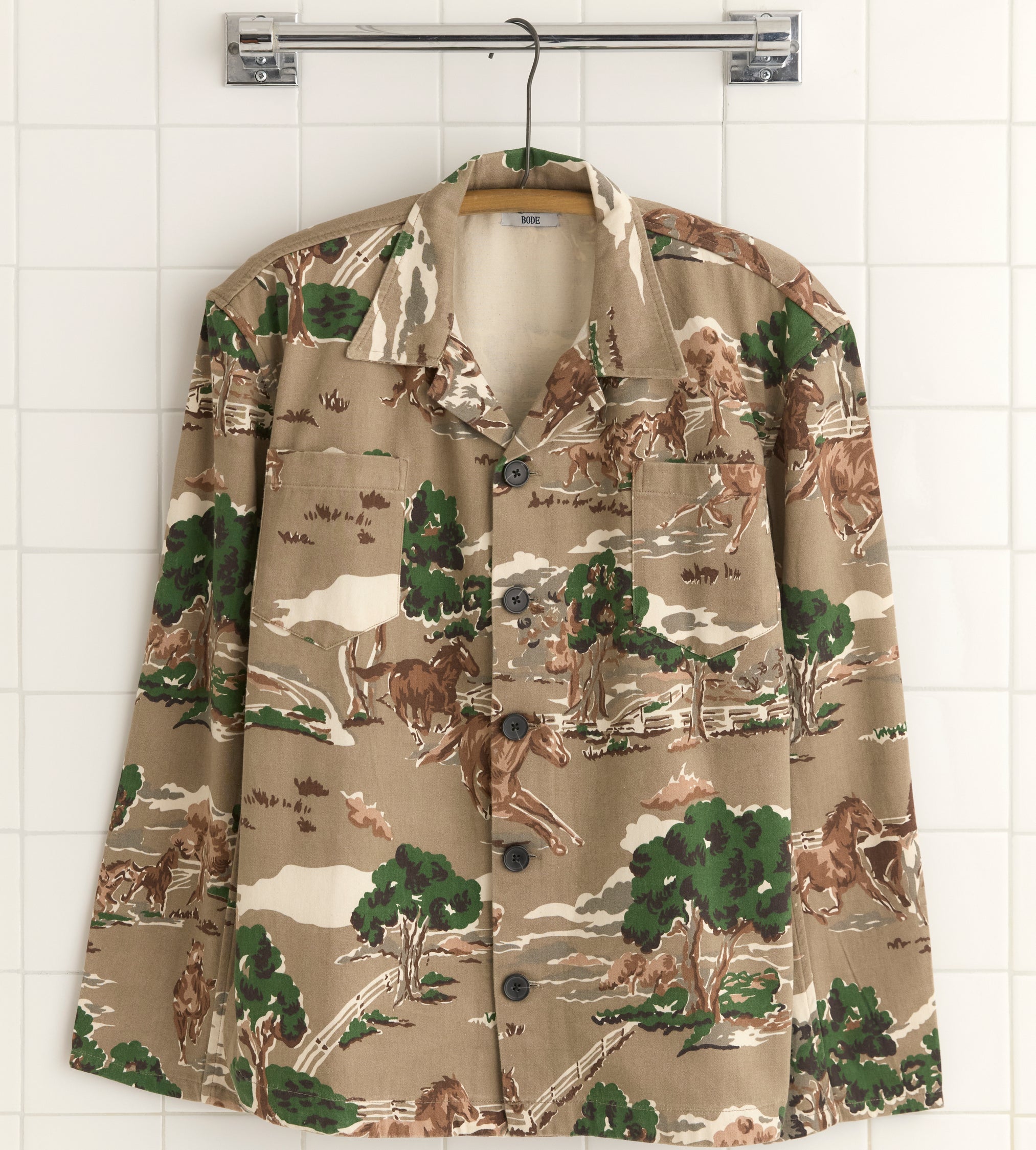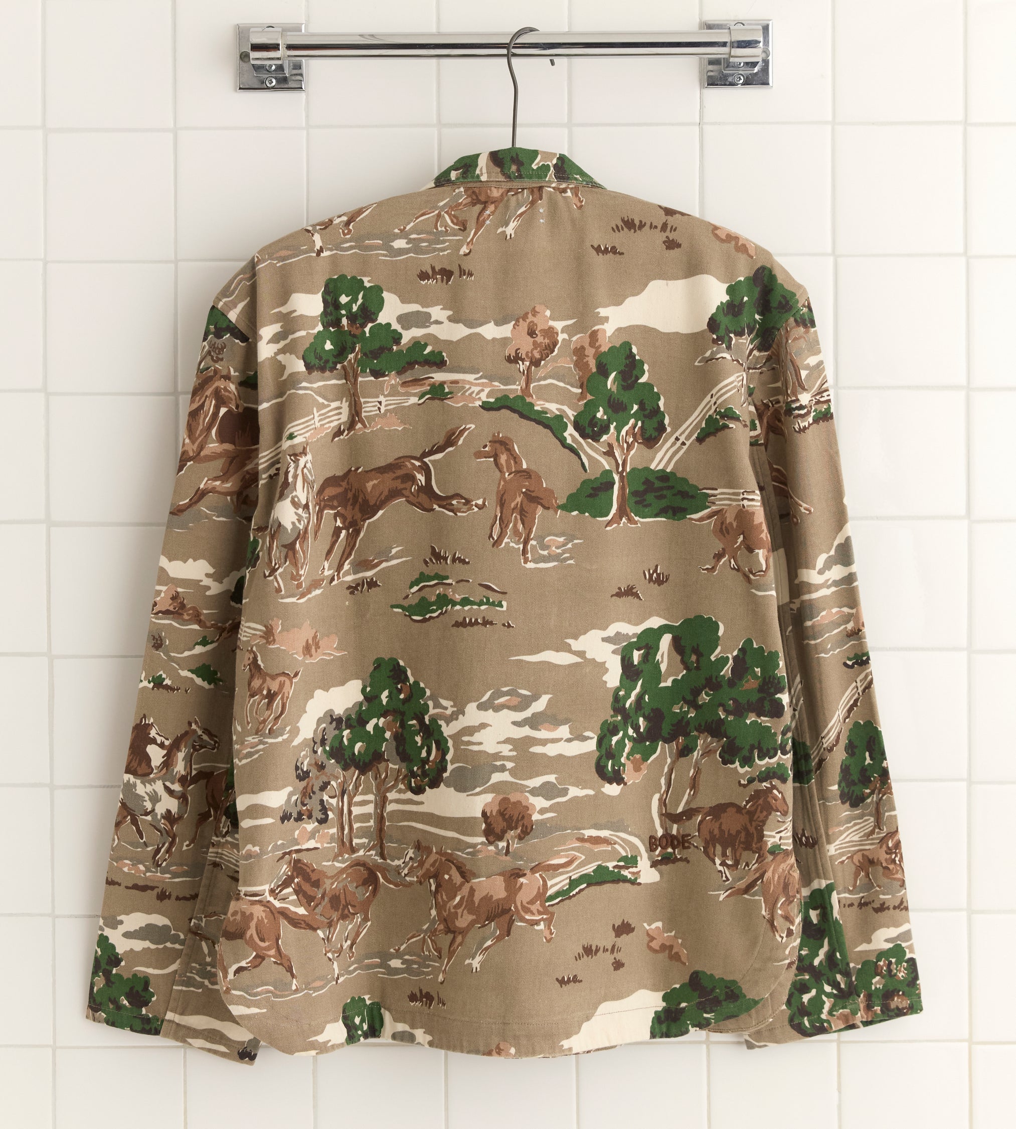 This overshirt is inspired by deadstock yardage originally used for curtains and upholstery, circa 1950s. We reproduced the horse-patterned fabric for this style.