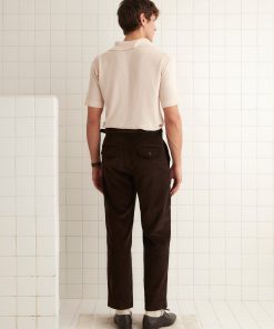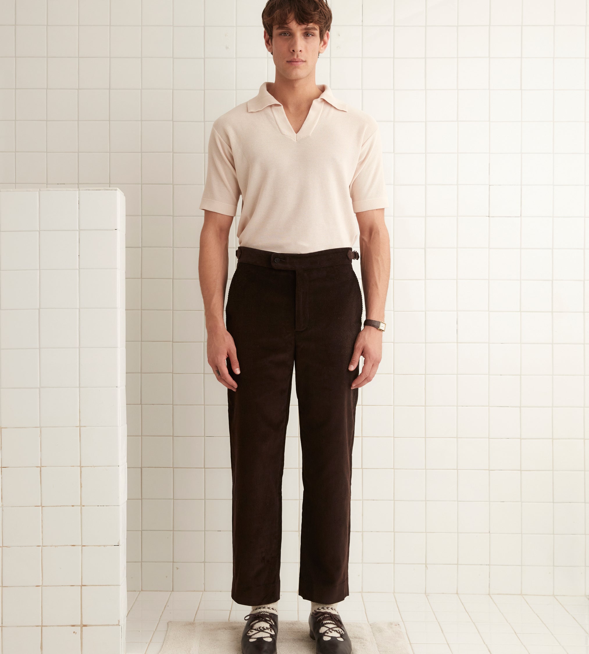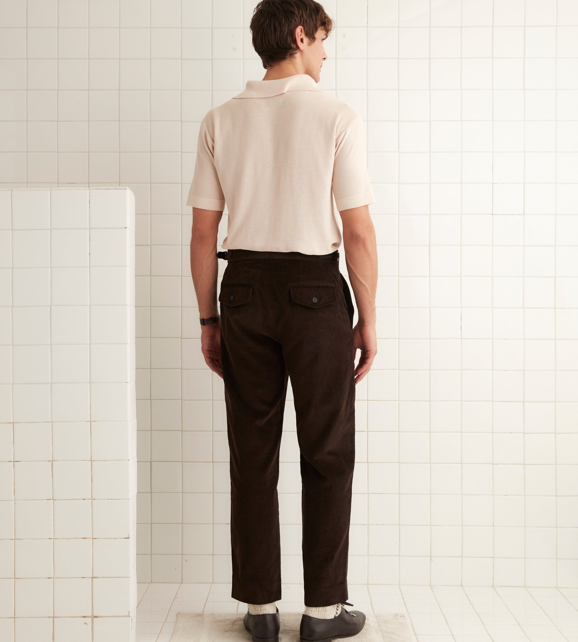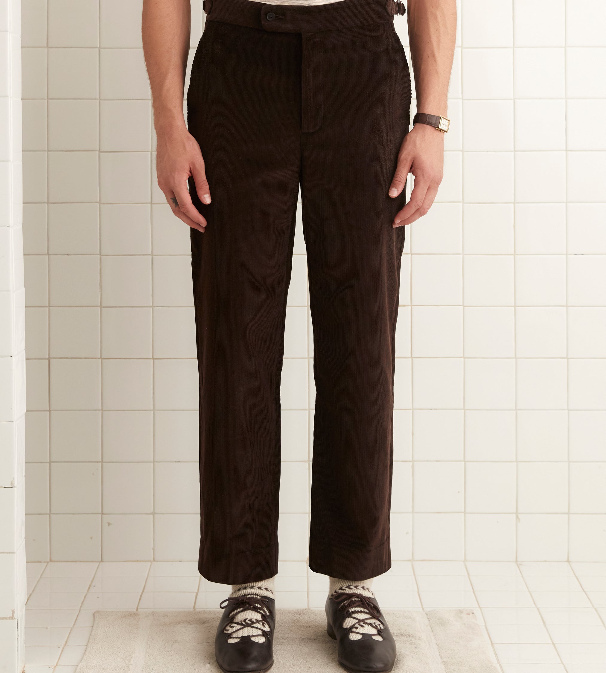These trousers are made from vintage corduroy from the late 20th century, a dark brown with standard wales. They are cut in a classic men’s trousers silhouette, with a mid-rise and a straight leg