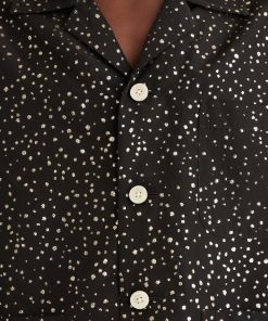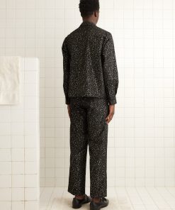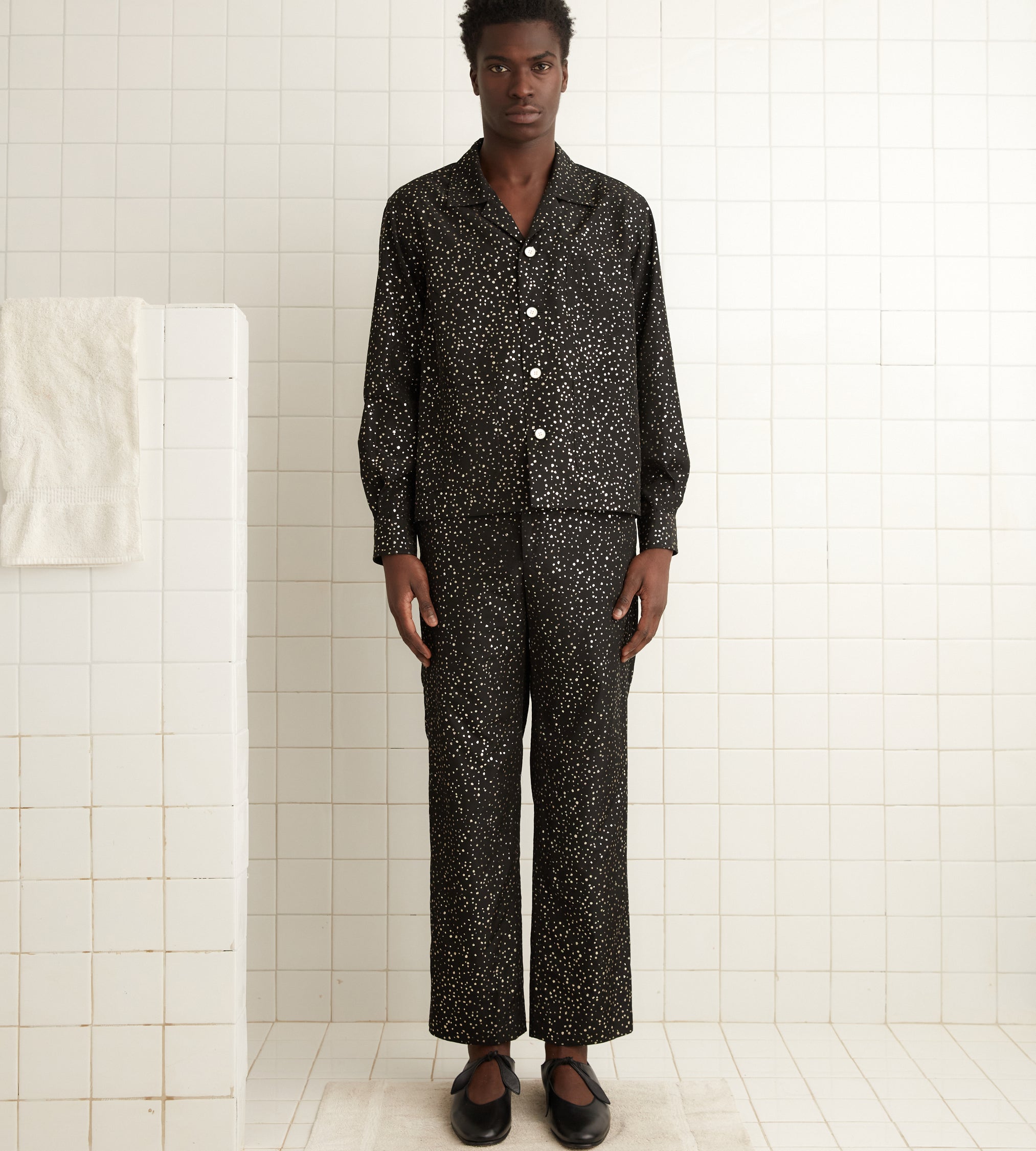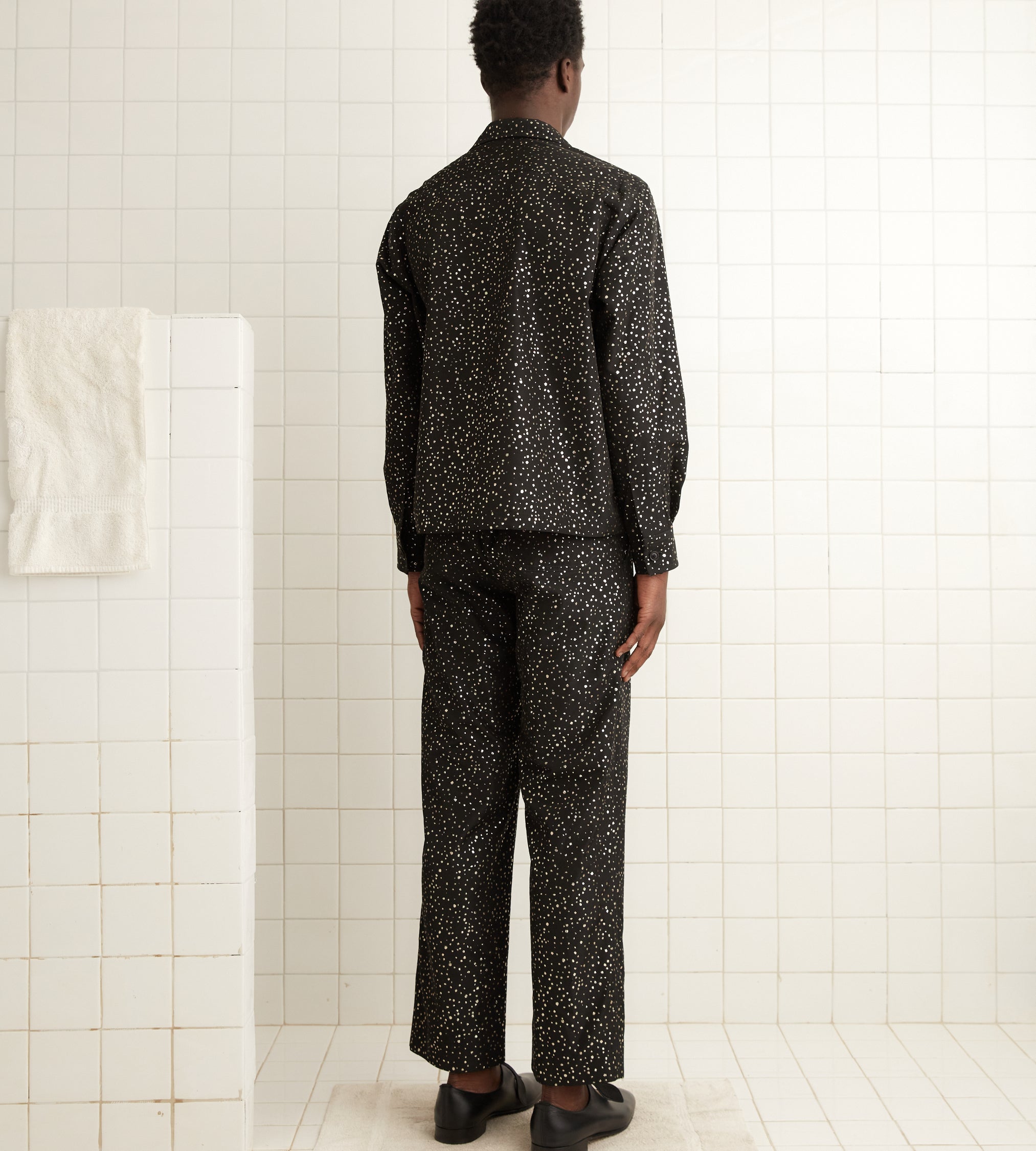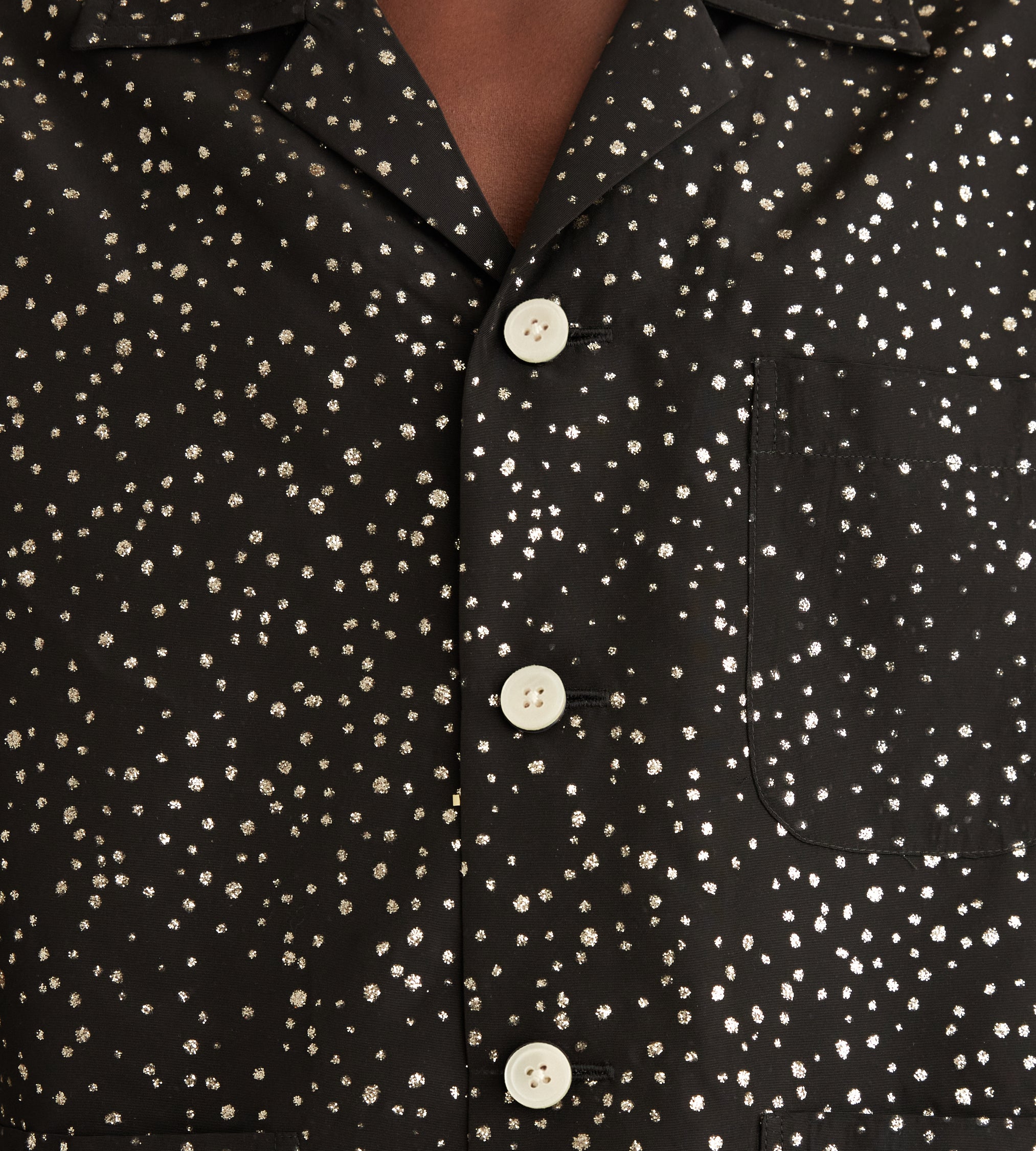 This shirt is cut in a silhouette inspired by midcentury workwear jackets. It is made from crisp faille and patterned with glitter dots.