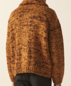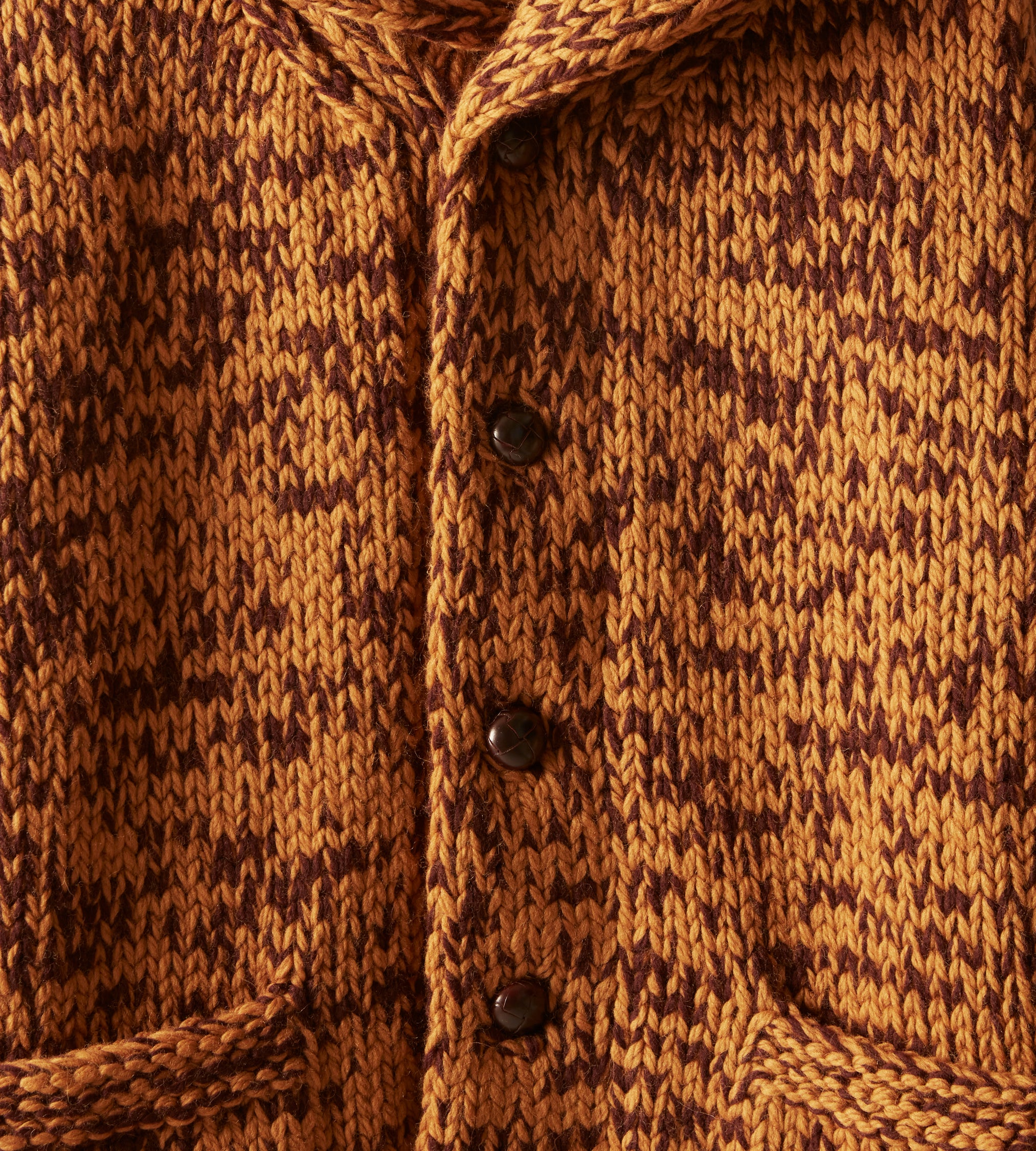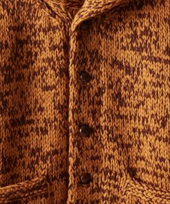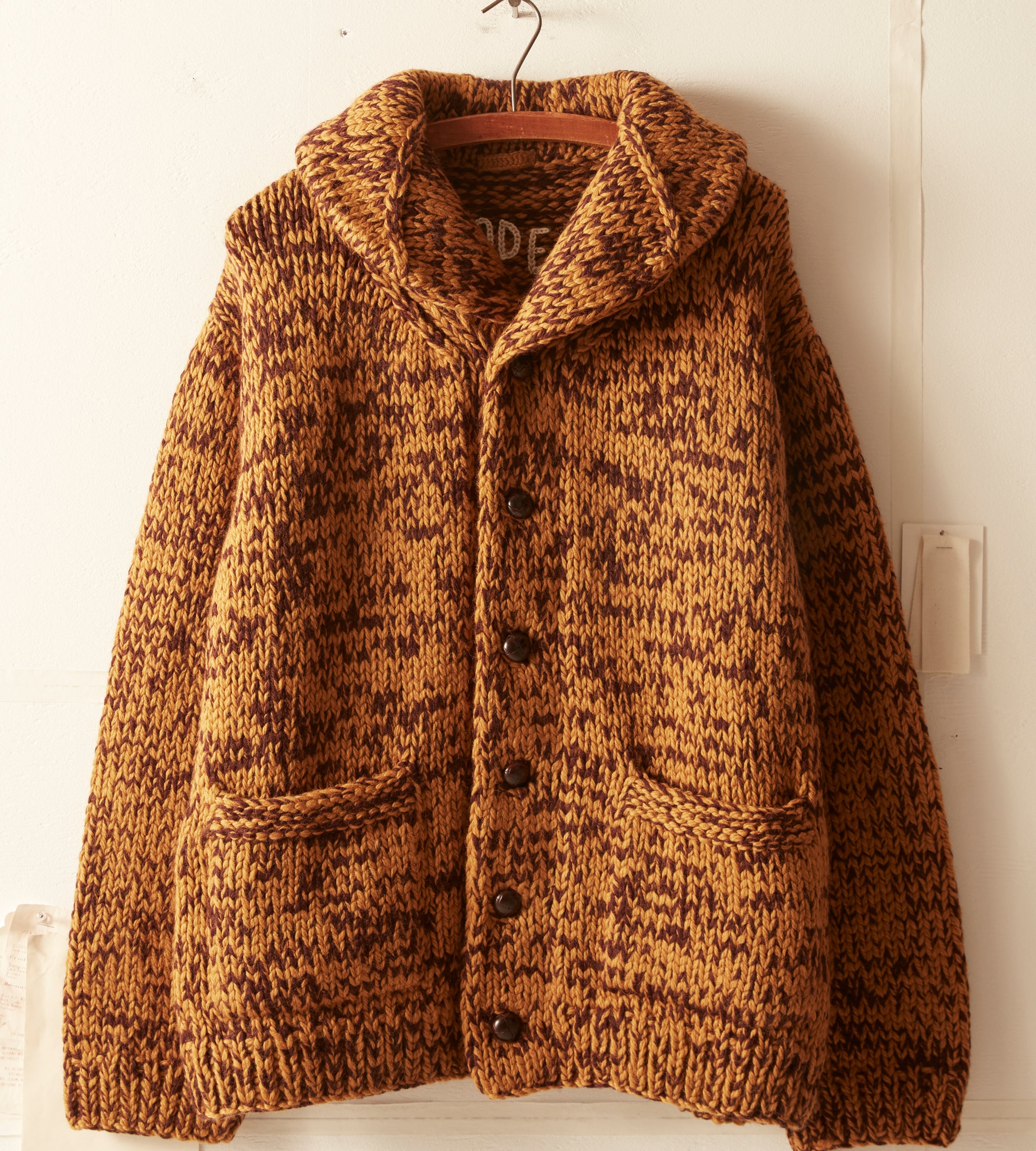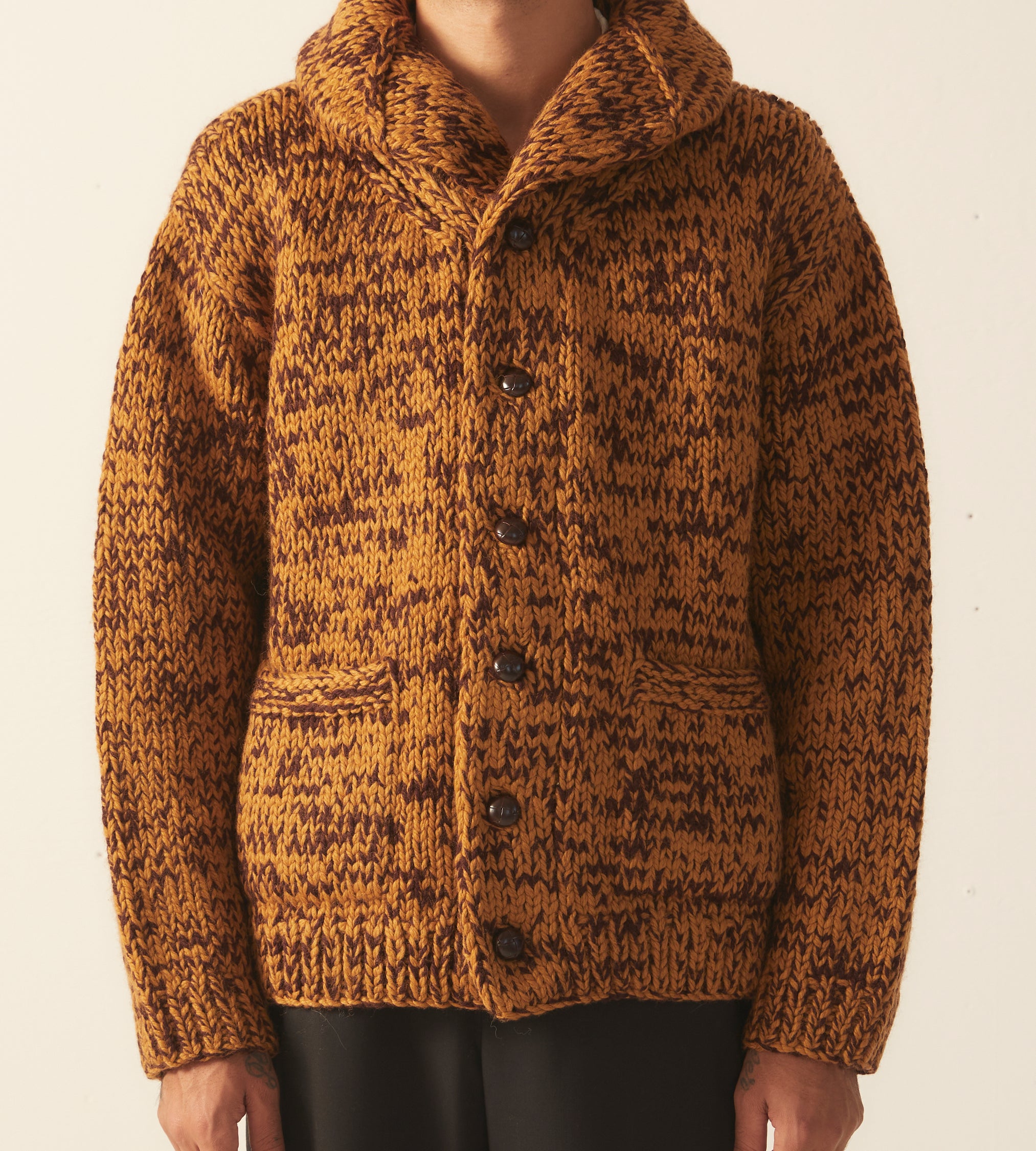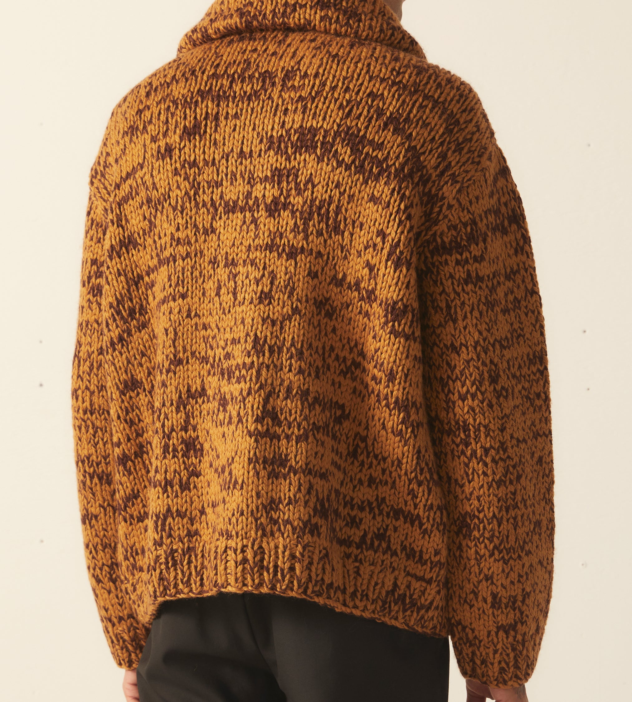 This cardigan is inspired by a children’s sweater from the 1970s. It is a reproduction of a childhood cardigan that belongs to Emily’s friend. Like the original, this cardigan is knitted by hand.