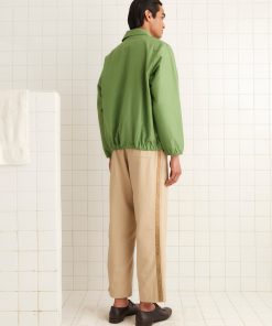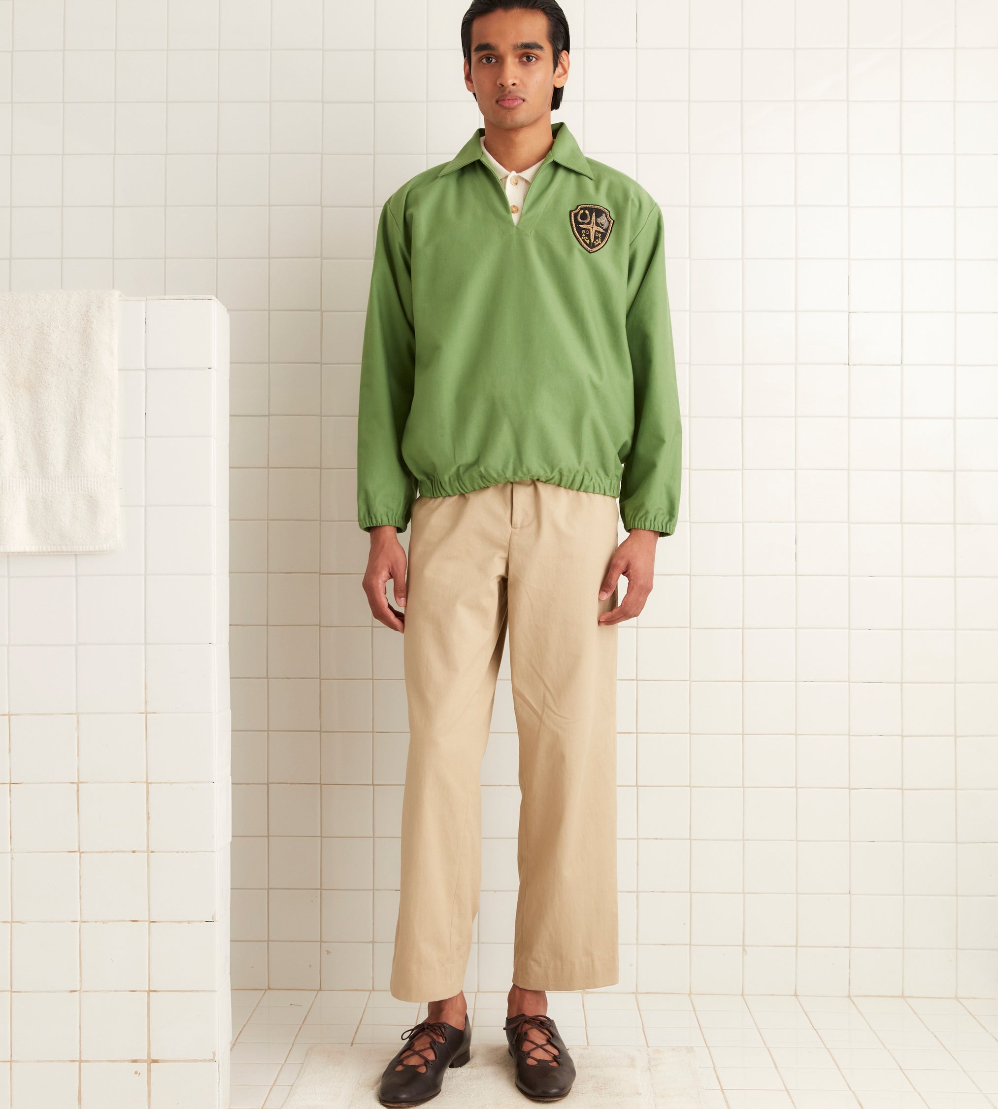 This style is inspired by a canvas pullover from the 1980s. We reproduced the silhouette, with its elasticated hem and cuffs, in midweight green cotton. The pullover is embellished with an embroidered bullion patch featuring a horse, horseshoe, and flowers.