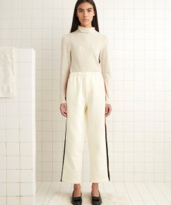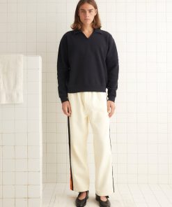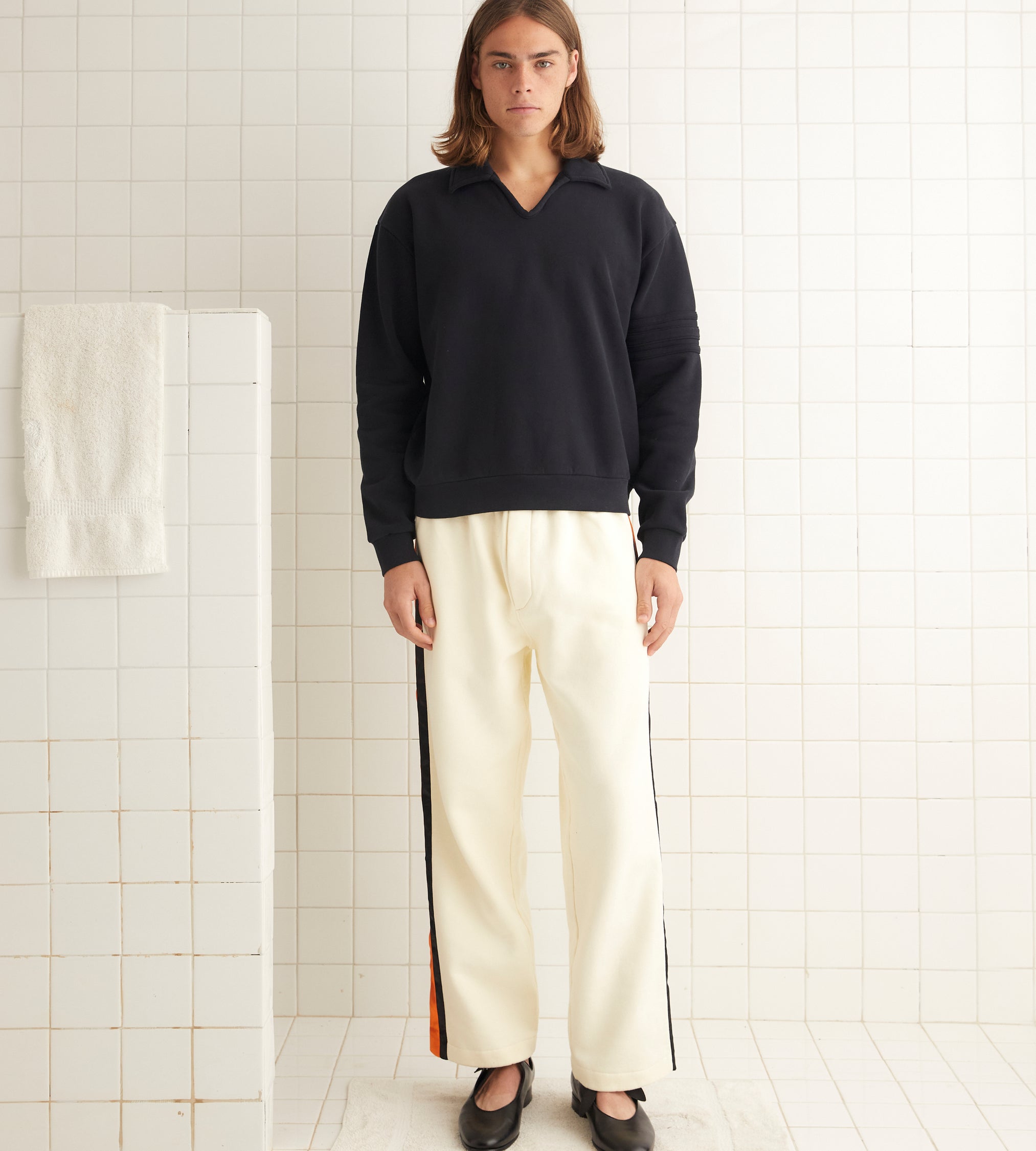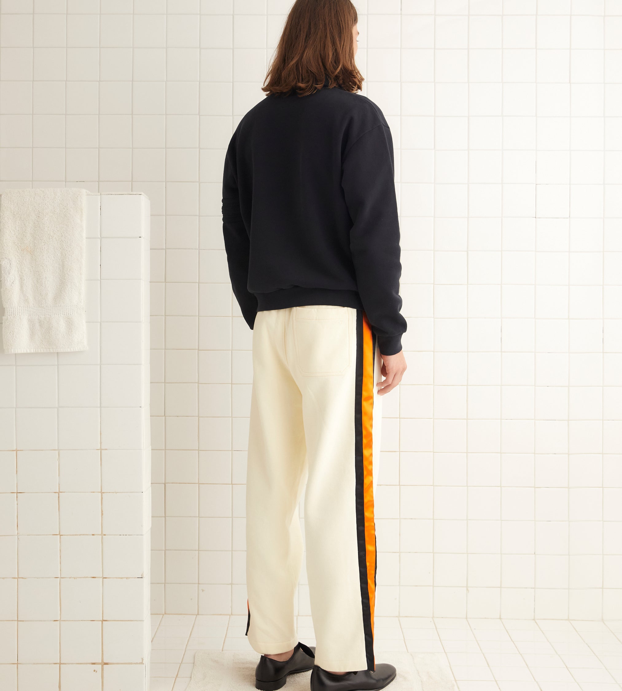 These sweatpants are inspired by a 1970s sweater from a college shop. We reproduced the original orange-and-black satin stripe down the side seams.