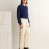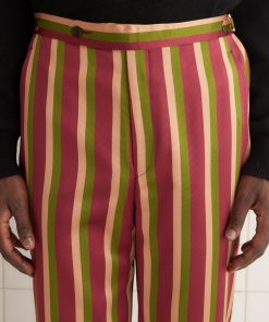 These trousers are inspired by Kutnu fabric. Kutnu is historically woven in Gaziantep in Southern Turkey. Rendered in satin with silk warp and cotton weft thread, this striped trouser is known for its distinctive shimmer. The silhouette is that of a traditional trouser—high rise, straight leg.