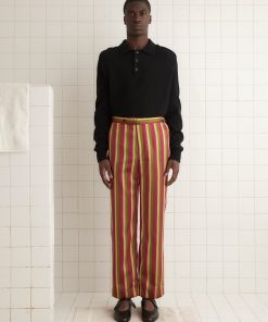 These trousers are inspired by Kutnu fabric. Kutnu is historically woven in Gaziantep in Southern Turkey. Rendered in satin with silk warp and cotton weft thread, this striped trouser is known for its distinctive shimmer. The silhouette is that of a traditional trouser—high rise, straight leg.