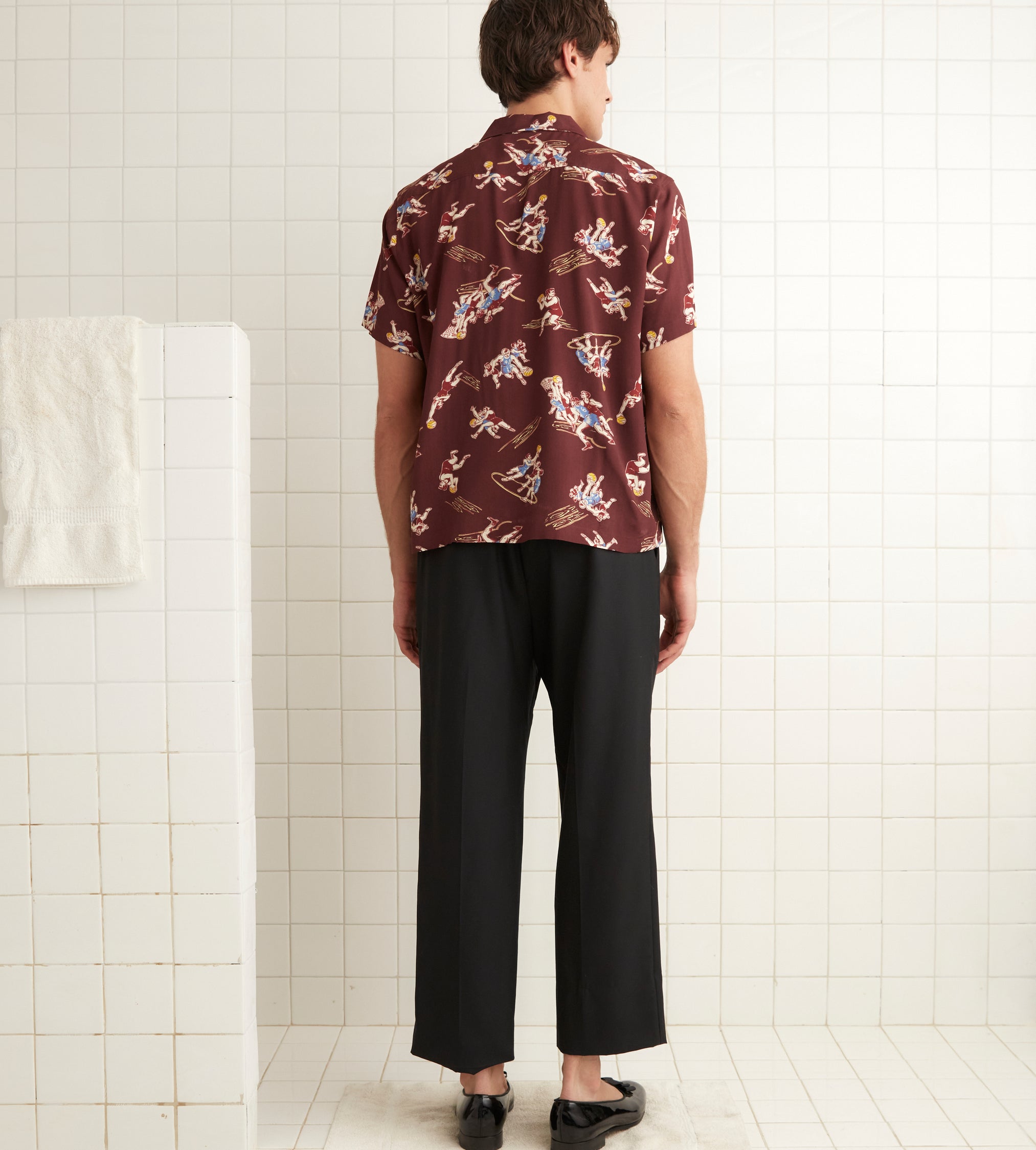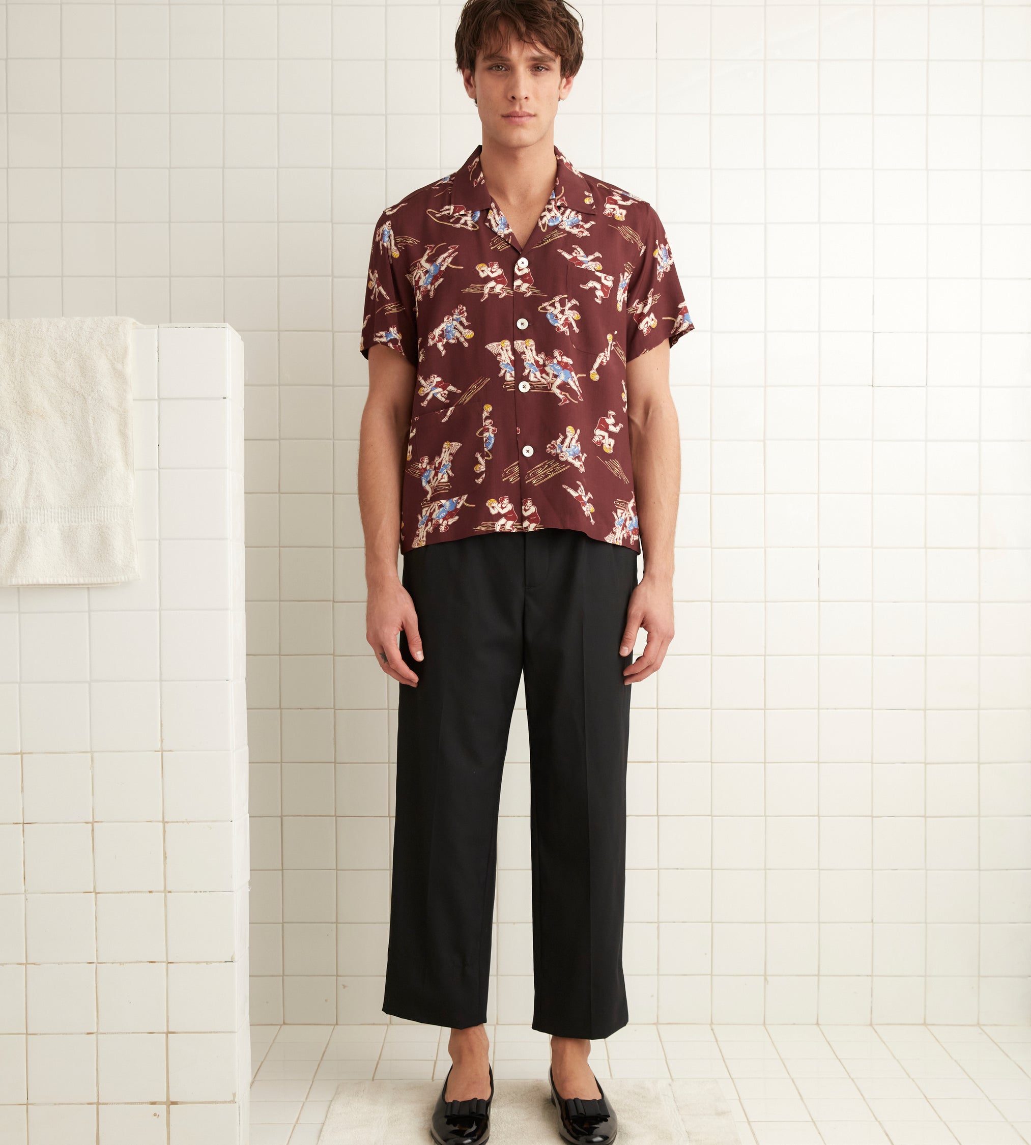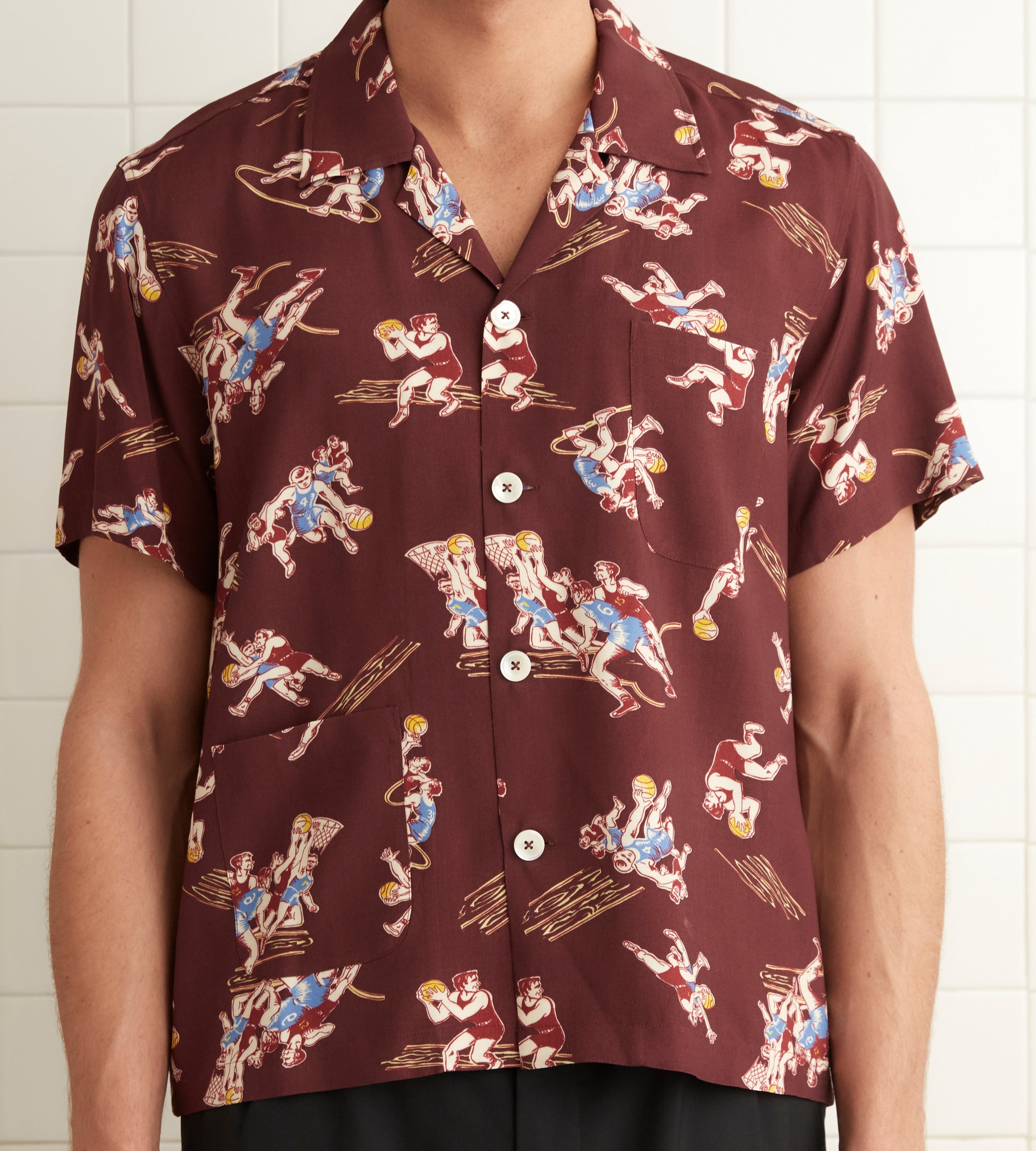 This shirt is inspired by a scrap of fabric from the 1940s-1950s, printed with a basketball player pattern. We reproduced the fabric for this style.