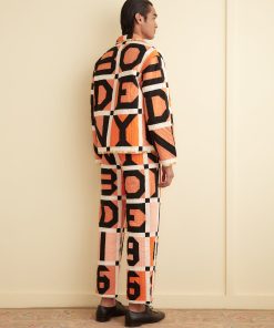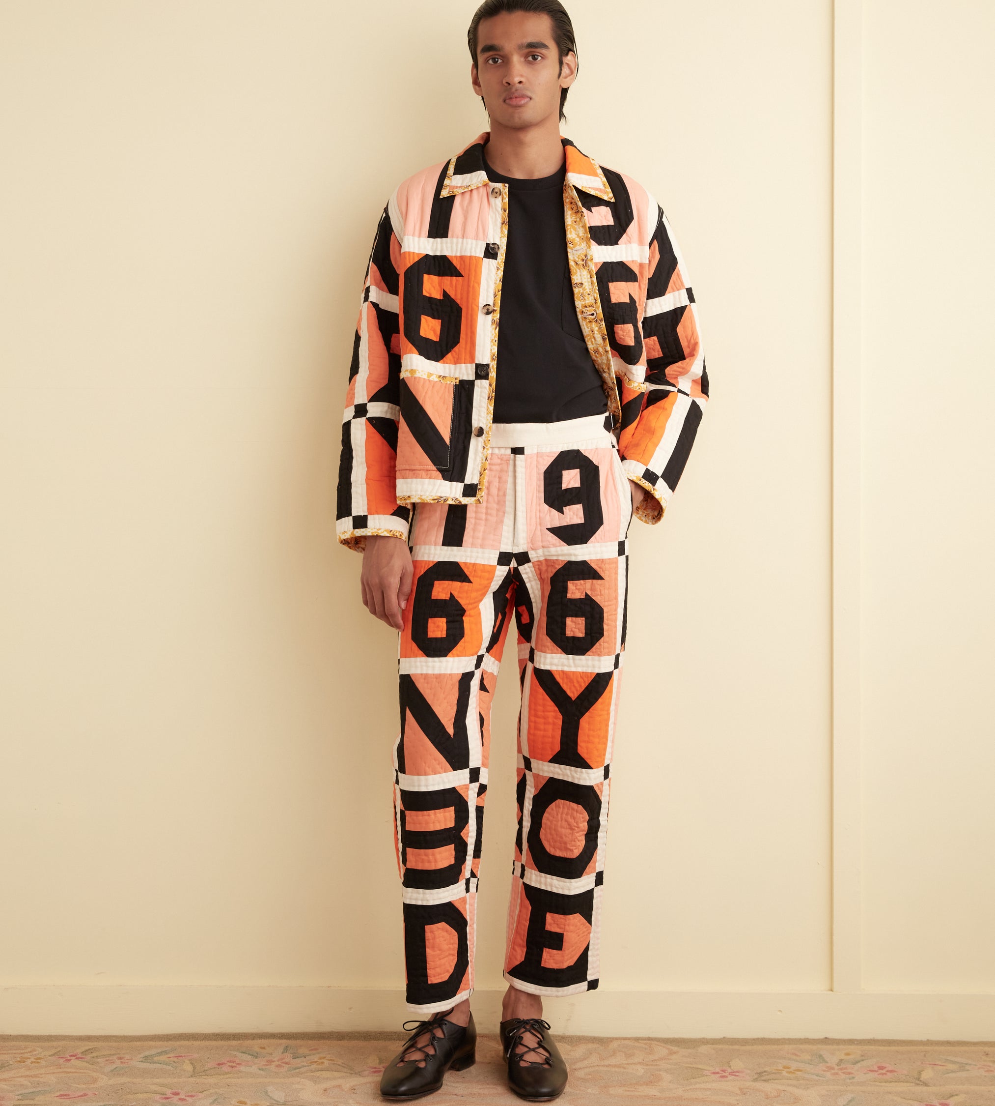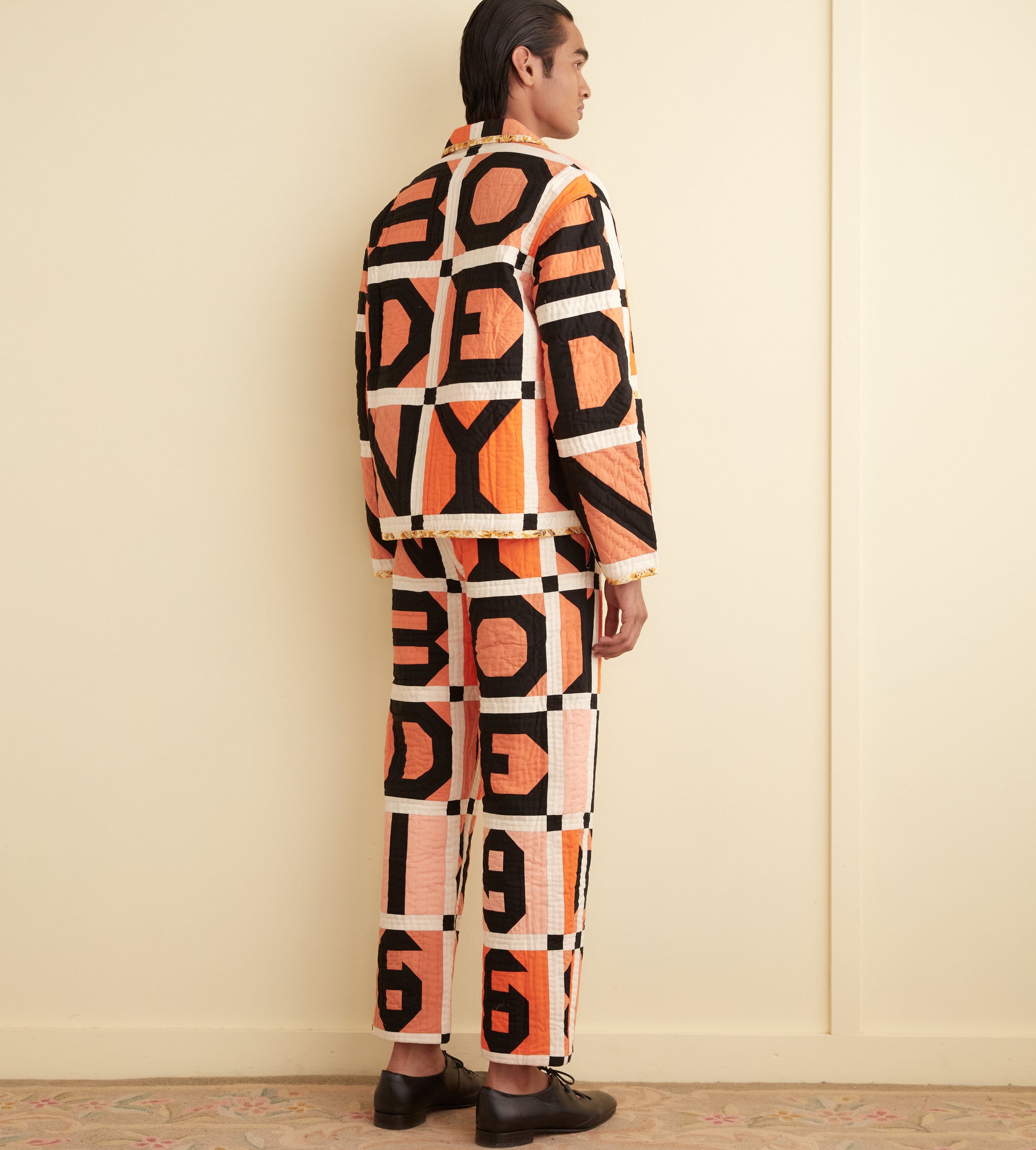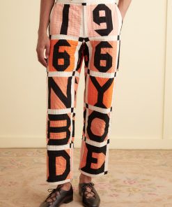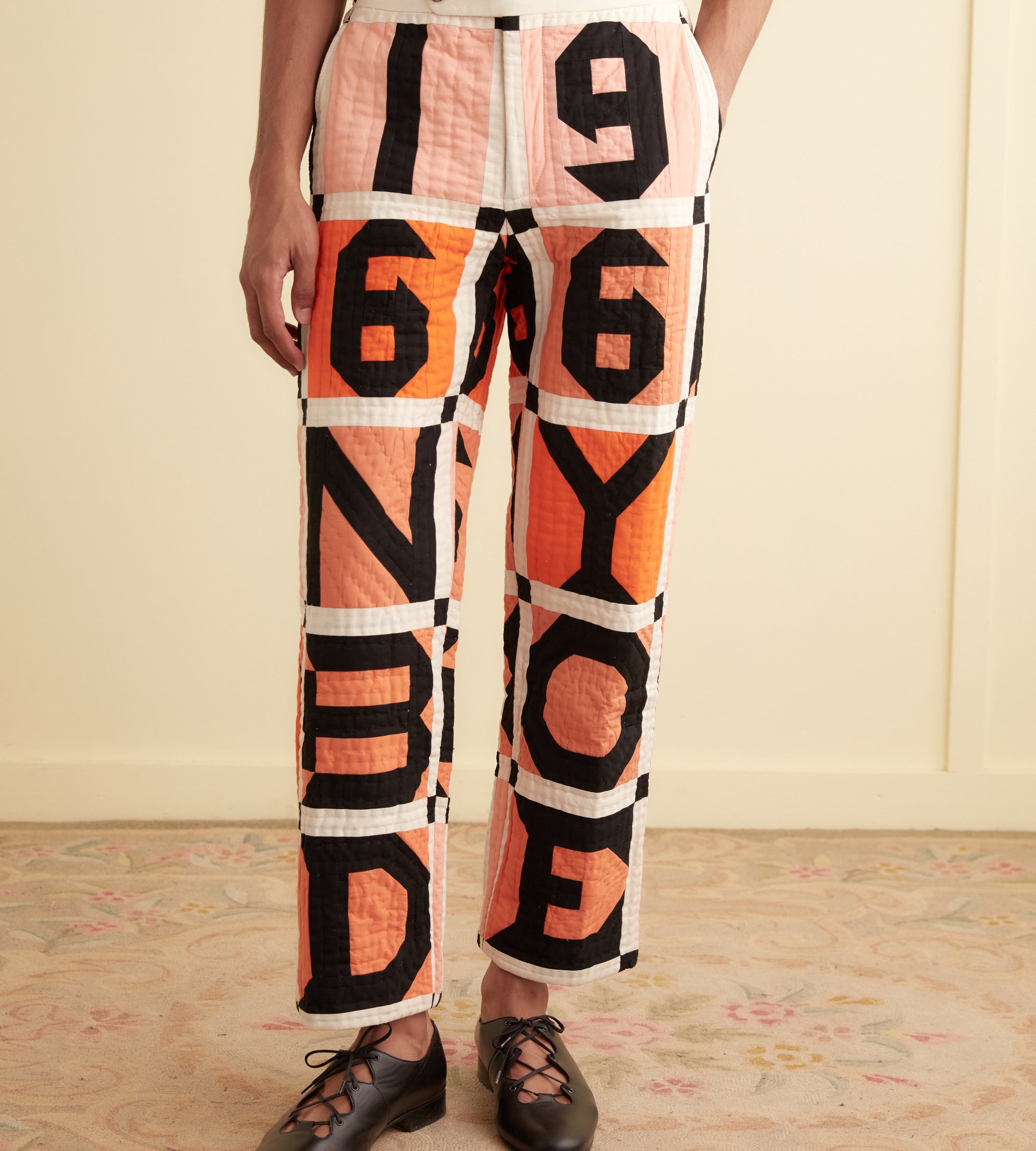 These trousers are inspired by an alphabet quilt from the early 20th century. We recreated the original quilt for this style, incorporating “1966,” “NY,” and “BODE” into the pattern. The trousers have a mid-rise and a straight leg.