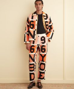 These trousers are inspired by an alphabet quilt from the early 20th century. We recreated the original quilt for this style, incorporating “1966,” “NY,” and “BODE” into the pattern. The trousers have a mid-rise and a straight leg.
