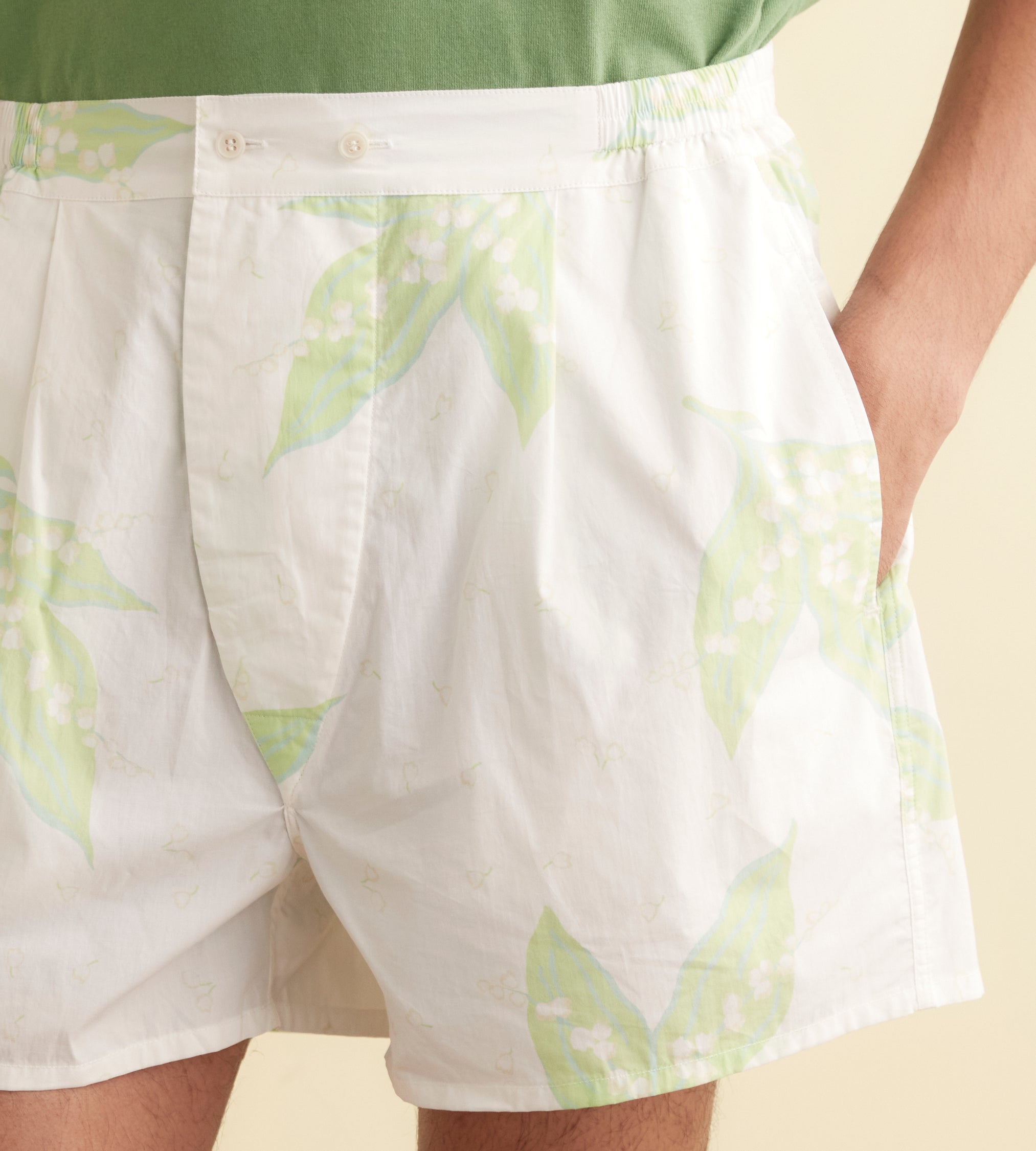 These boxers are inspired by a fabric swatch from the 1950s-1960s. The fabric features a pale green lily-of-the-valley print, replicated from the original material.