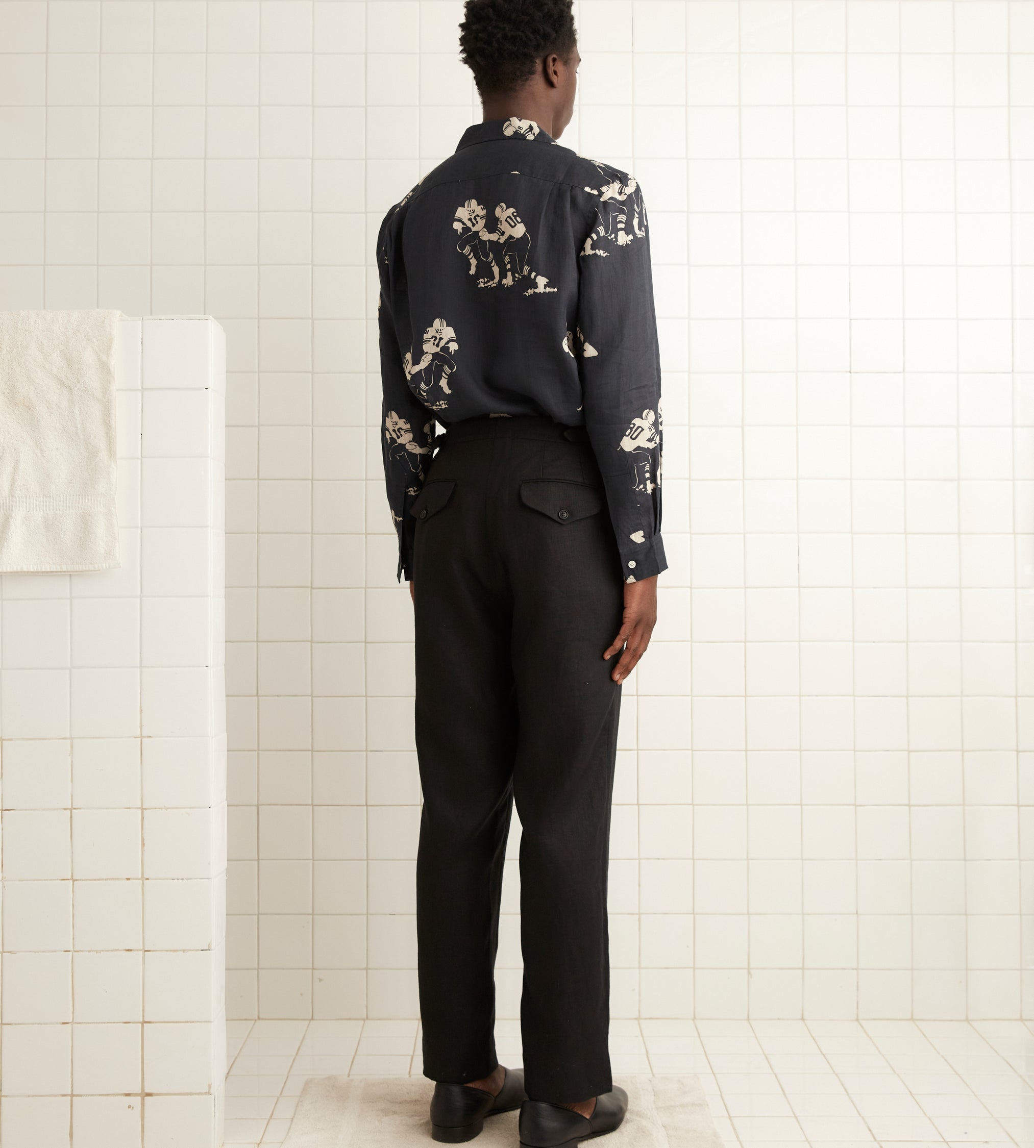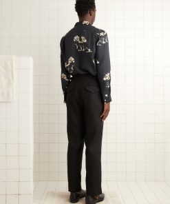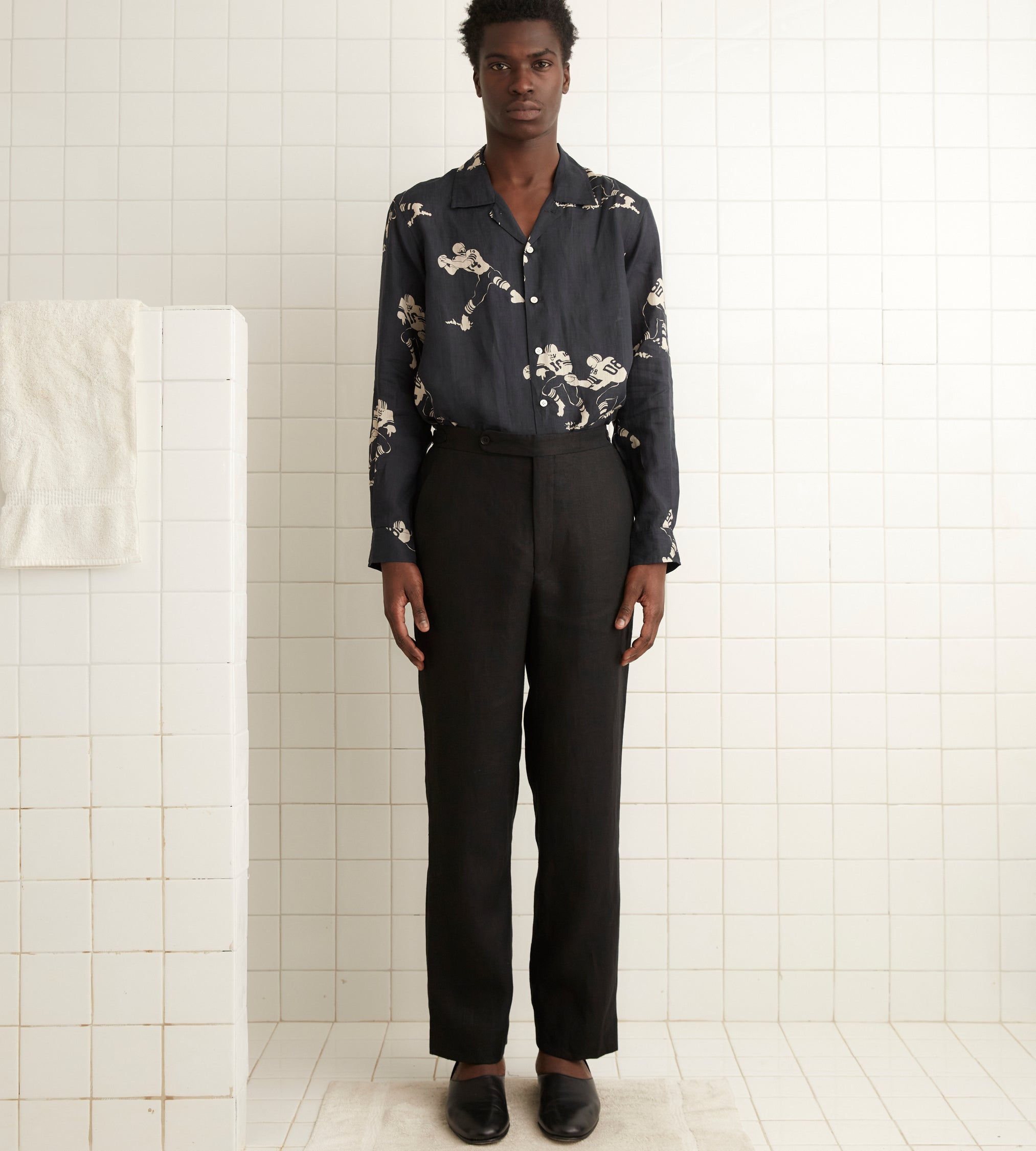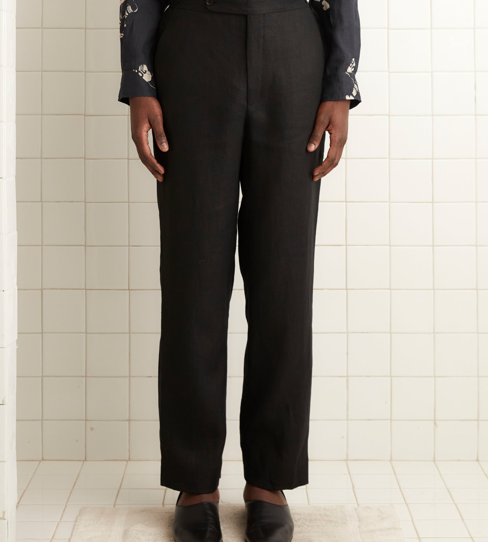 These trousers are inspired by men’s suiting from the 1950s-1960s. They are cut according to a traditional silhouette—mid-rise, straight leg—and can be worn alone or with the matching suit jacket.