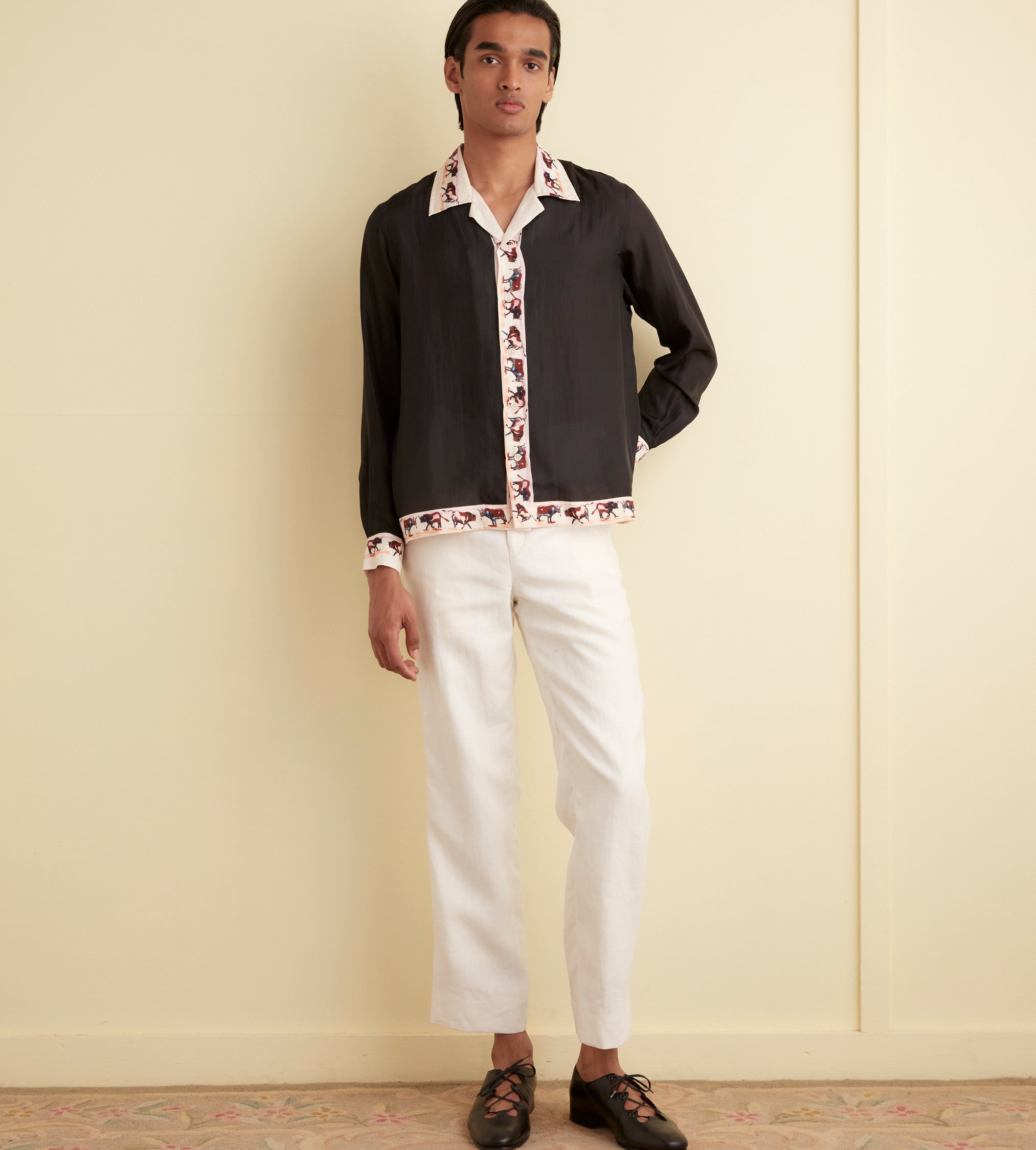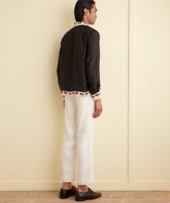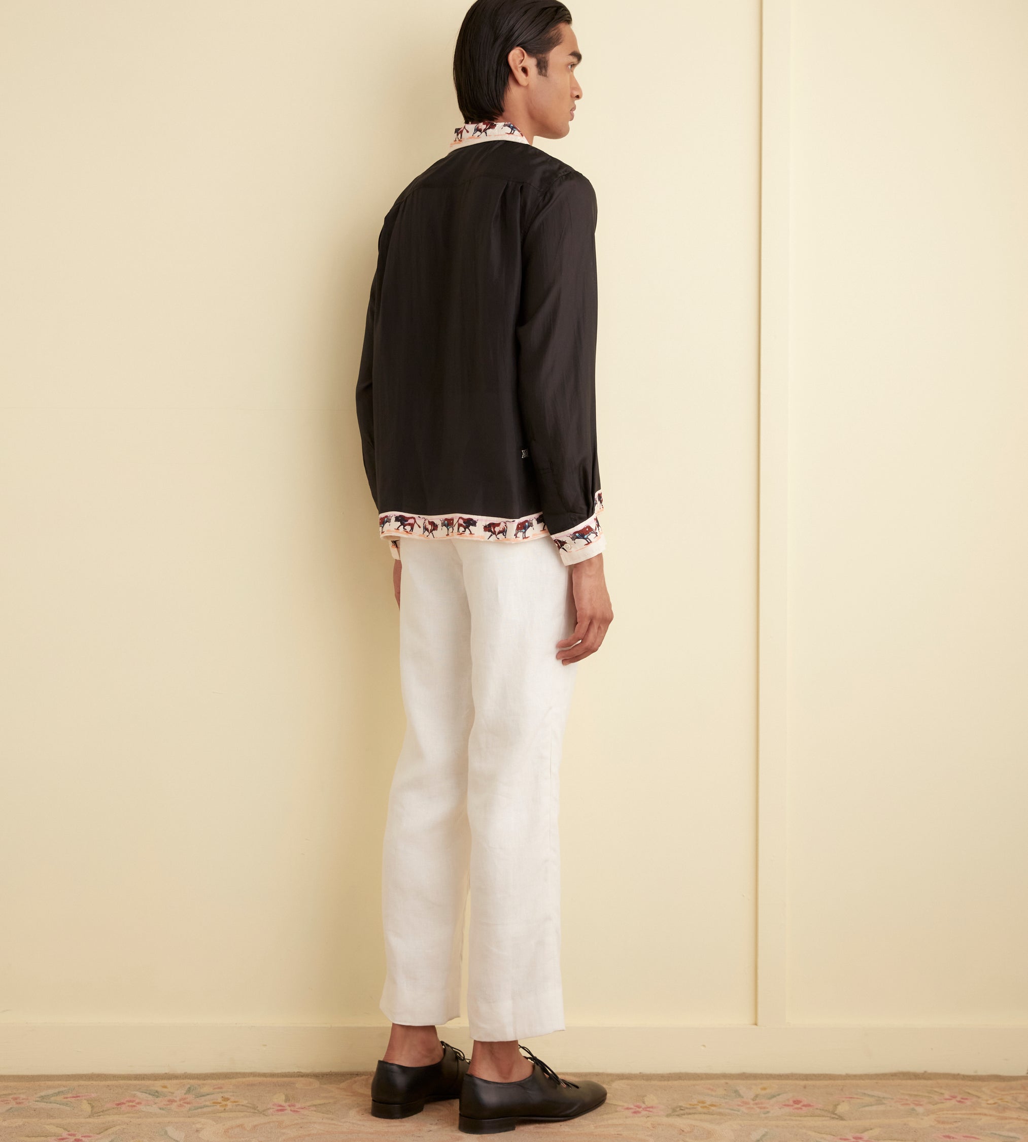 These trousers are inspired by men’s suiting from the 1950s-1960s. They are cut according to a traditional silhouette—mid-rise, straight leg—and can be worn alone or paired with the matching suit jacket.