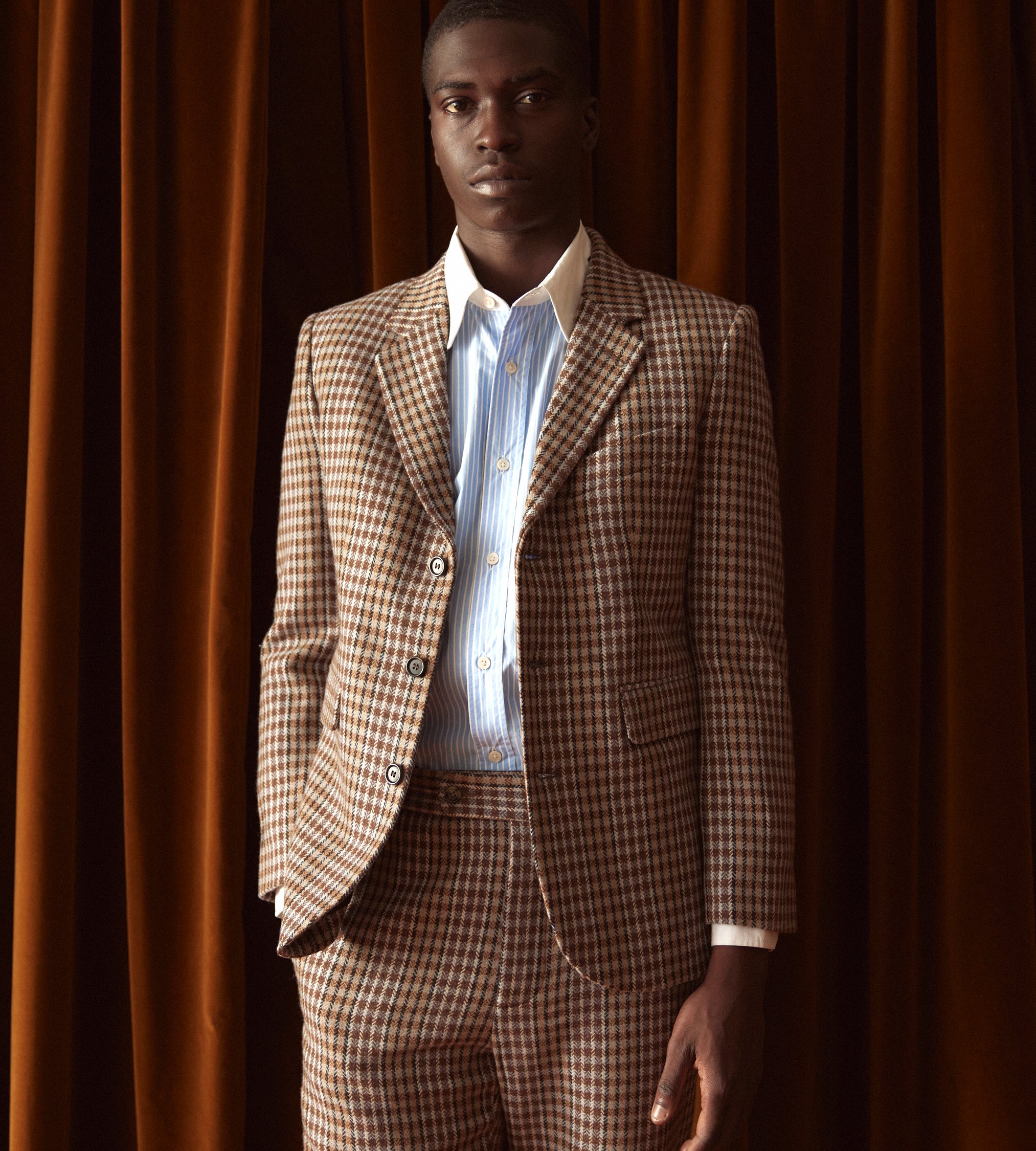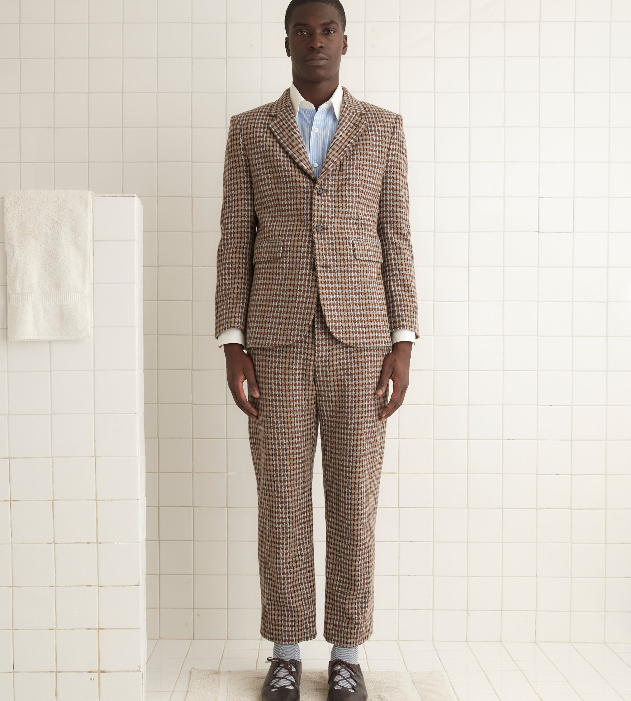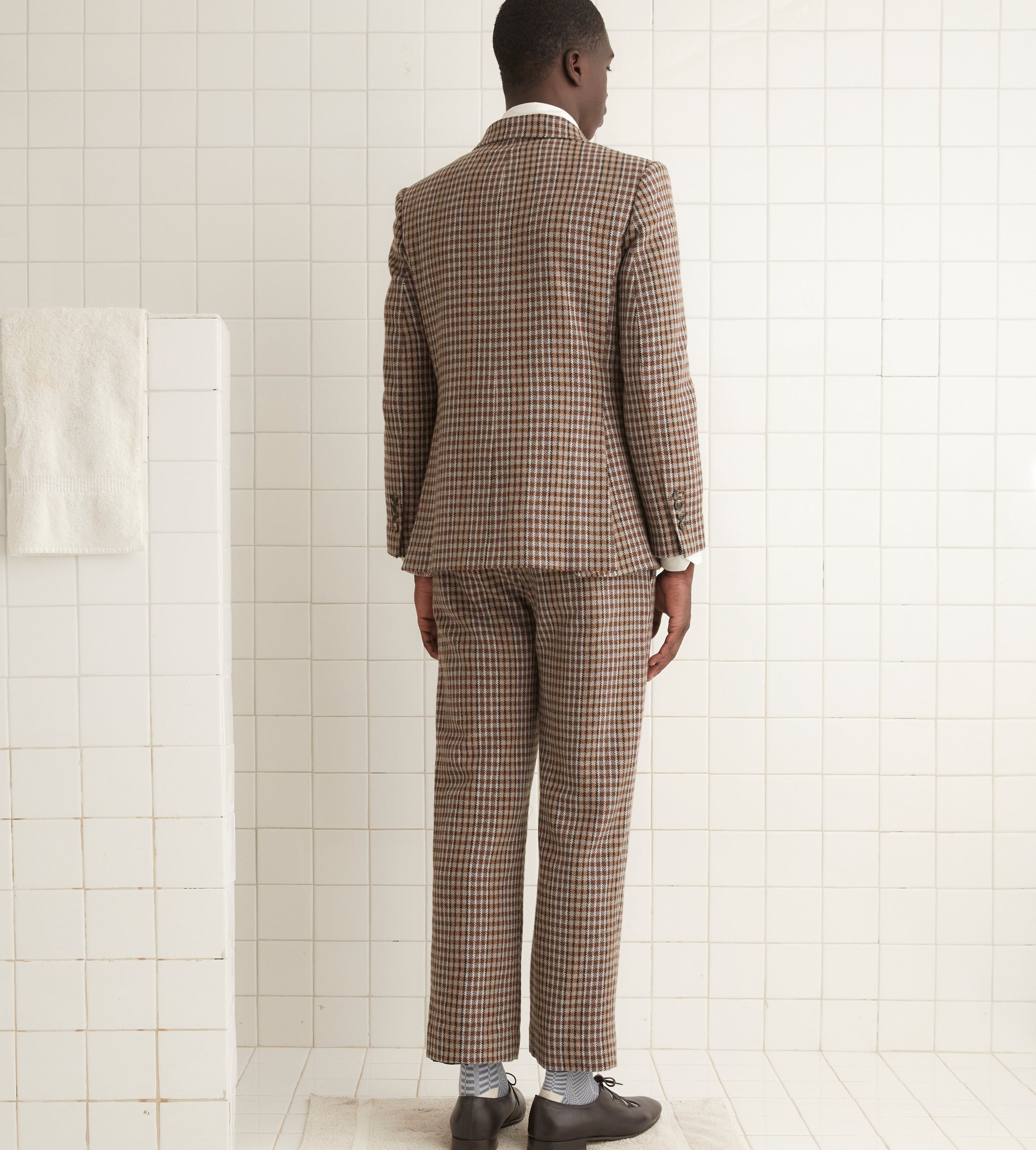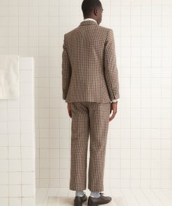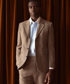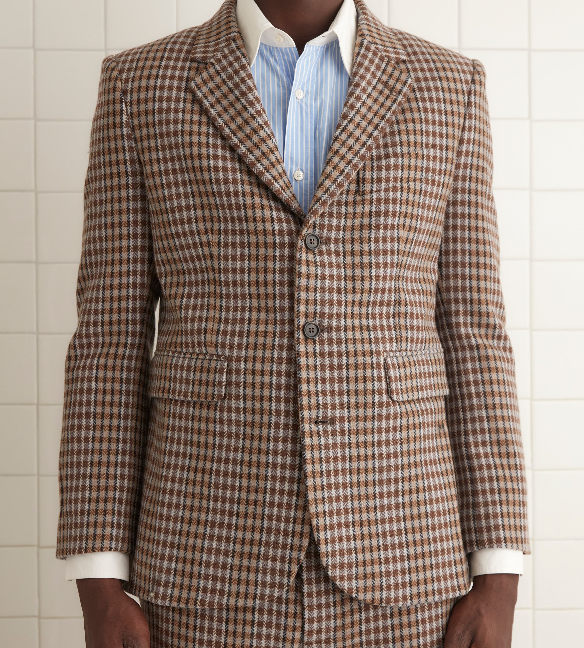 This jacket is inspired by men’s suiting from the midcentury. We reproduced the silhouette in a brown and black herringbone tweed for this style.