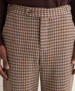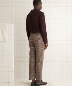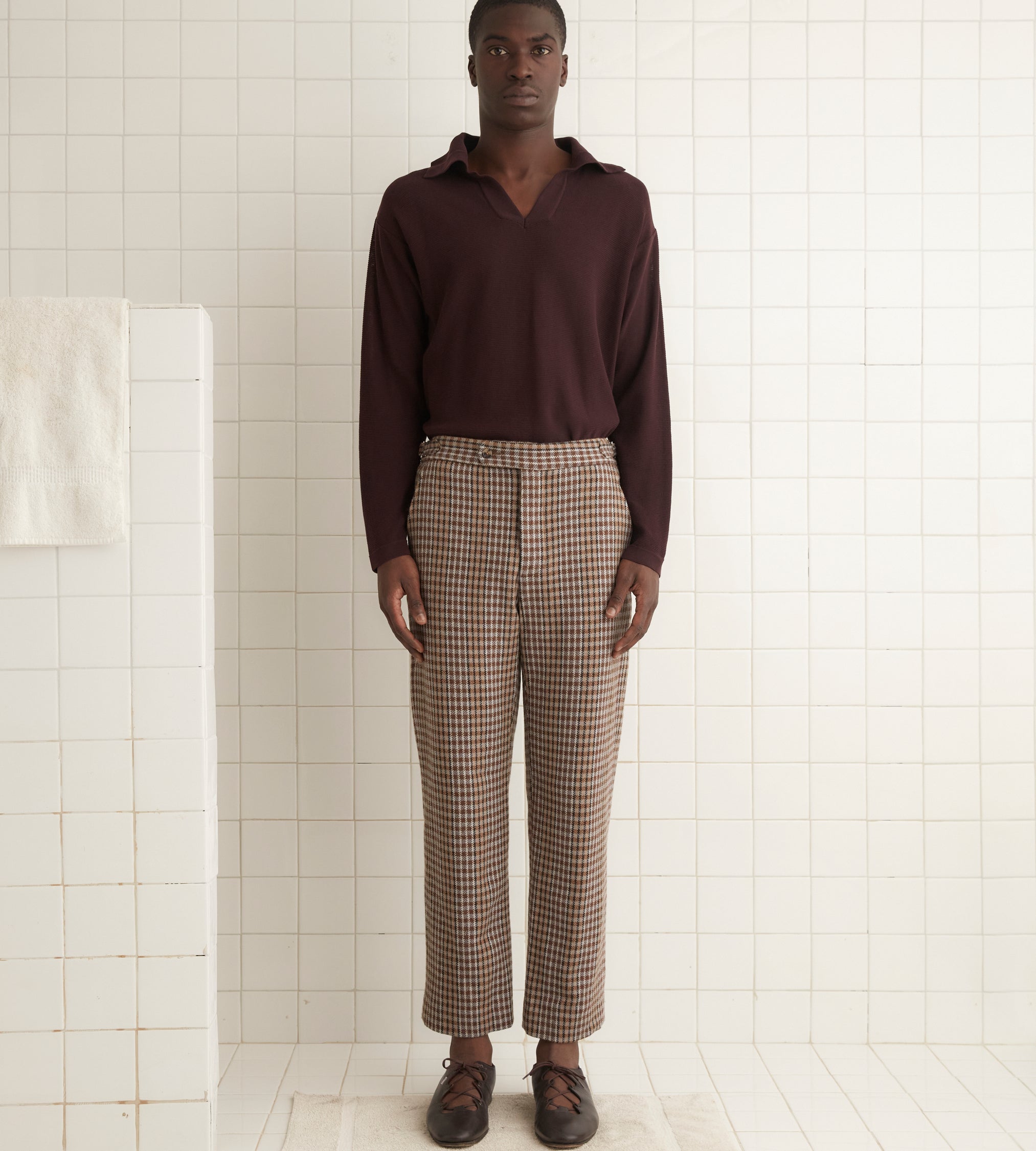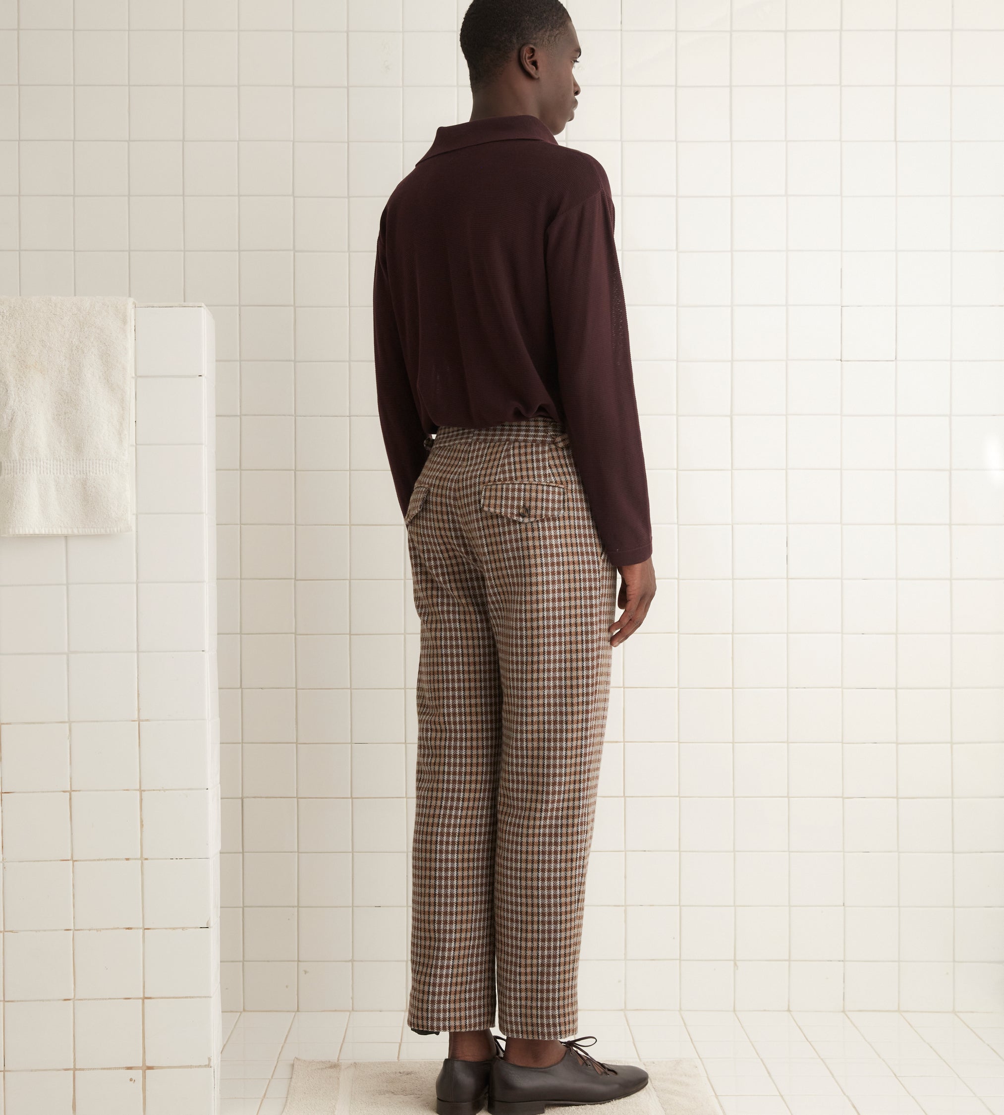 These trousers are inspired by men’s suiting from the 1950s-1960s. We reproduced the silhouette in brown and black herringbone tweed. The trousers have a mid-rise and a straight leg.