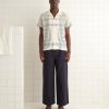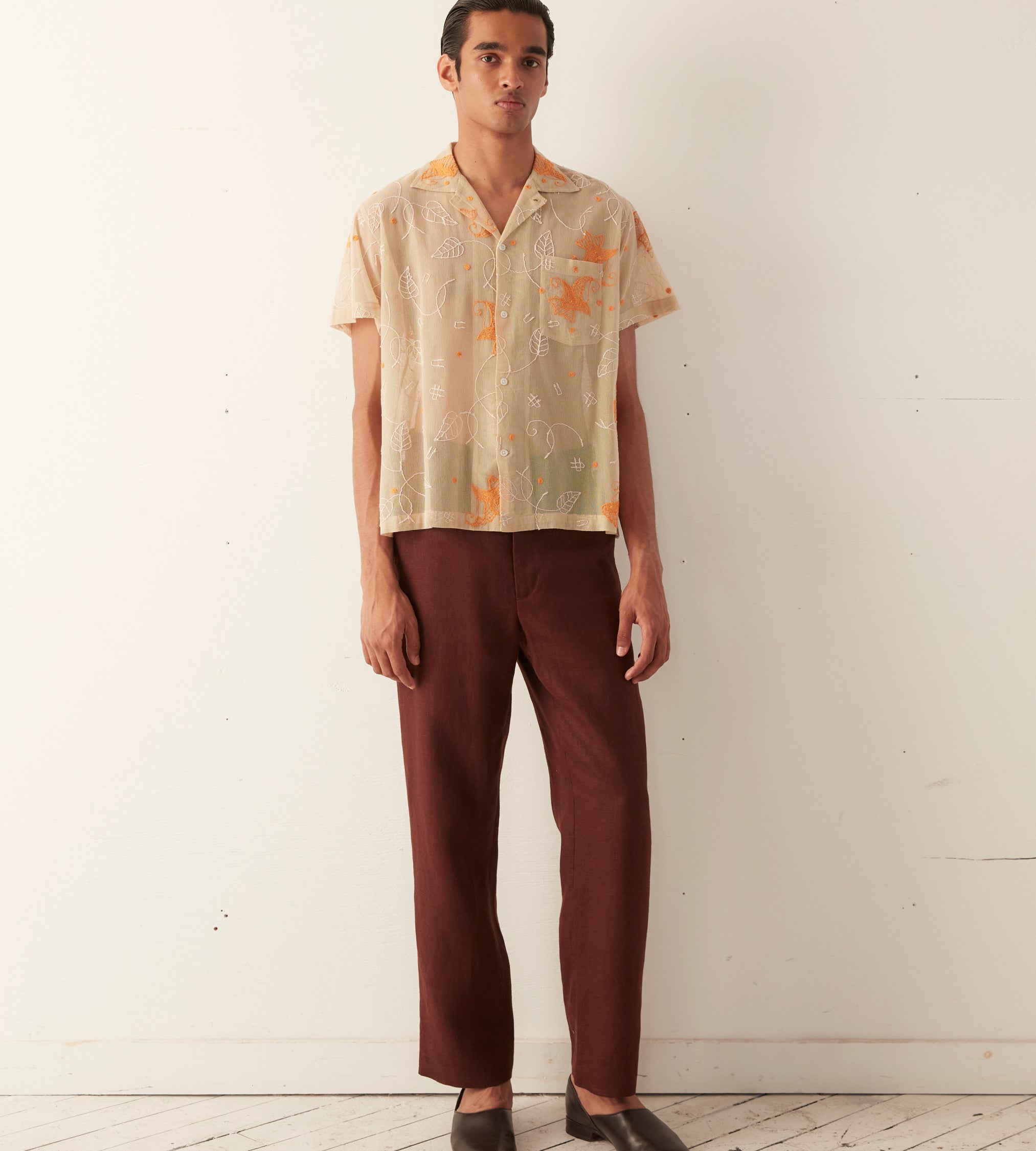 Inspired by a hand-embroidered lace doily from the 1920s-1940s, this shirt features hand-guided and couching embroidery, a style wherein a cord of thread is laid on the fabric in patterns, then secured with short perpendicular stitches.