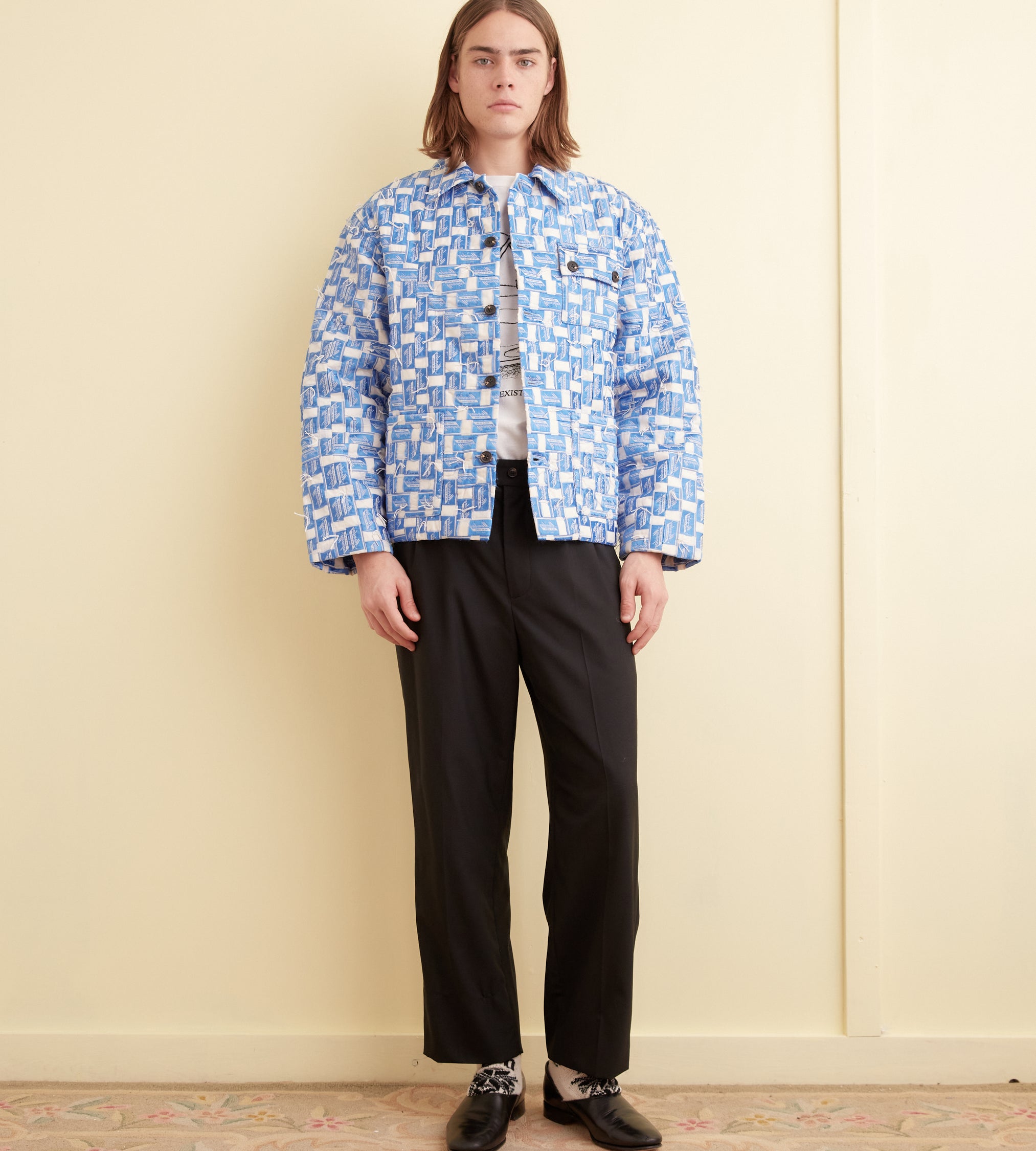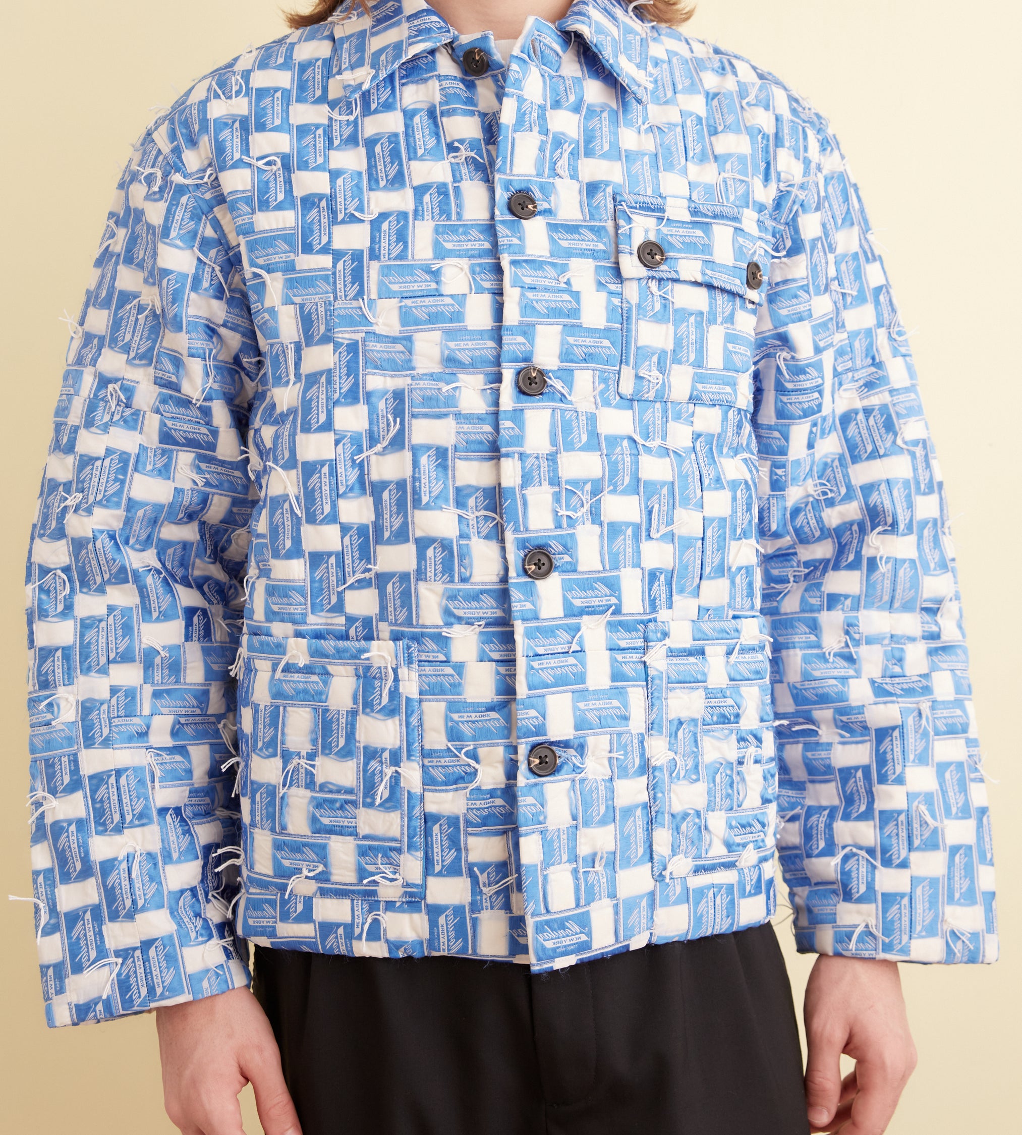This jacket is inspired by a vintage quilt made of woven labels, circa 1950s. The design of the original labels has been modified to read “Monday,” a German Wirehaired Pointing Griffon.