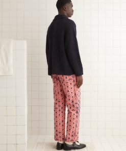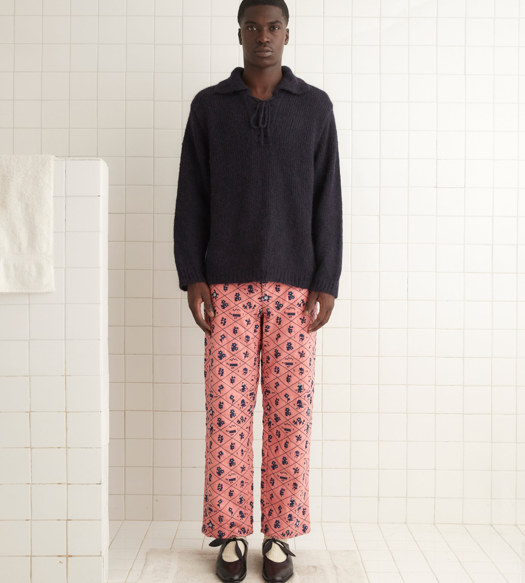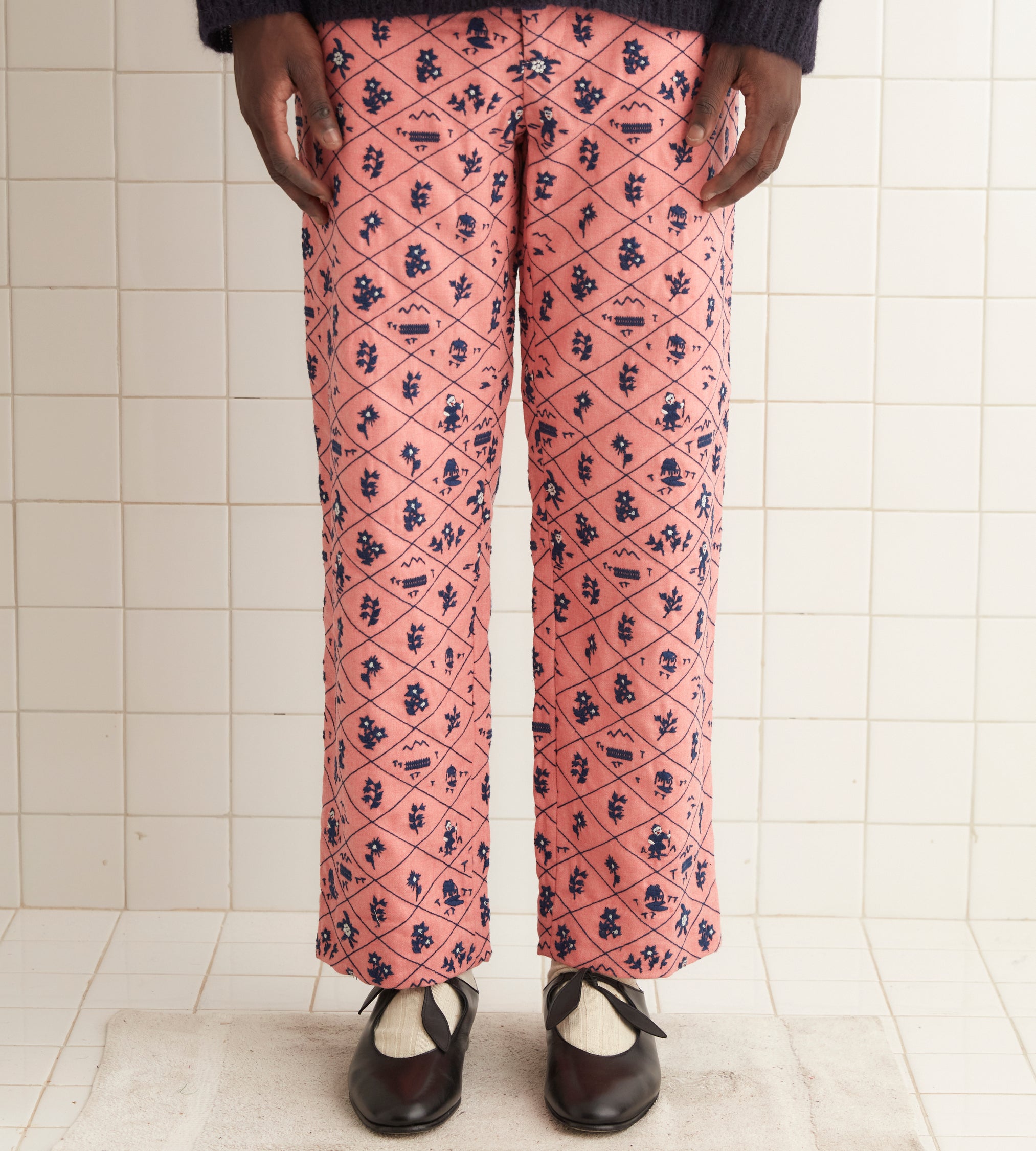 These trousers are inspired by a sweater from the 1960s. The sweater was embroidered with this all-over diamond pattern. Inside each diamond is an indigo-and-white motif: flowers, mountains, or a small mountain climber.