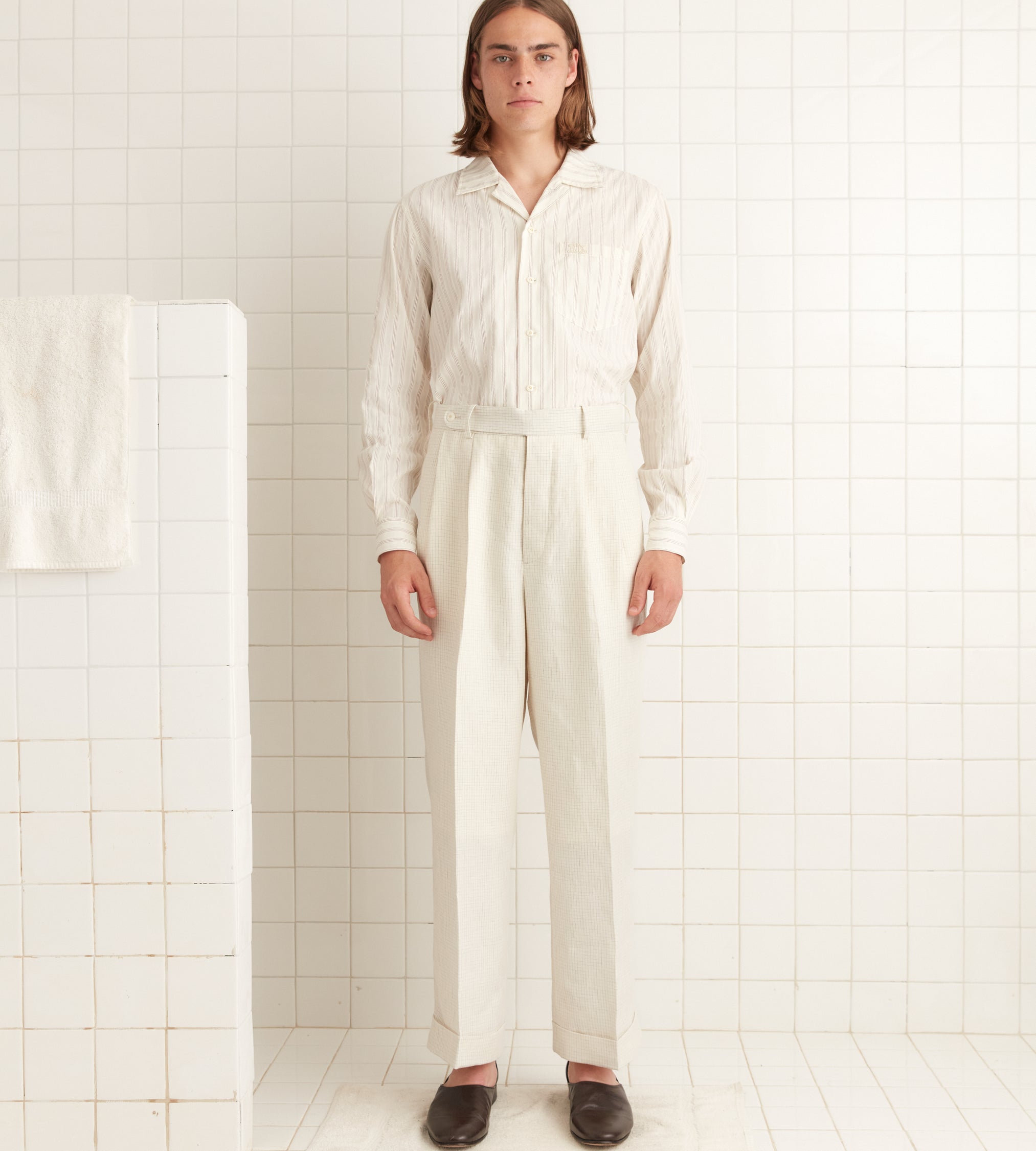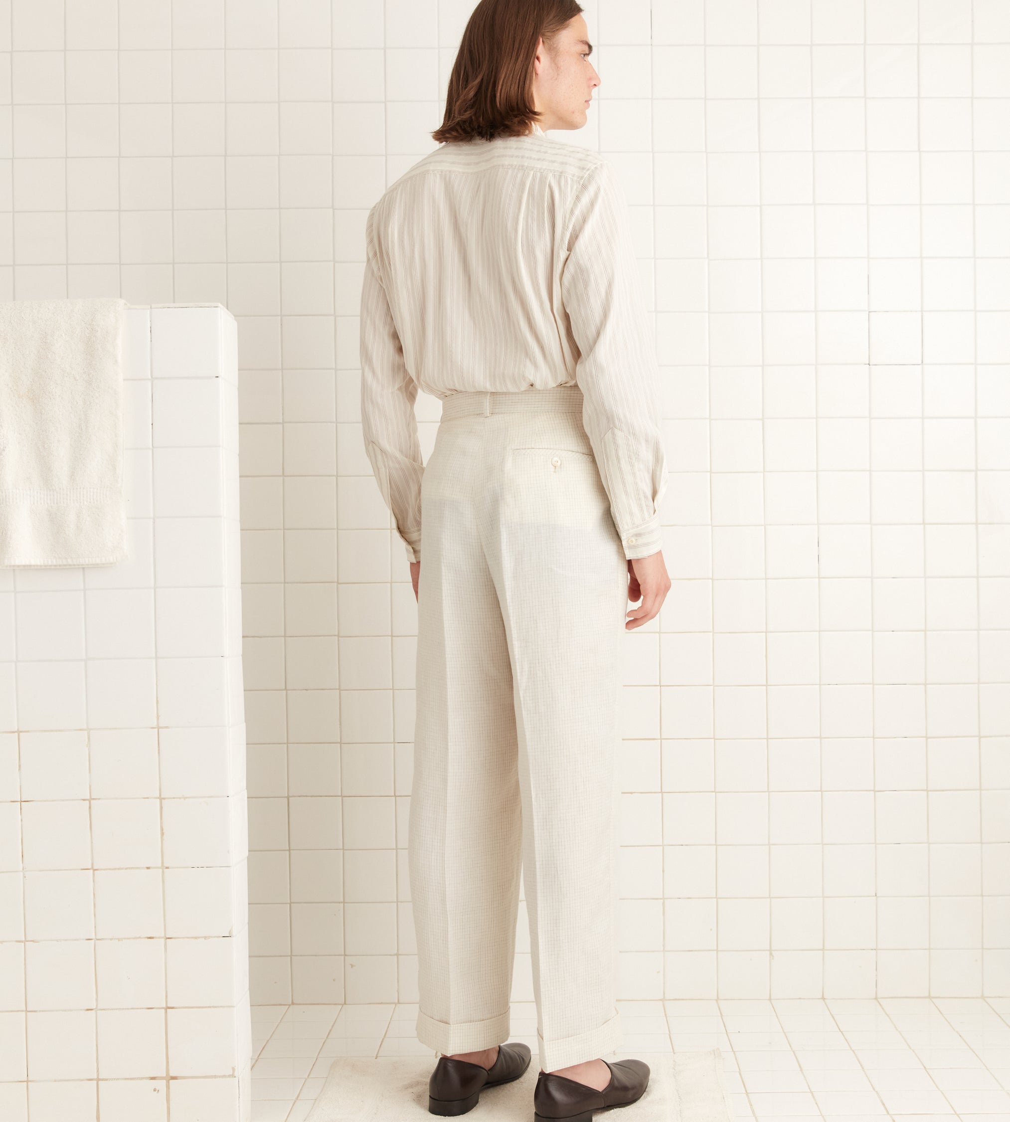 These trousers are inspired by men’s suiting trousers from the 1950s-1960s. We reproduced the mid-rise and wide-leg silhouette in an ivory and taupe graph check.