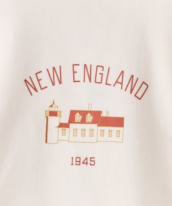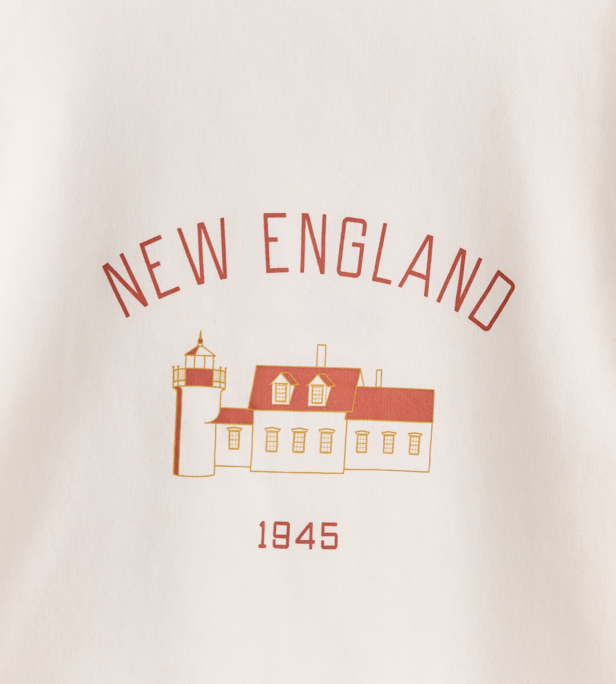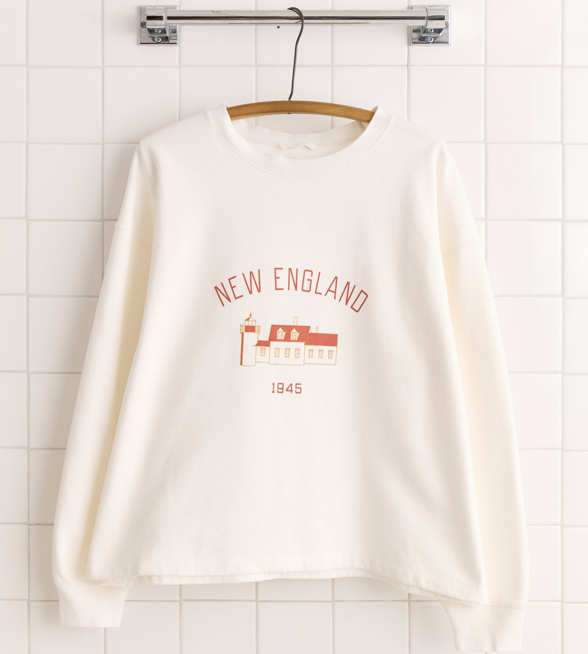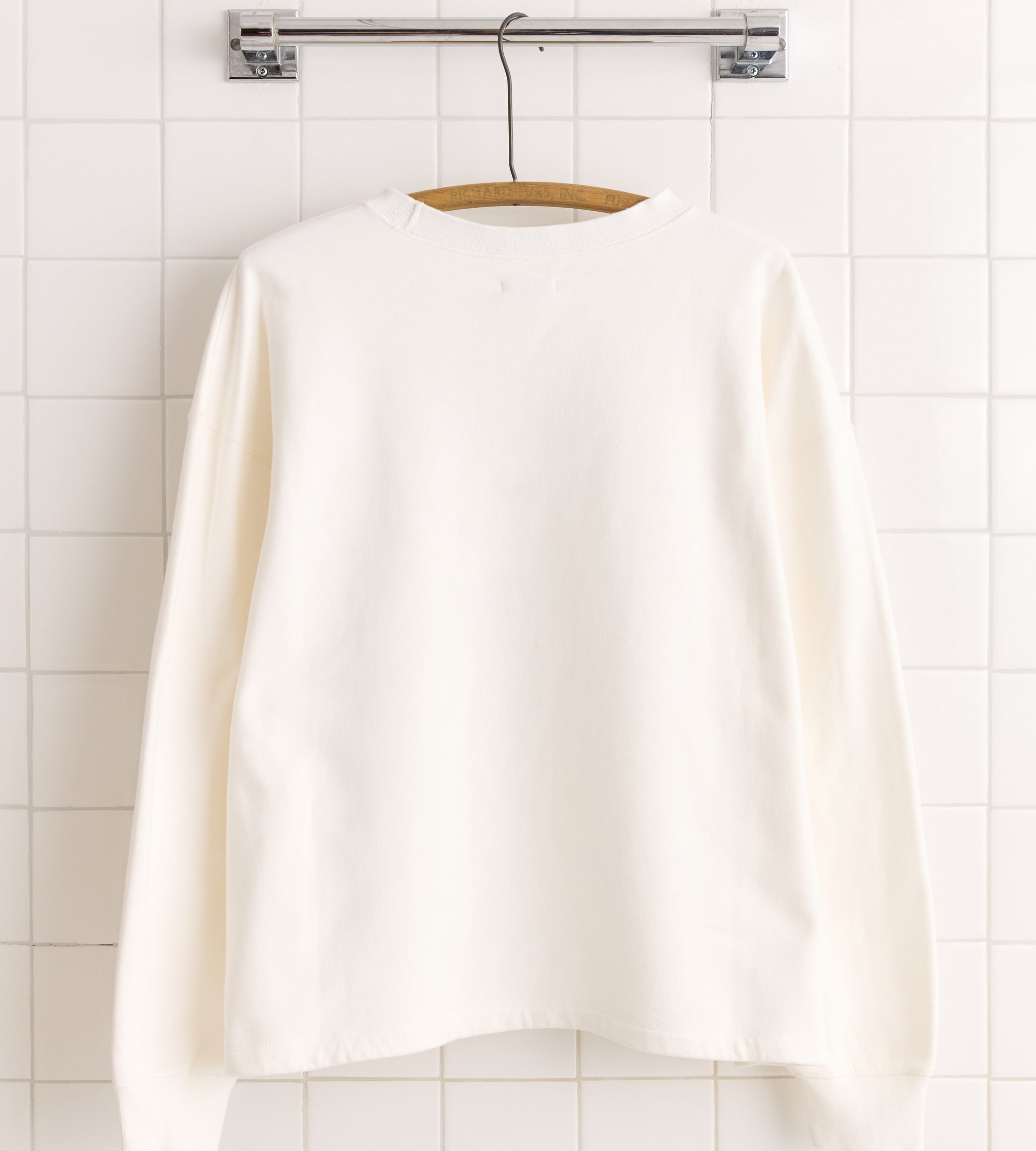 This style is inspired by souvenir sweatshirts from the 1940s. Tees and sweatshirts made for soldiers and sailors during the Second World War were some of the first mass-produced screen-printed garments.