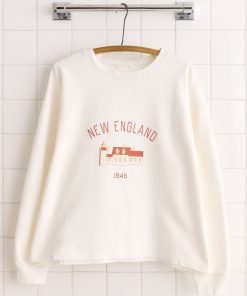 This style is inspired by souvenir sweatshirts from the 1940s. Tees and sweatshirts made for soldiers and sailors during the Second World War were some of the first mass-produced screen-printed garments.