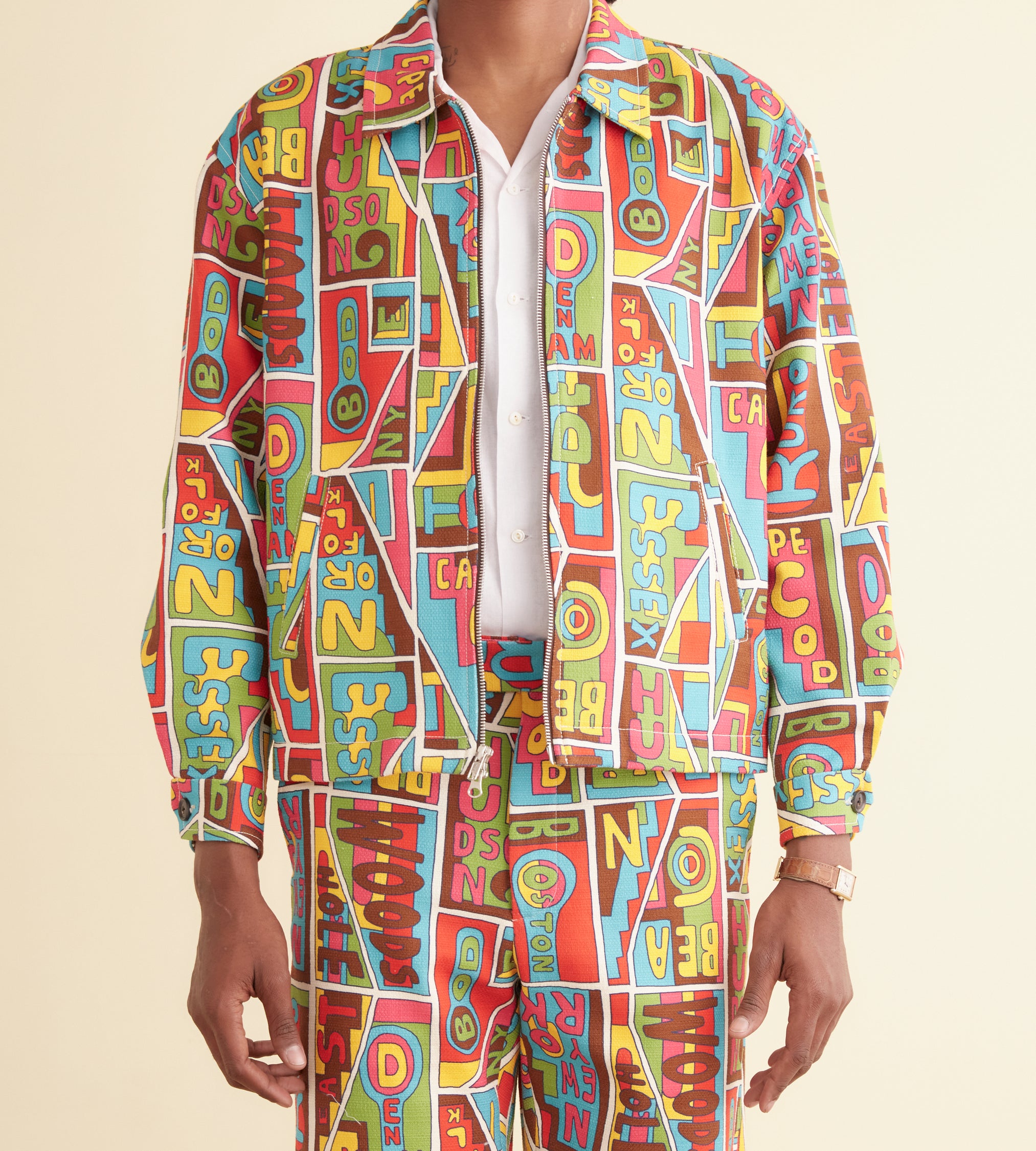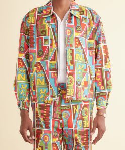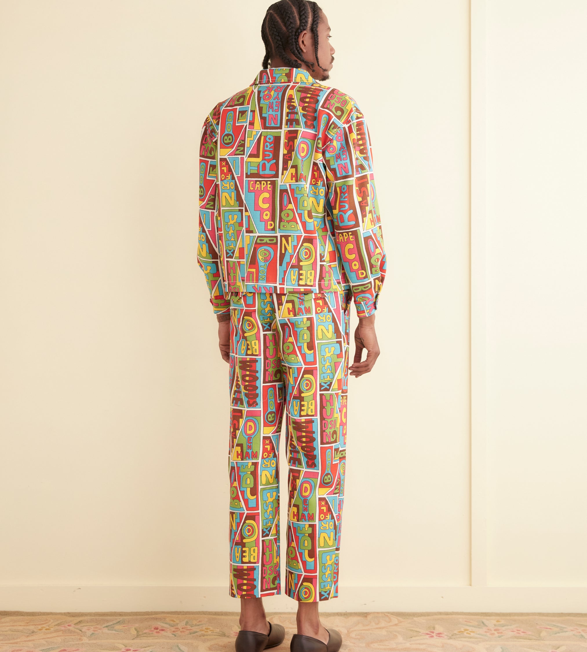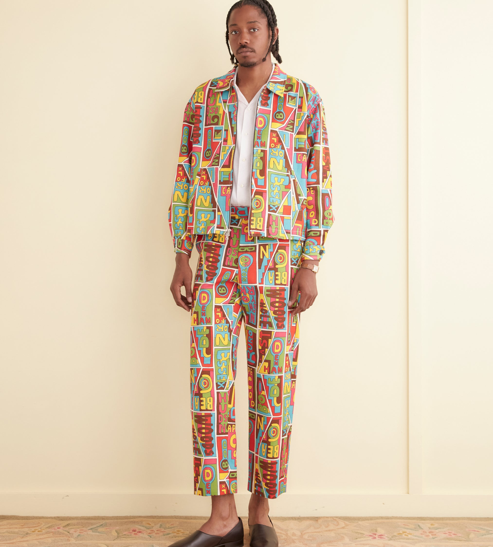 This jacket is inspired by vintage upholstery fabric, circa 1960s-1970s. We reproduced the fabric for this style, incorporating “Bode” into the pattern. The jacket is cut in a classic workwear silhouette, with a zipper and two front welt pockets.