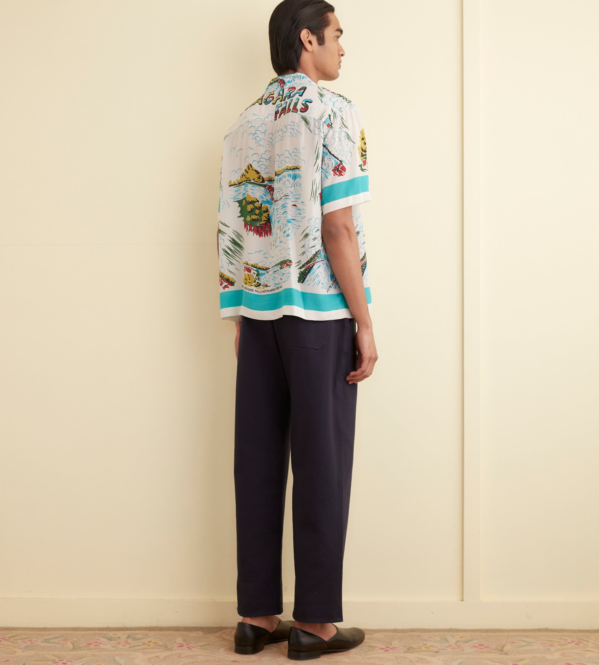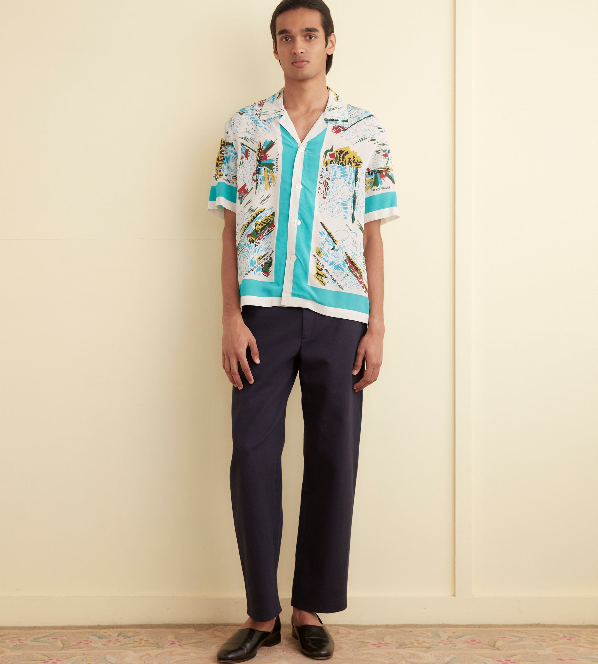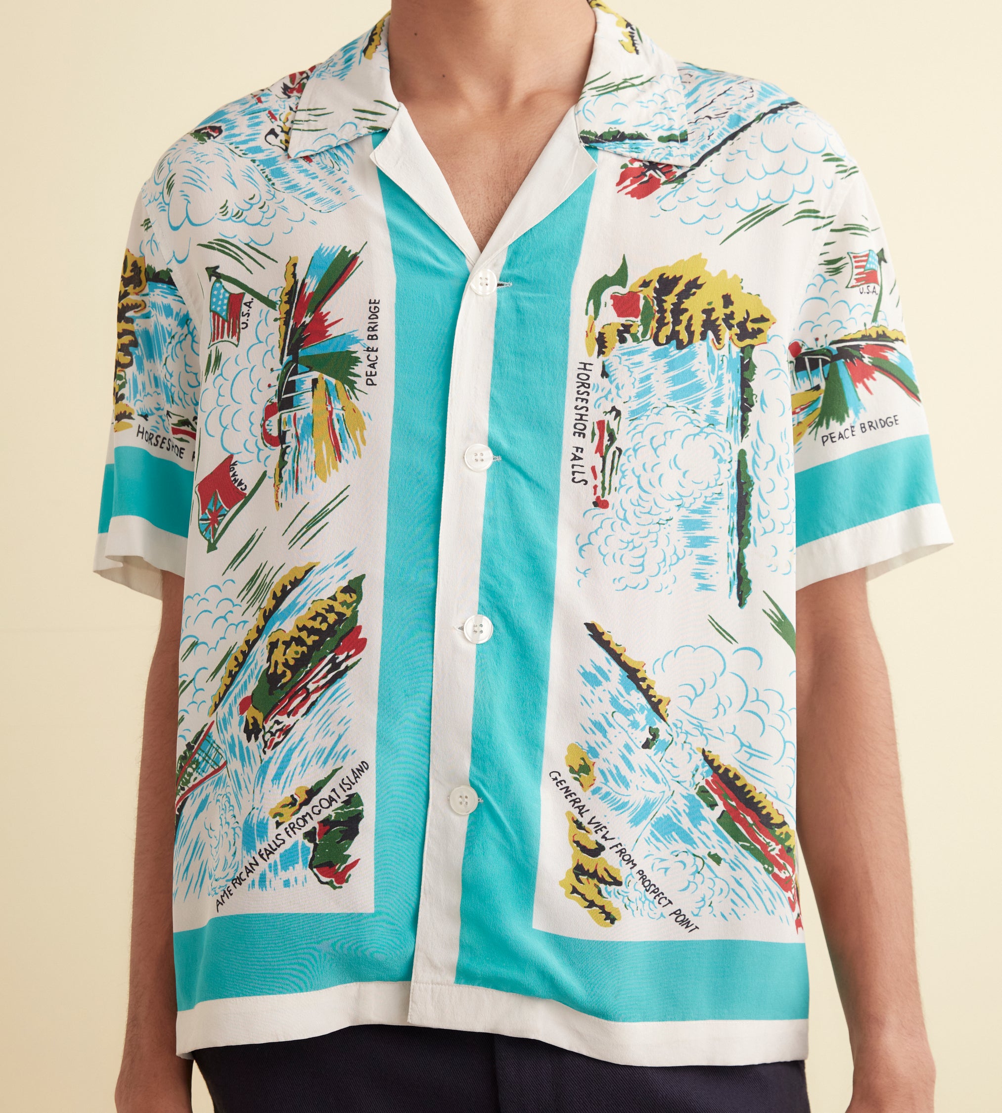 This short-sleeved shirt is inspired by a novelty tablecloth from the 1940s, likely a souvenir piece produced in the tourism boom of the post-war decades. We have reproduced the original design—which featured illustrations of Niagara Falls—on this shirt with a camp collar and a straight hem.