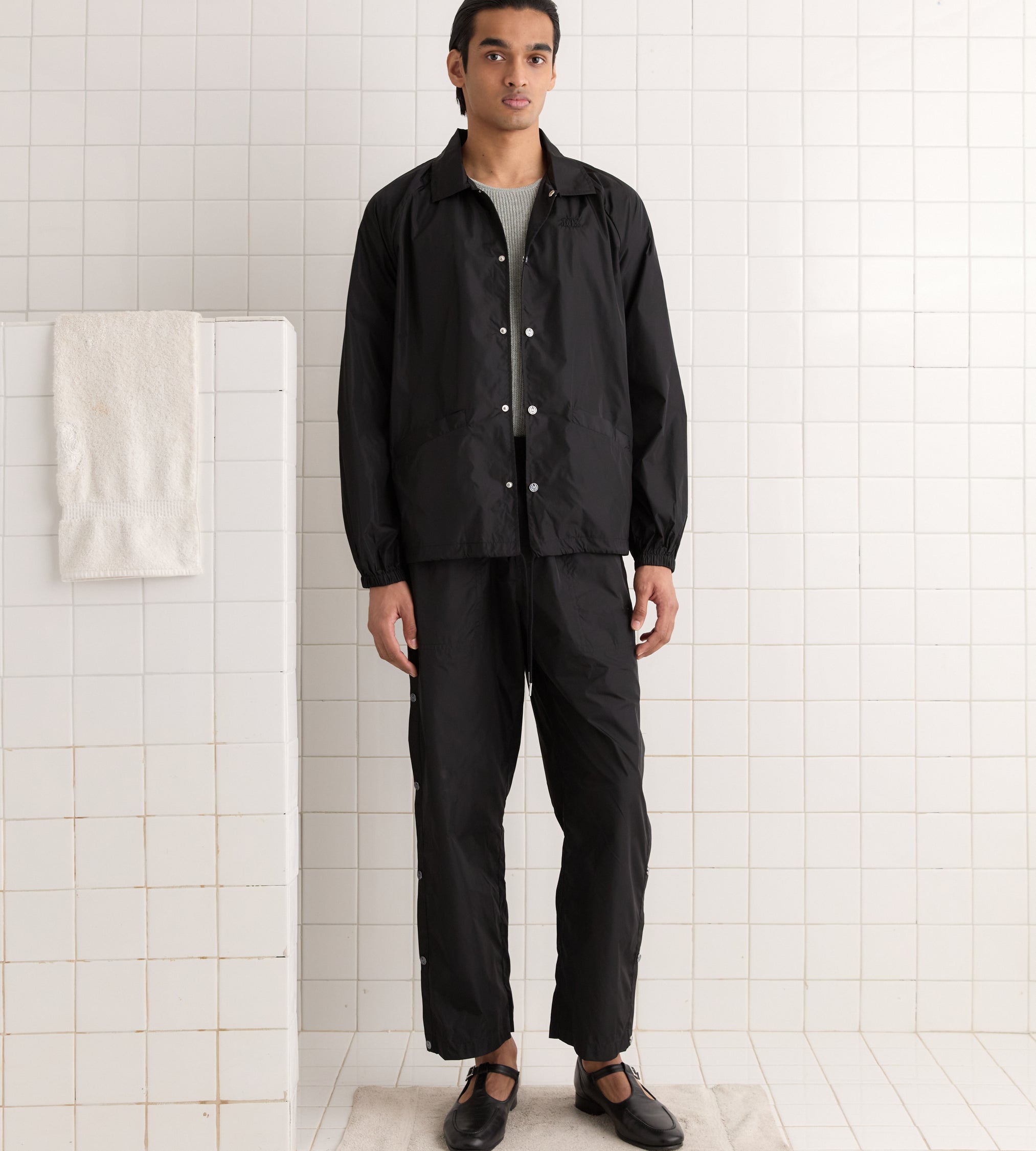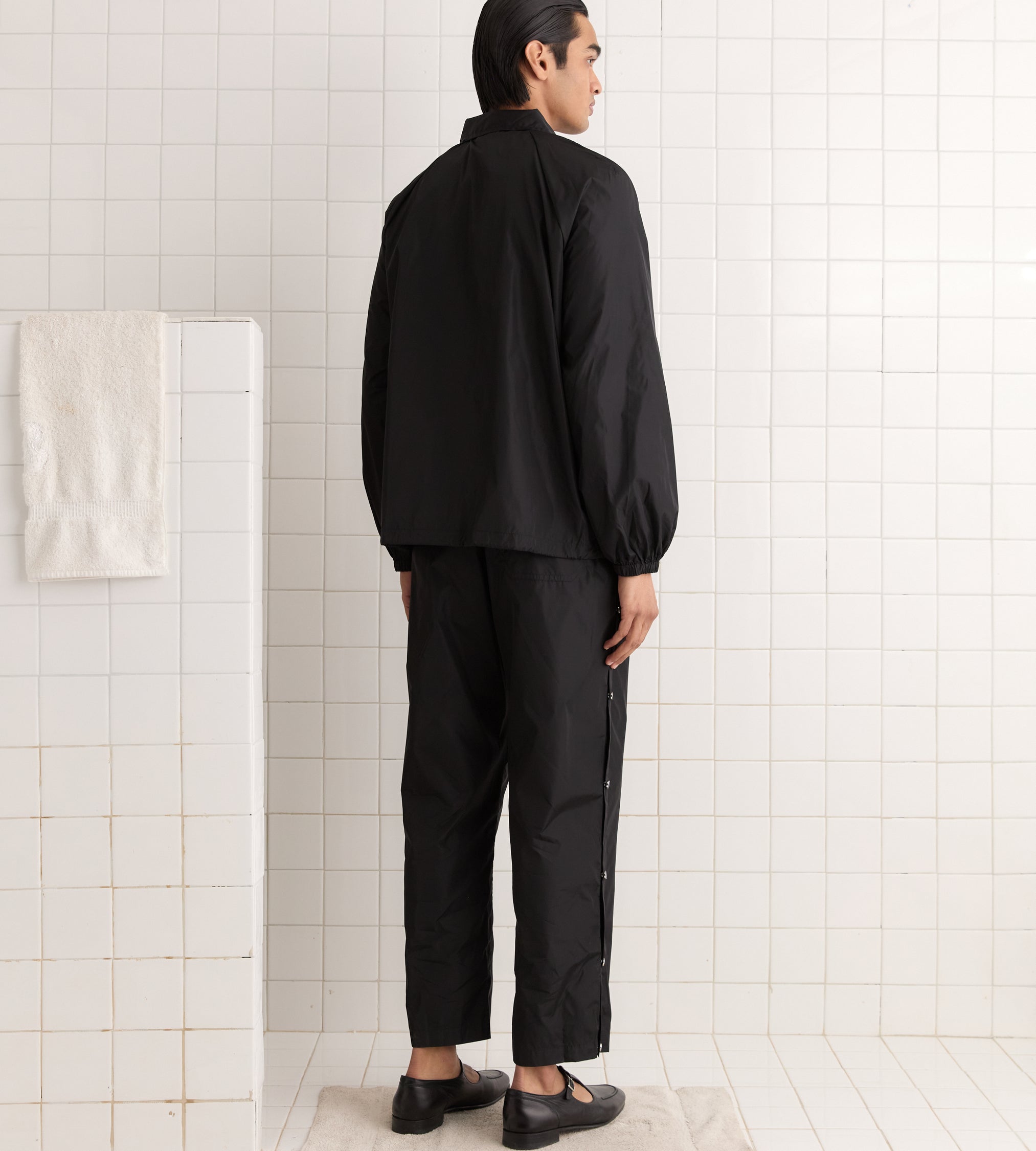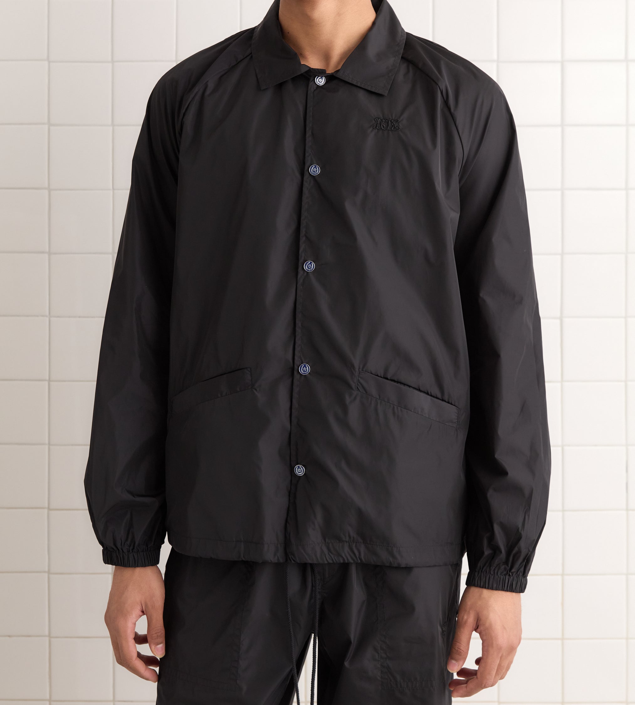 This jacket is inspired by a Boy Scouts windbreaker from the 1980s. We reproduced the silhouette in nylon with a drawstring hem. The jacket features a Bode monogram and enamel horseshoe-and-star snap buttons.