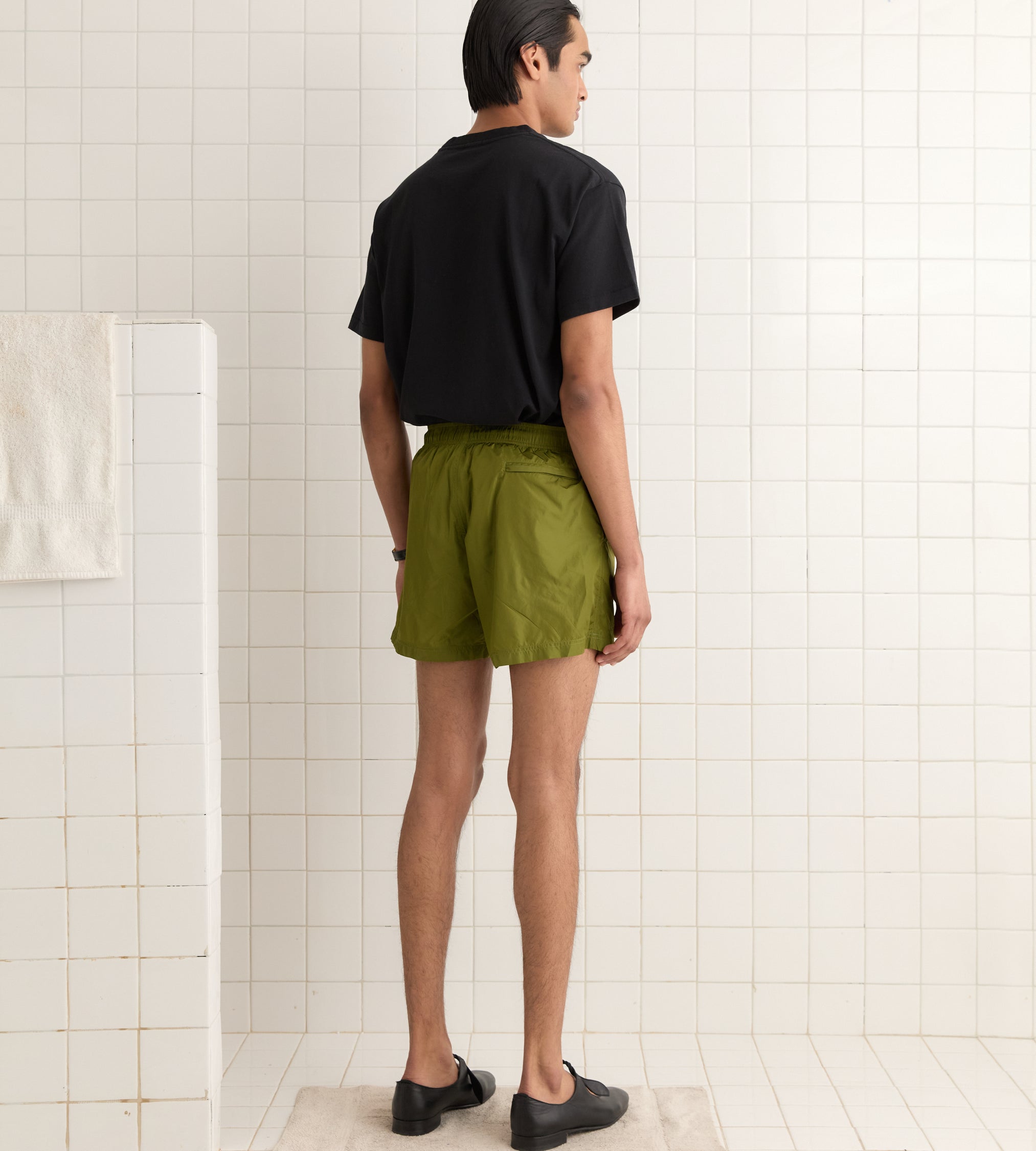 These track shorts are inspired by running shorts from the 1970s. We reproduced the silhouette in lightweight nylon with a “Bode” embroidery near the front hem.