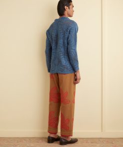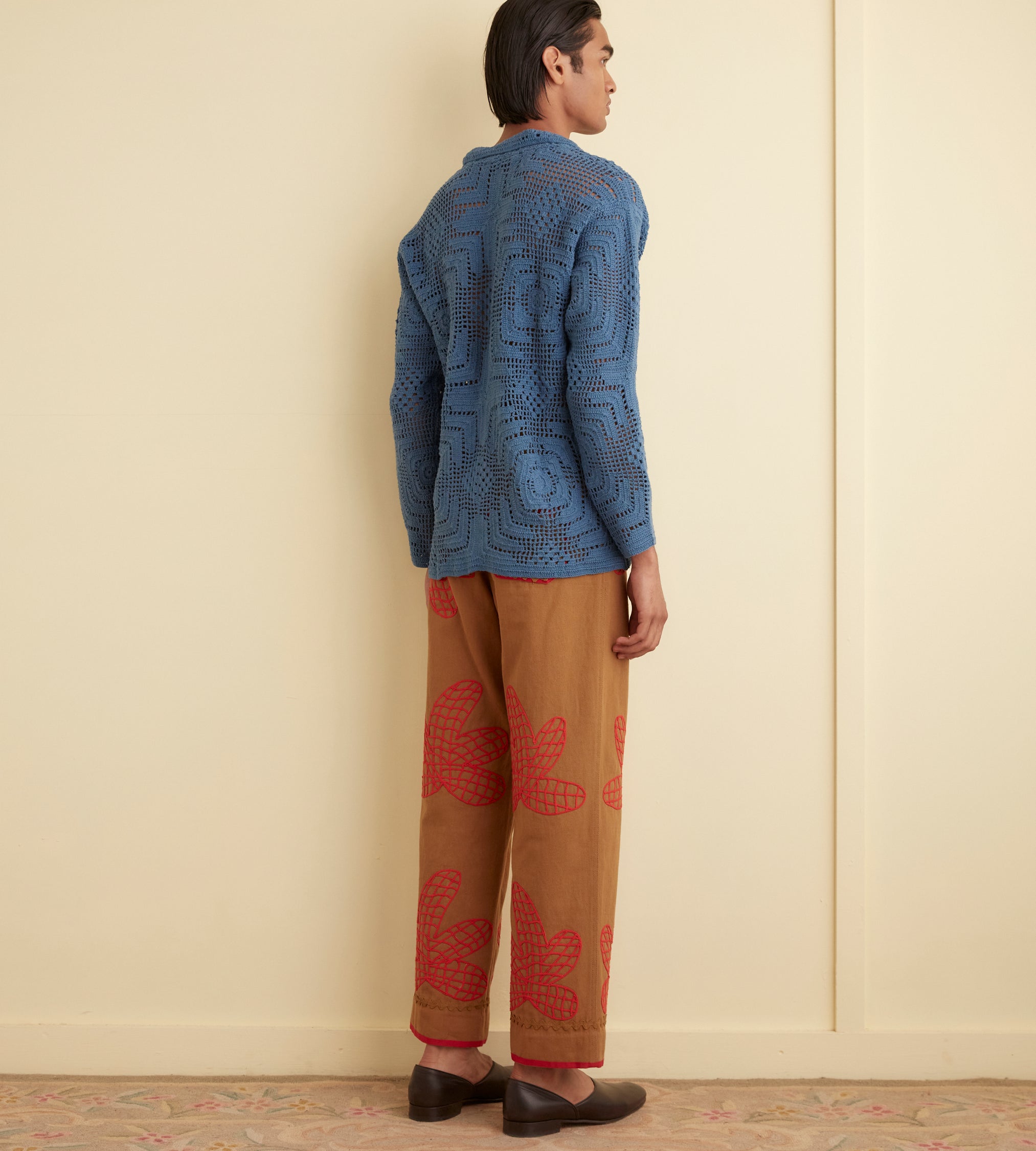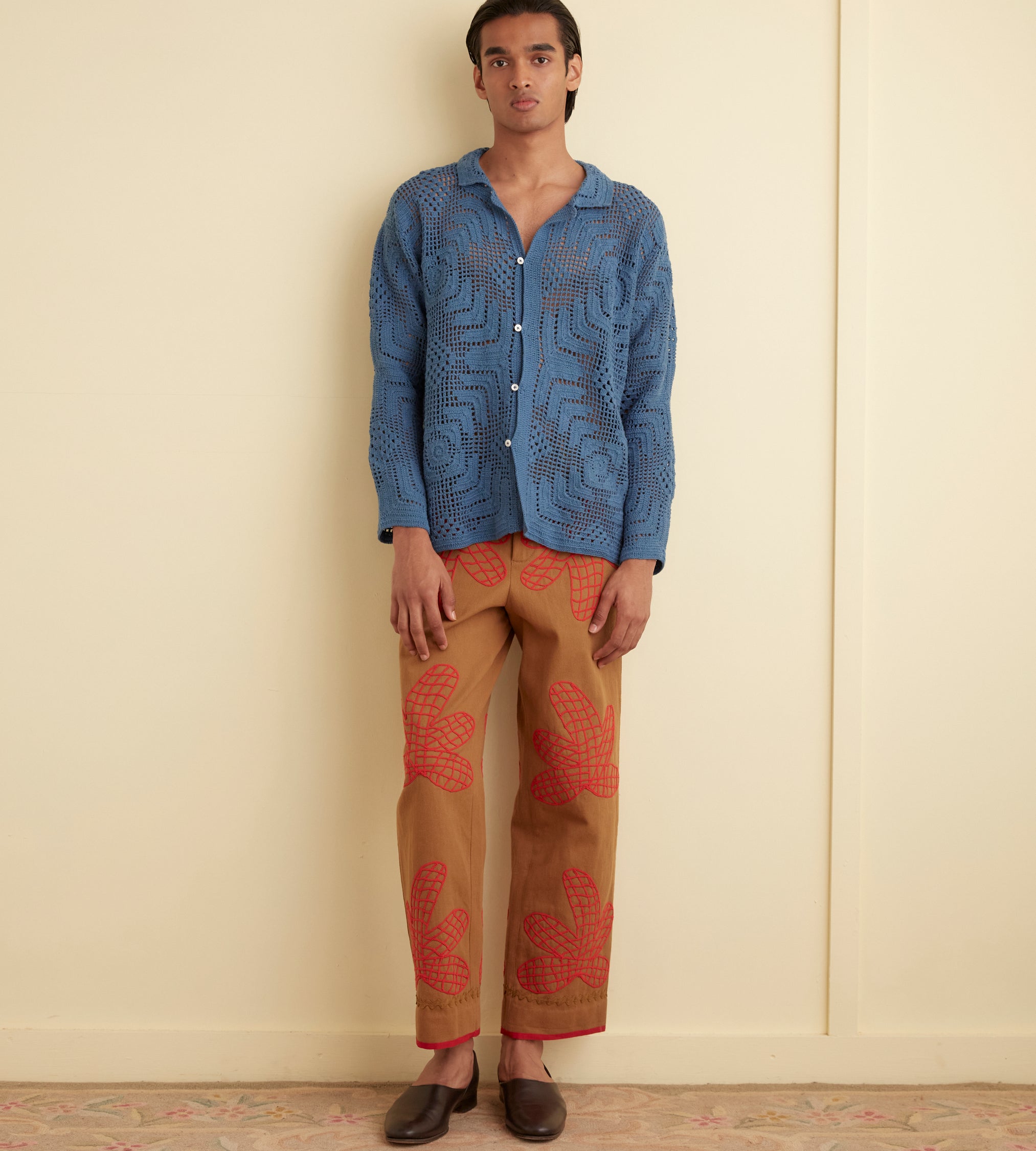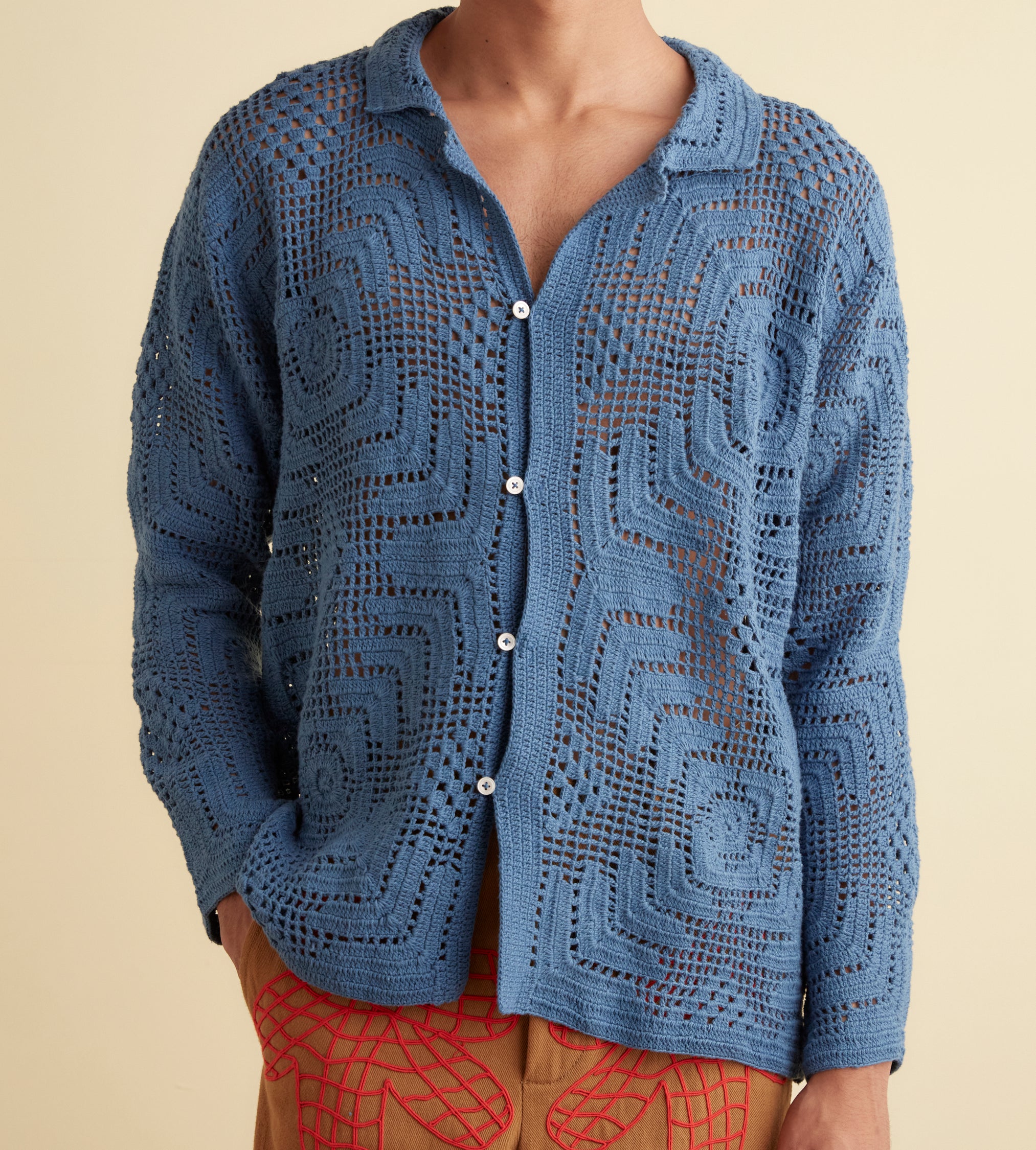 This shirt is inspired by vintage crochetwork, circa 1920s. Crochet is a comparably easy way to make lace and was widely used in the early 20th century for clothing, tablecloths, decorative trims, etc. We dyed this piece a petrol blue.