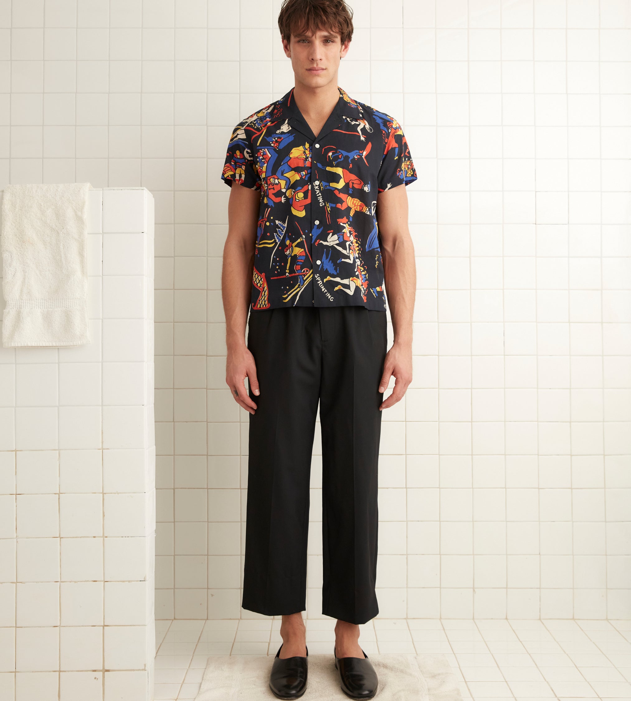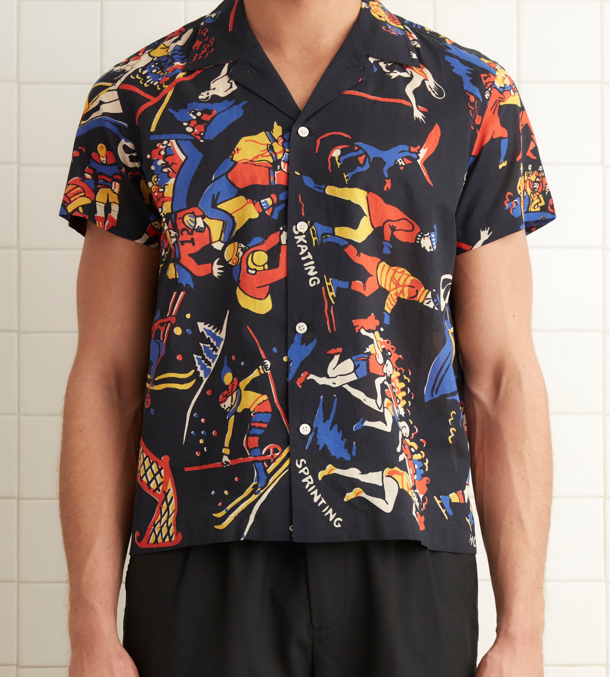This shirt is inspired by a printed scarf from the 1930s, patterned with illustrations of different sports and activities. We reproduced the fabric for this style.