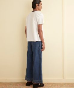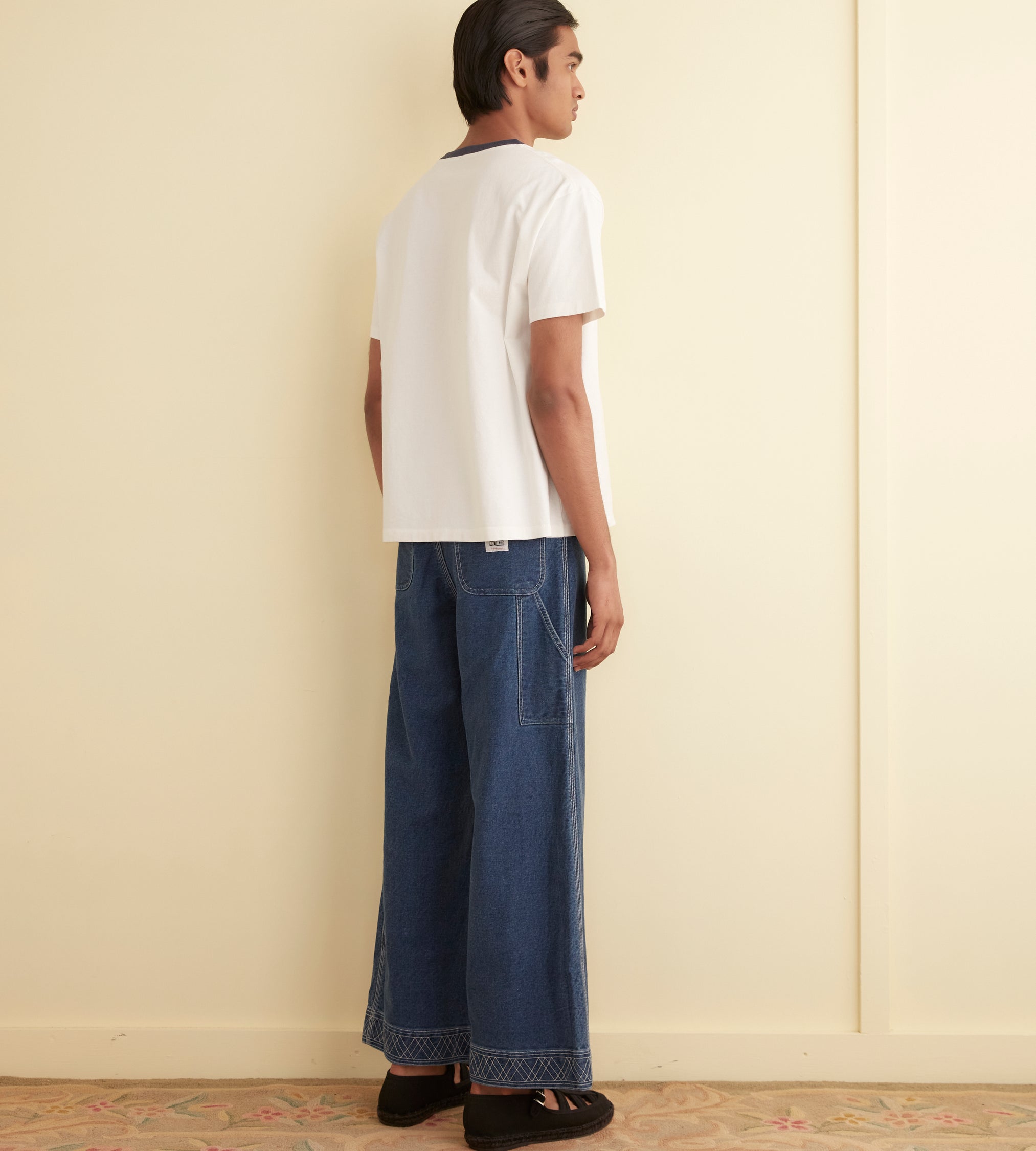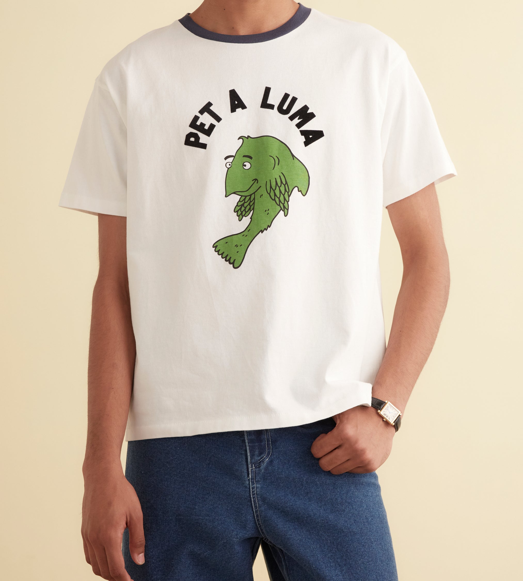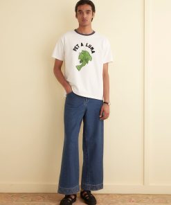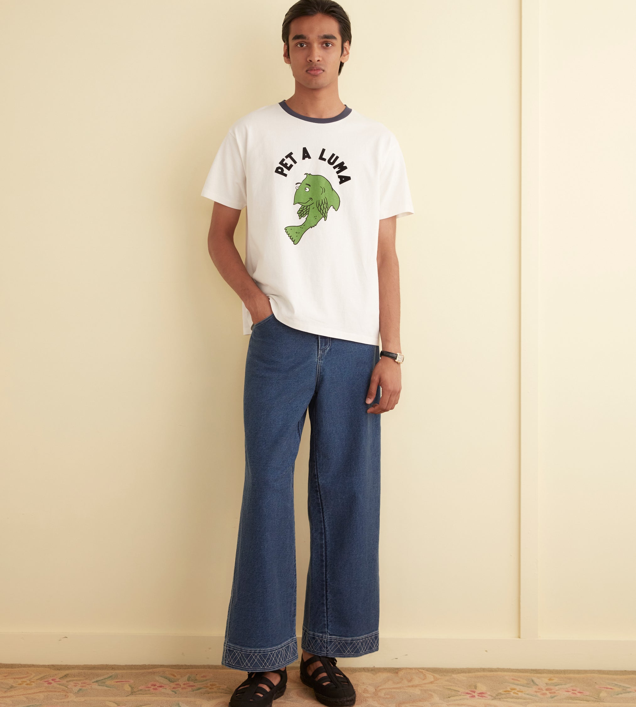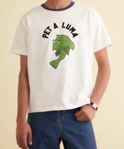 This shirt is inspired by a children’s souvenir tee, circa 1970s. We reimagined the original design, with its cartoon fish and ringer neckline, on a boxy tee with flocked lettering.