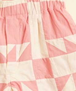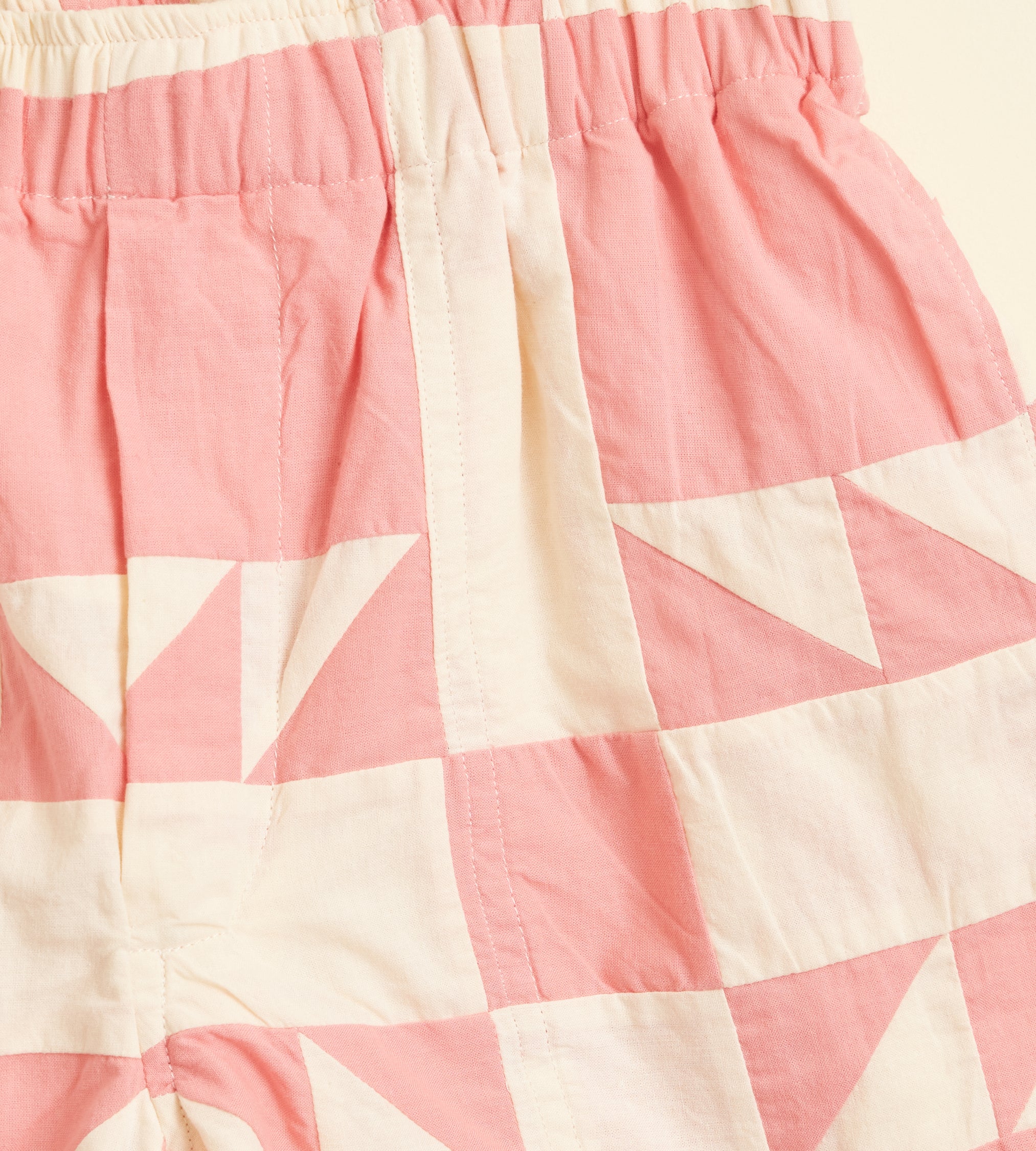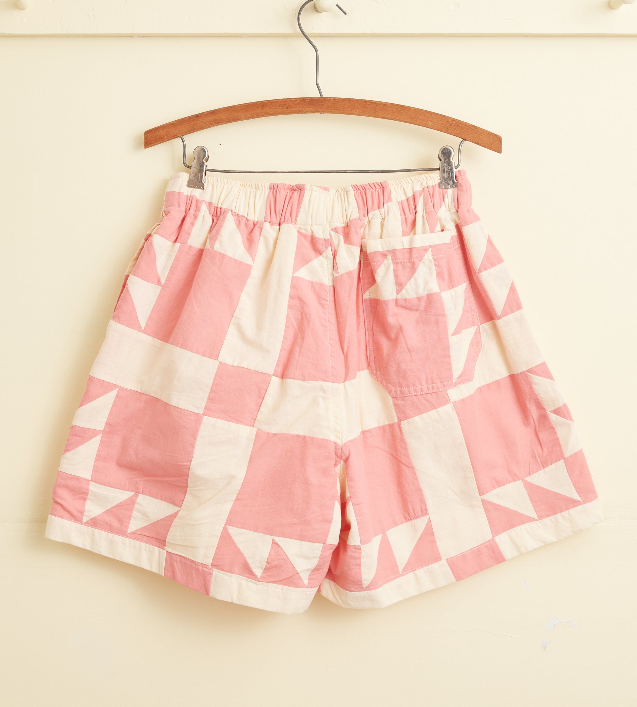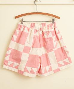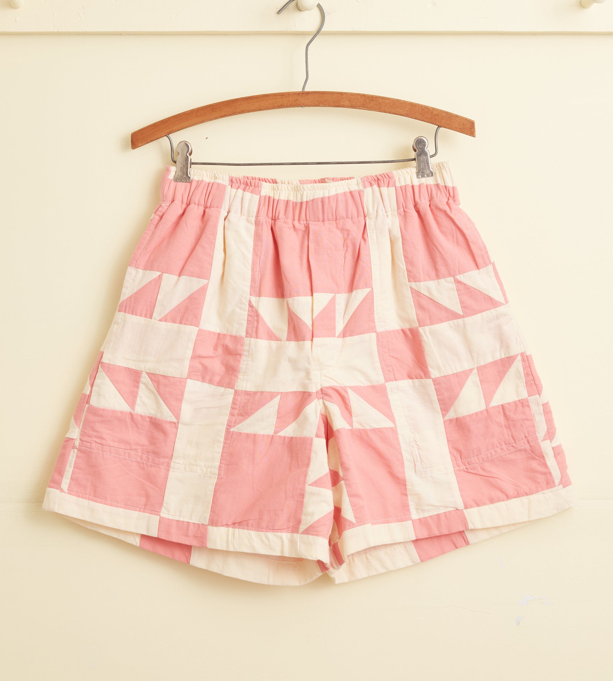 These shorts are inspired by an unfinished quilt from the early 20th century. We reproduced the quilt block, with its sawtooth triangles, for this style. The shorts are cut in a traditional rugby silhouette, with a short inseam and a wide leg opening.