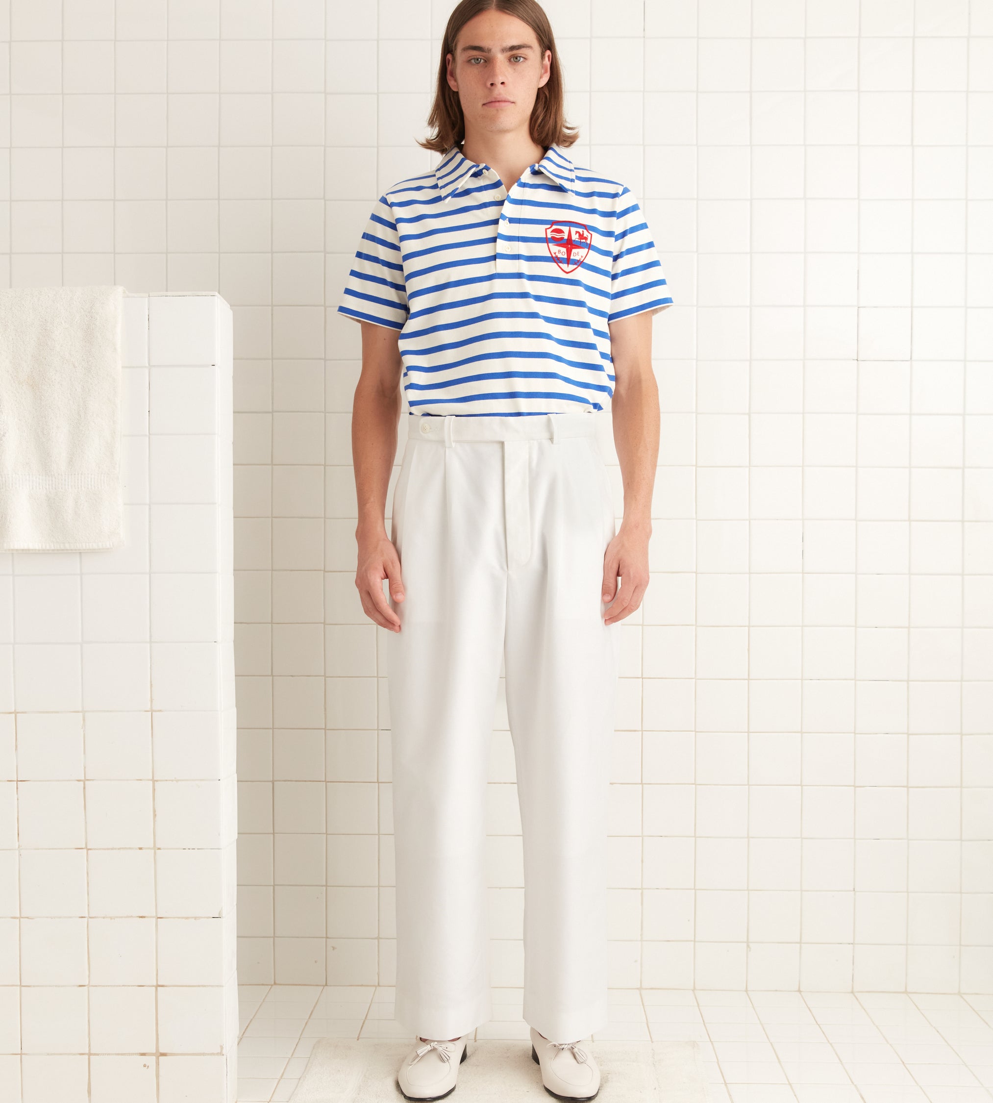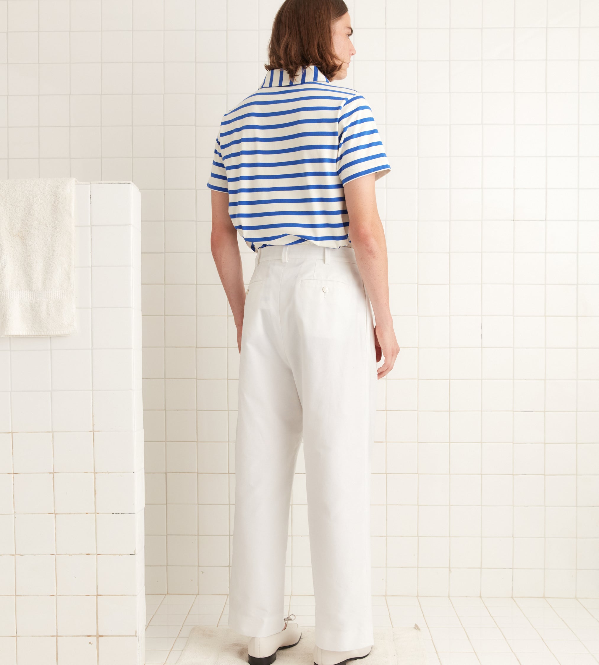 These trousers are inspired by men’s pants from the midcentury. We reproduced the silhouette in piqué cotton for this style. The trousers have a mid-rise and a wide-leg fit.