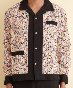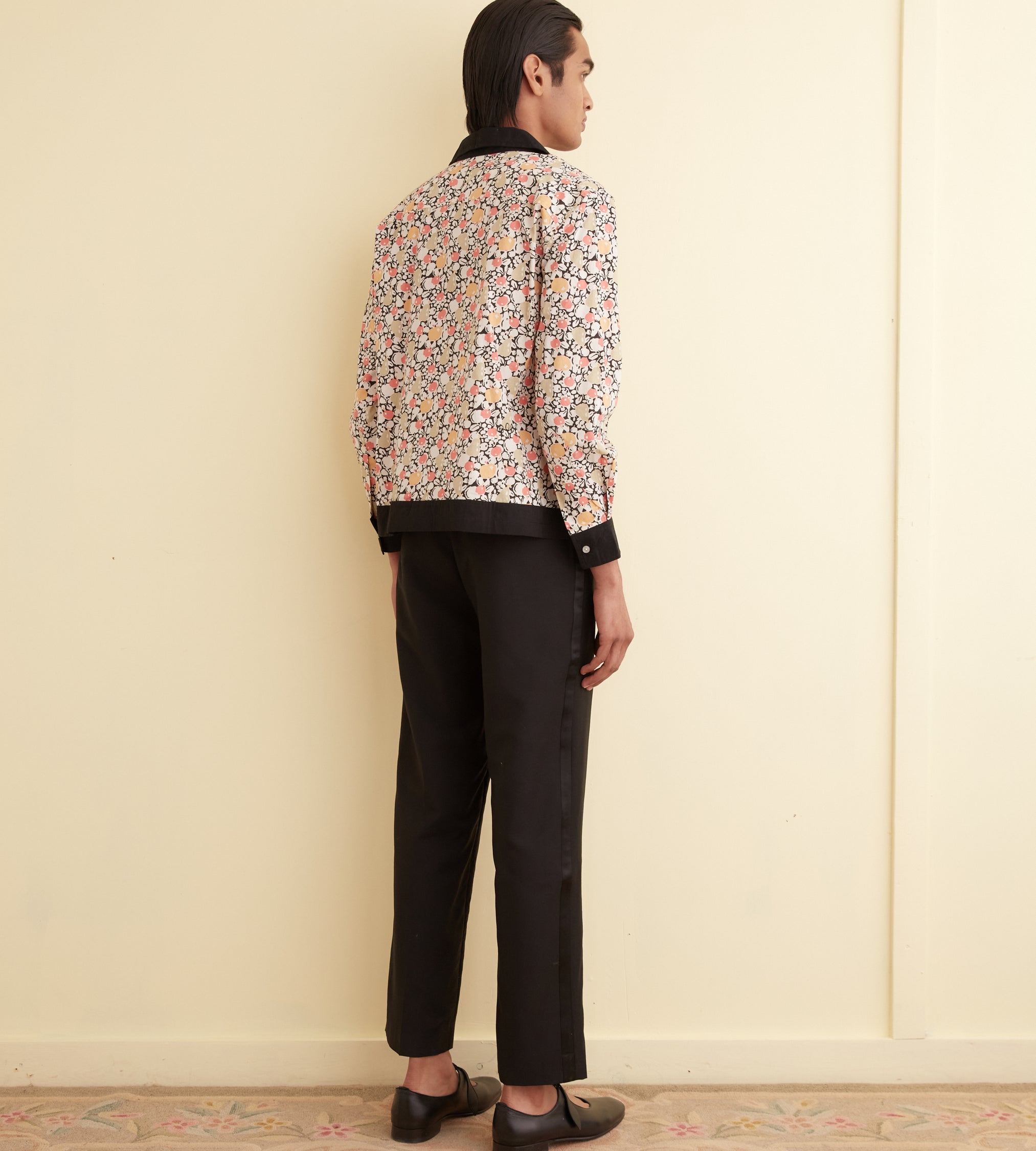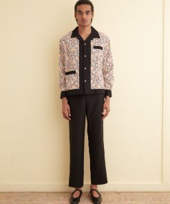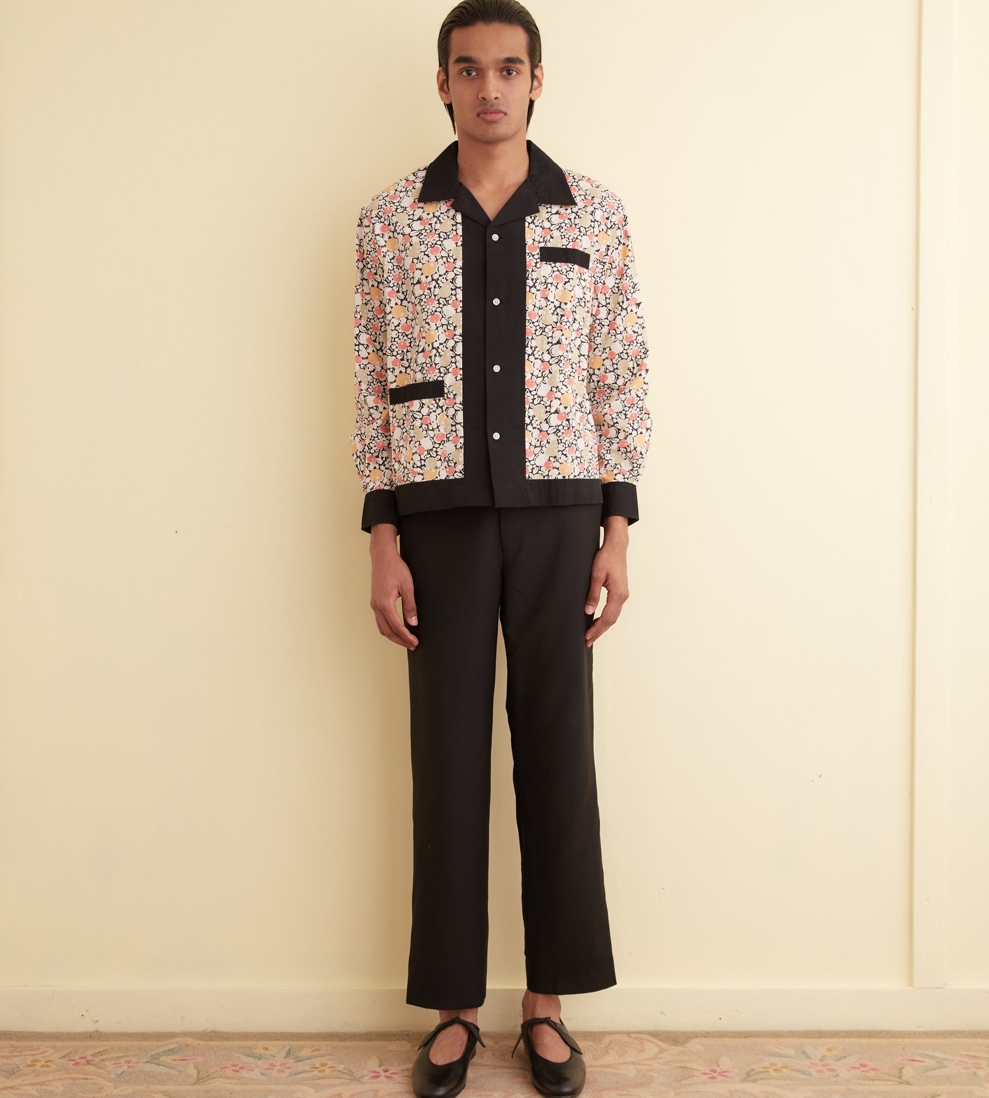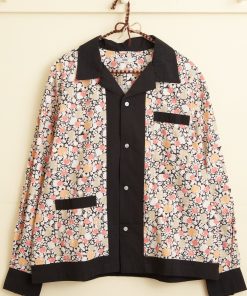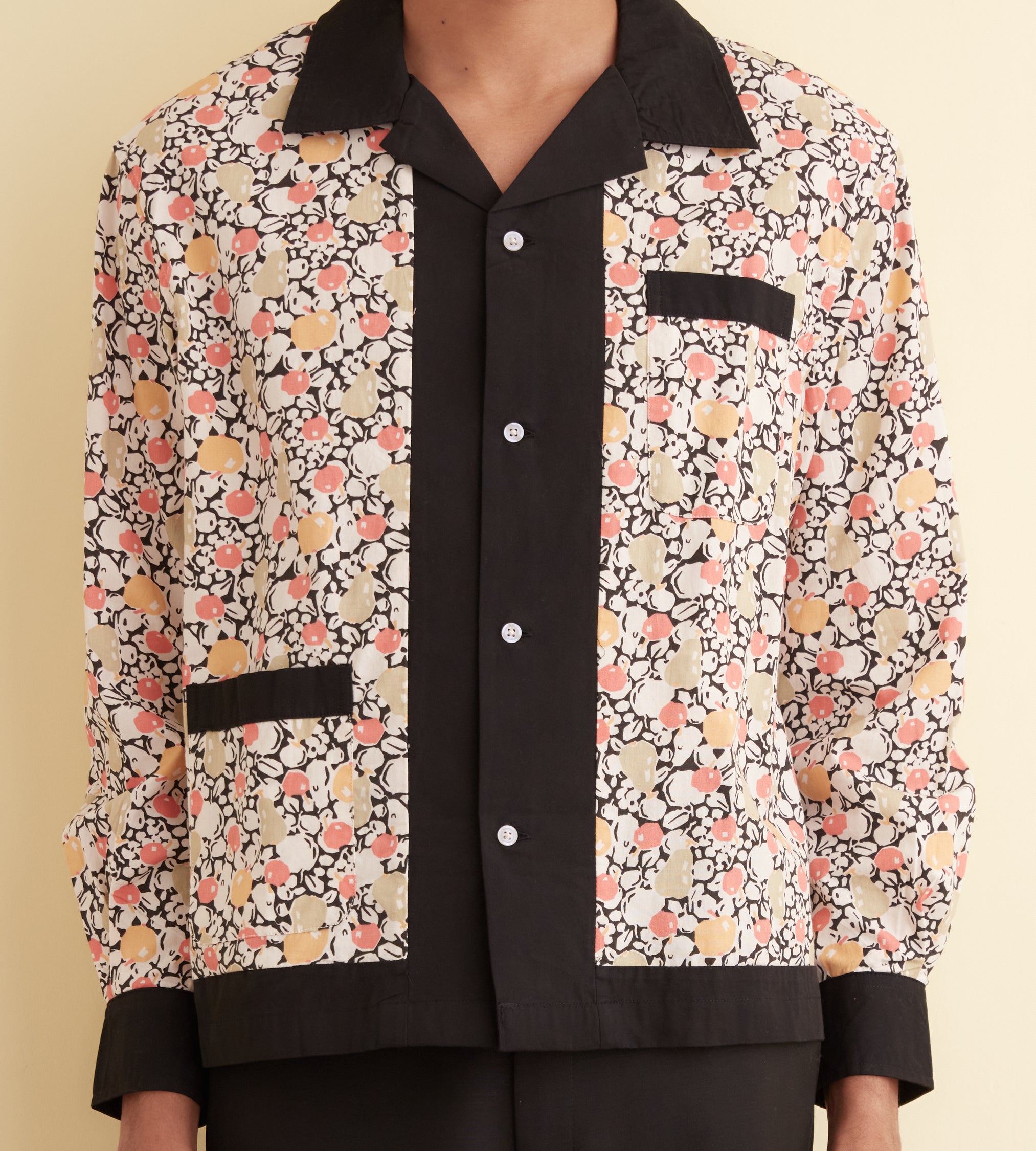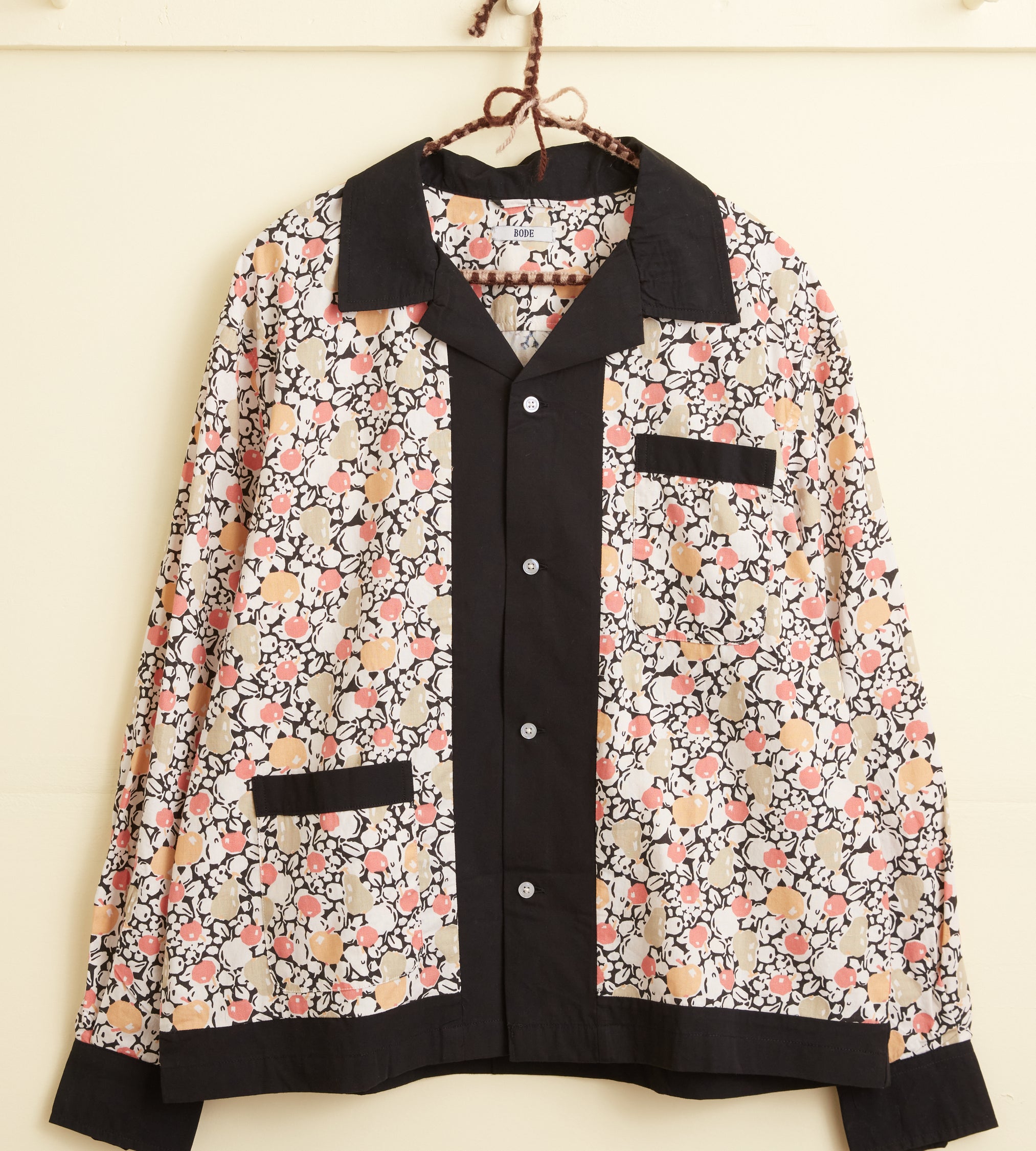This long sleeve shirt is inspired by a 1920s dresser scarf. The printed cotton is a faithful reproduction of the motif found on the original dresser scarf featuring pears and cherries.