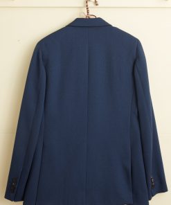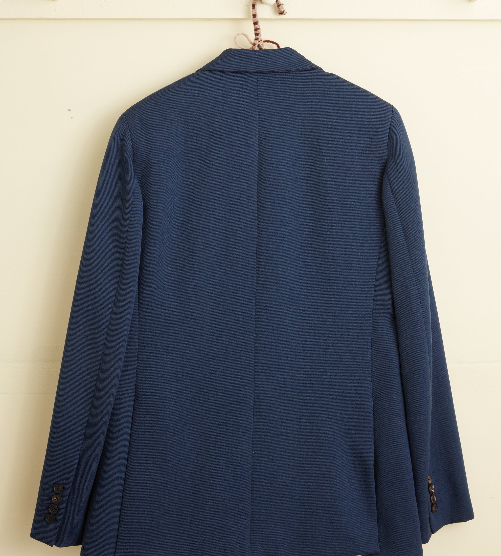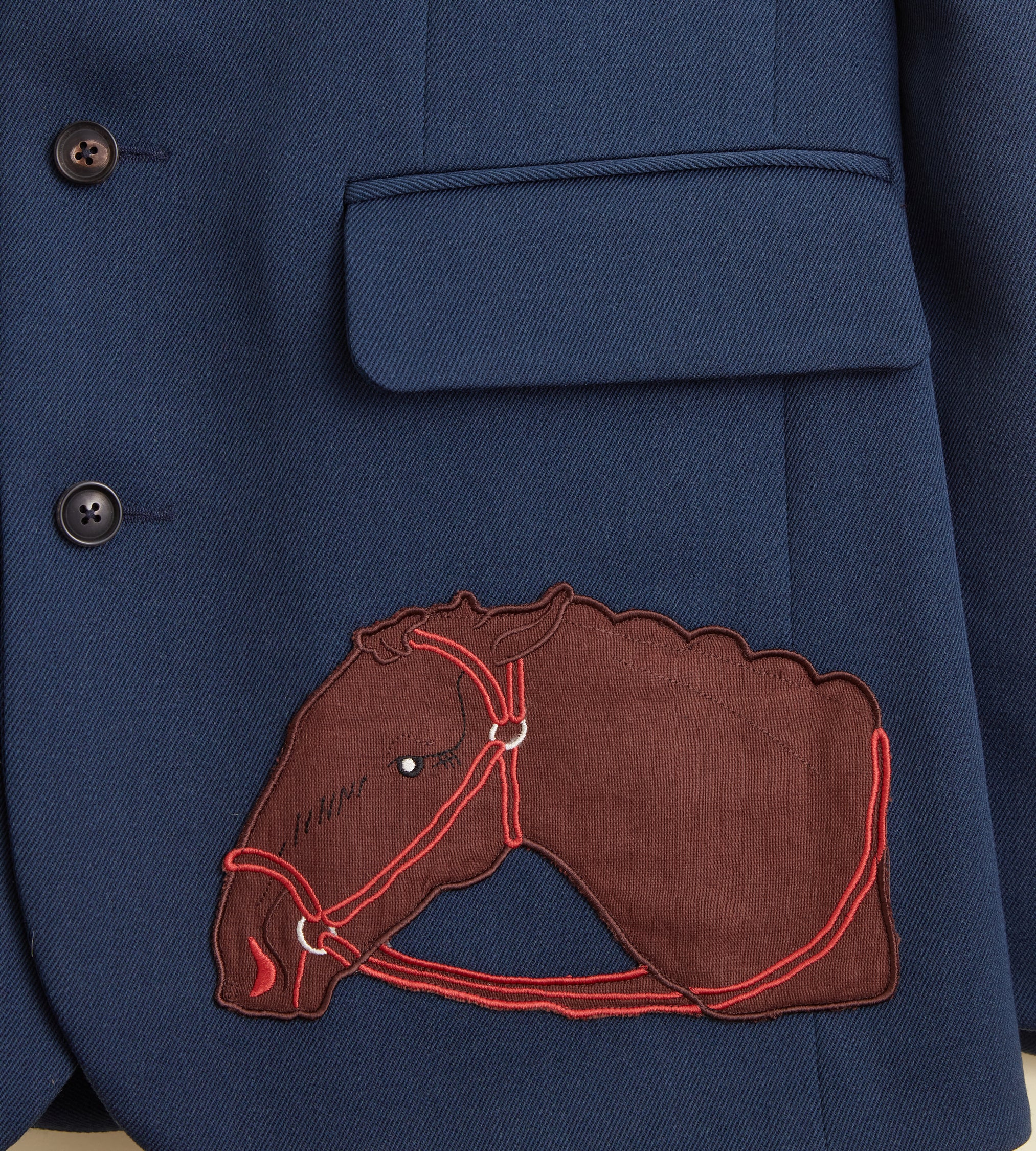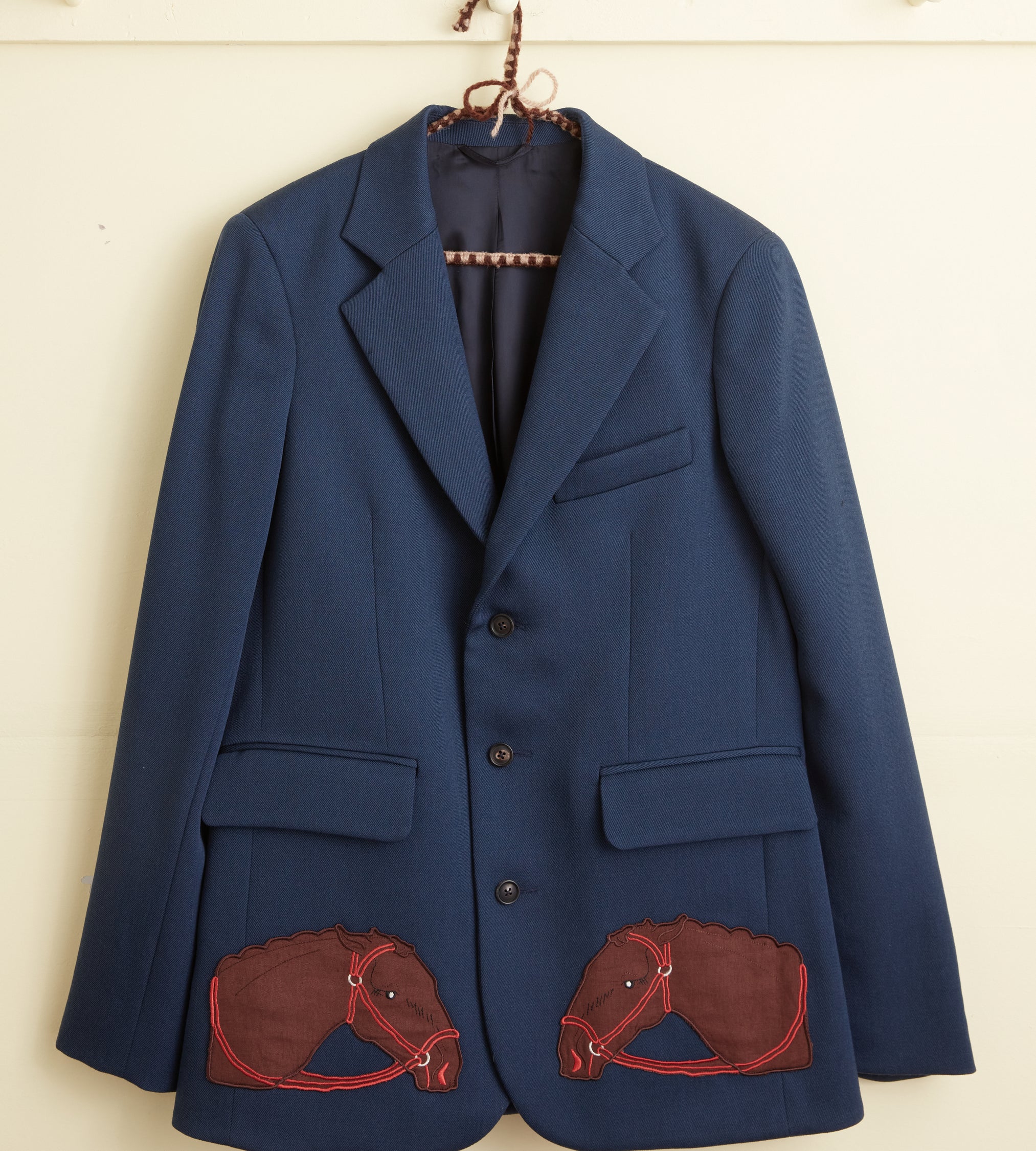 This jacket features reproductions of appliqué patches from the 1940s. The appliqué patch was faithfully reproduced from a dress that belonged to Emily as a child. This suit jacket pairs with matching trousers or can be worn as separates.