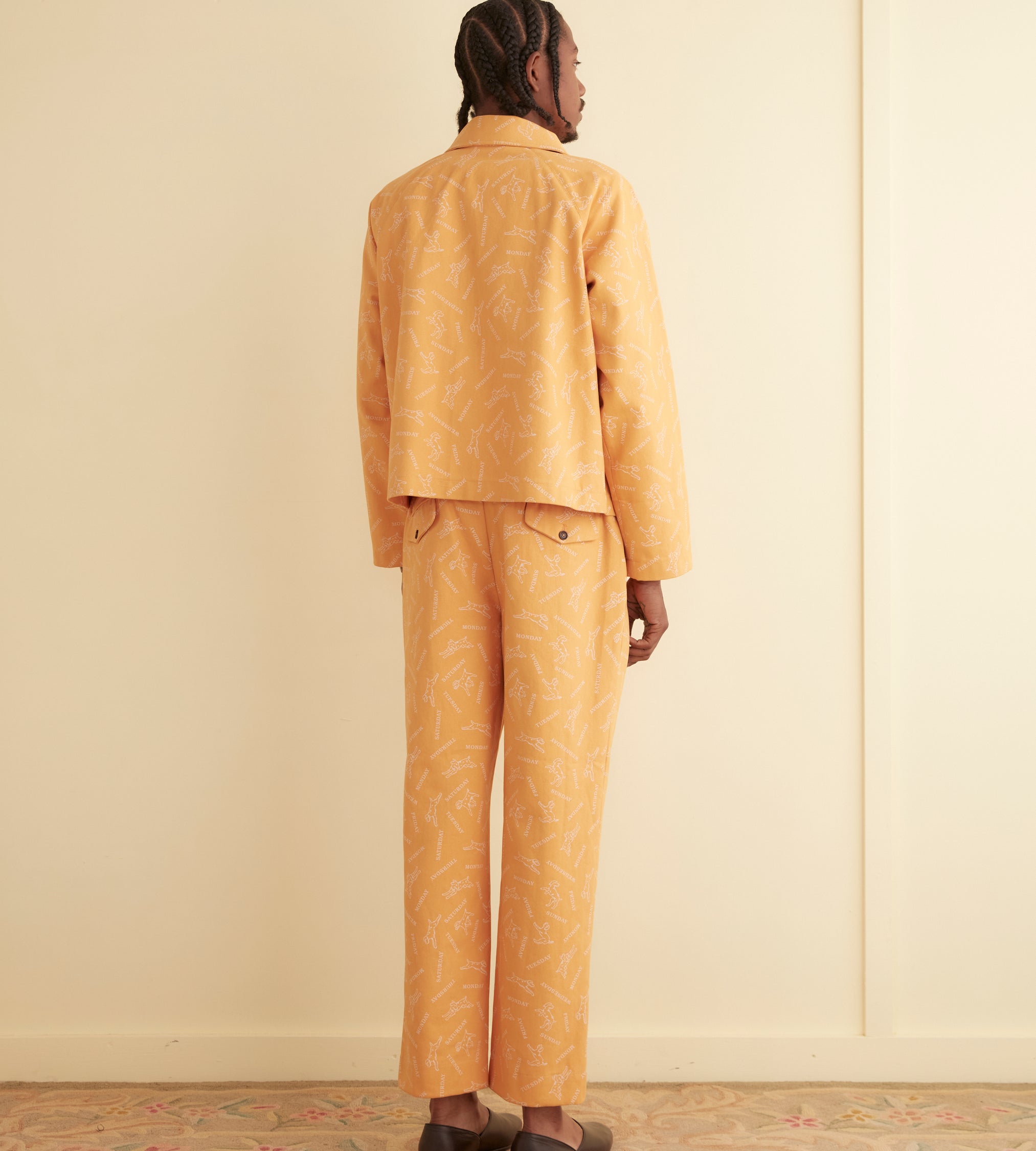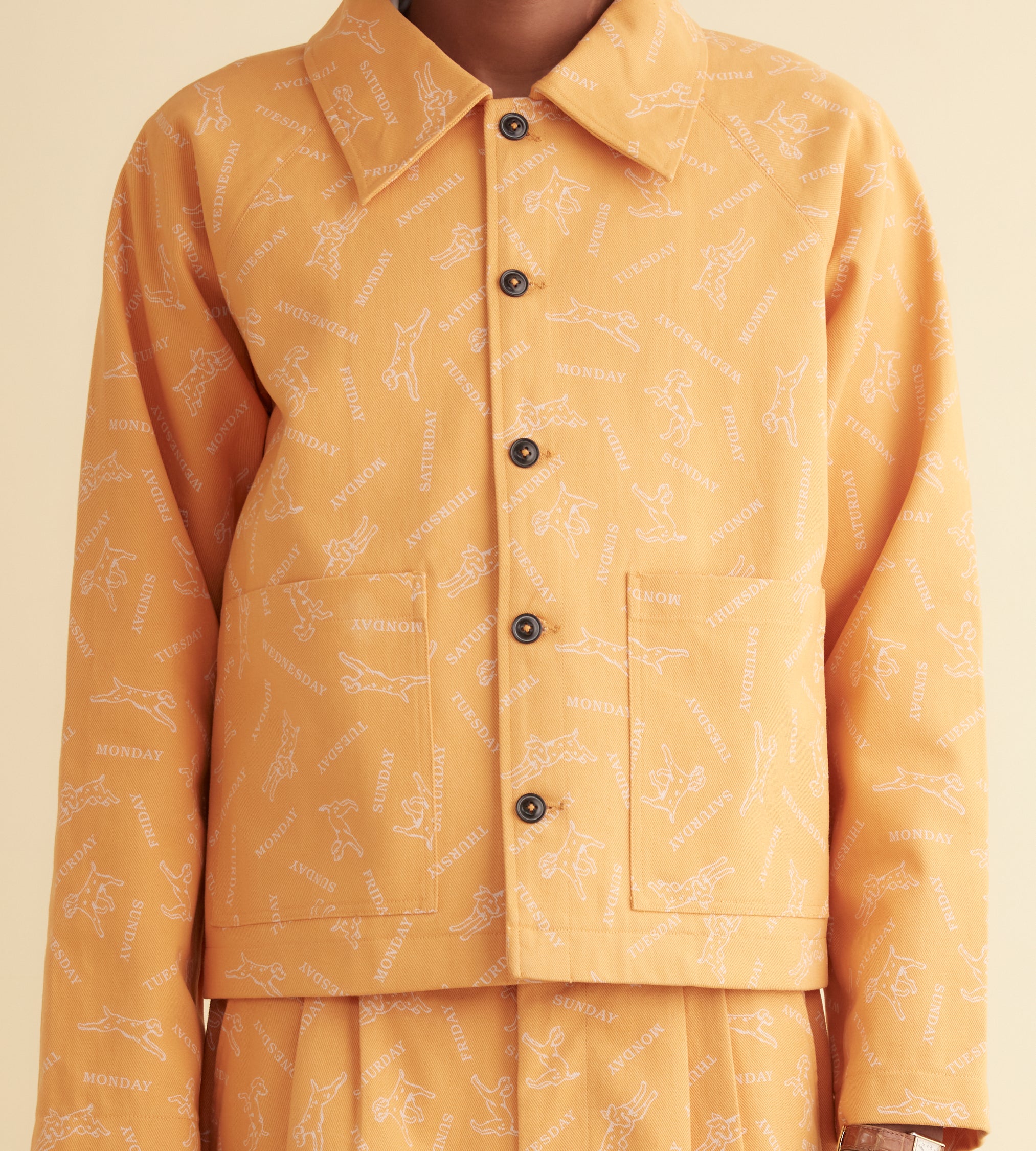 This jacket is inspired by a novelty printed set, circa 1965. We recreated the print with illustrations of Monday, a German Wirehaired Pointing Griffon, and the days of the week. The jacket is made of heavyweight cotton and cut in a classic workwear silhouette.