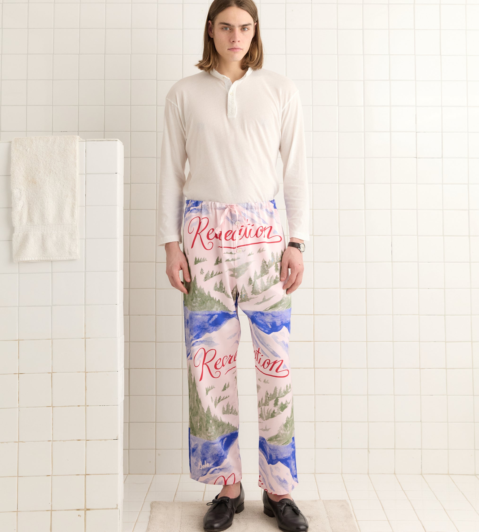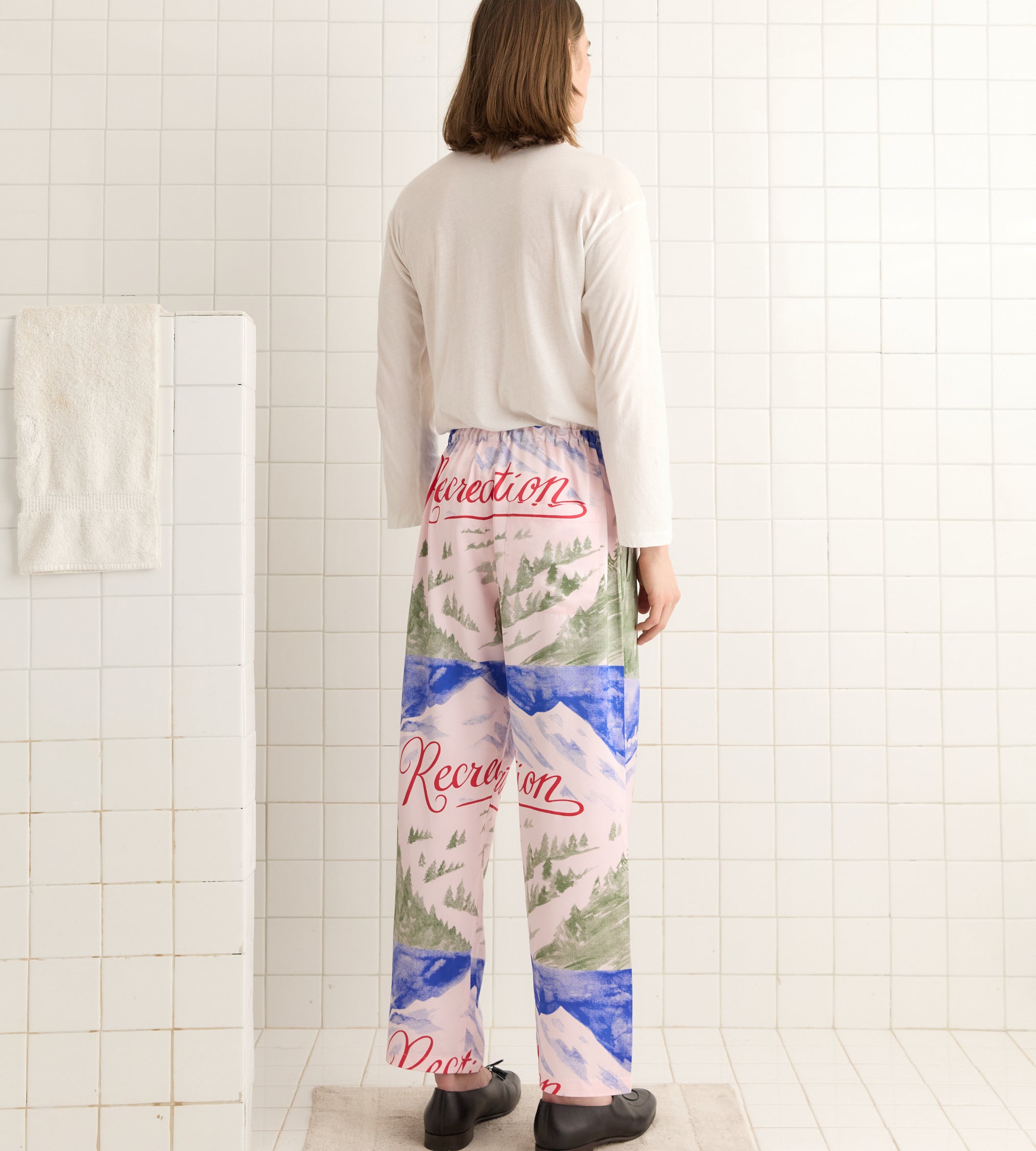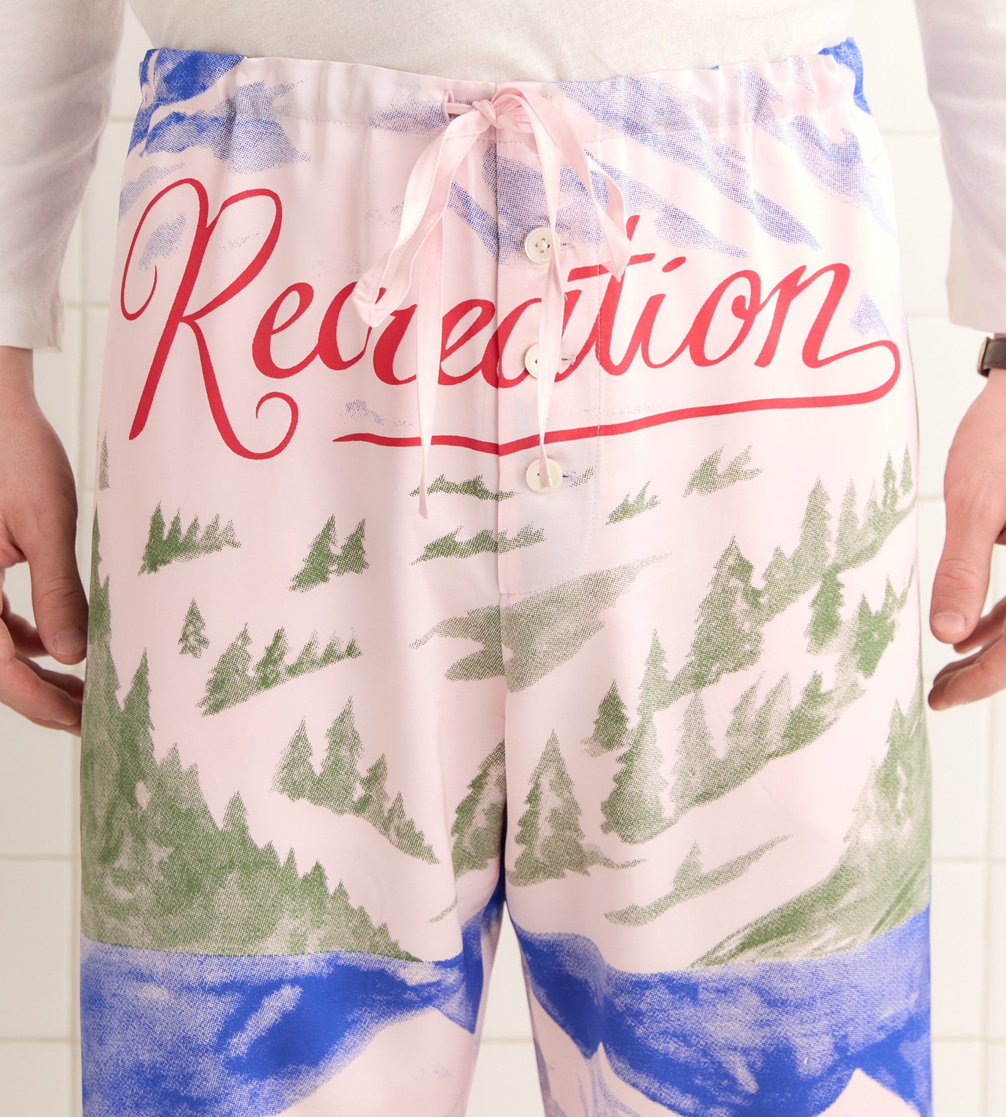 These pajama pants are inspired by a vintage woven label. We recreated the snowy mountain scene for this style. The pattern is printed by hand, with some variations throughout.