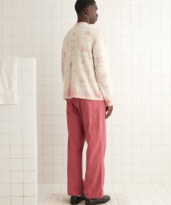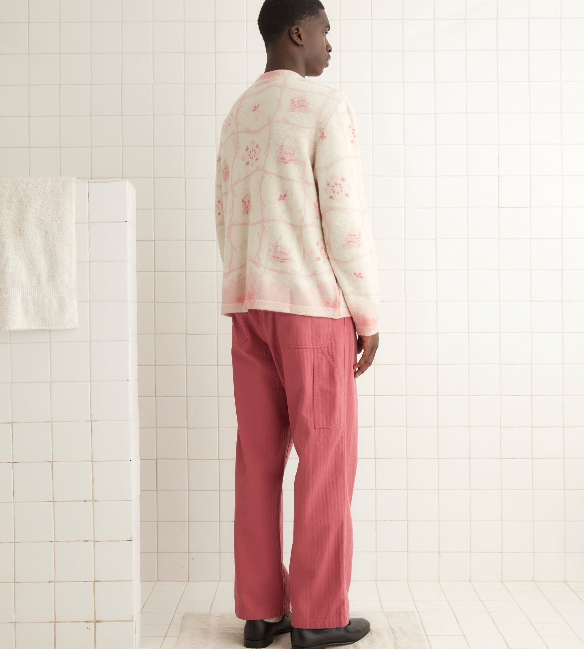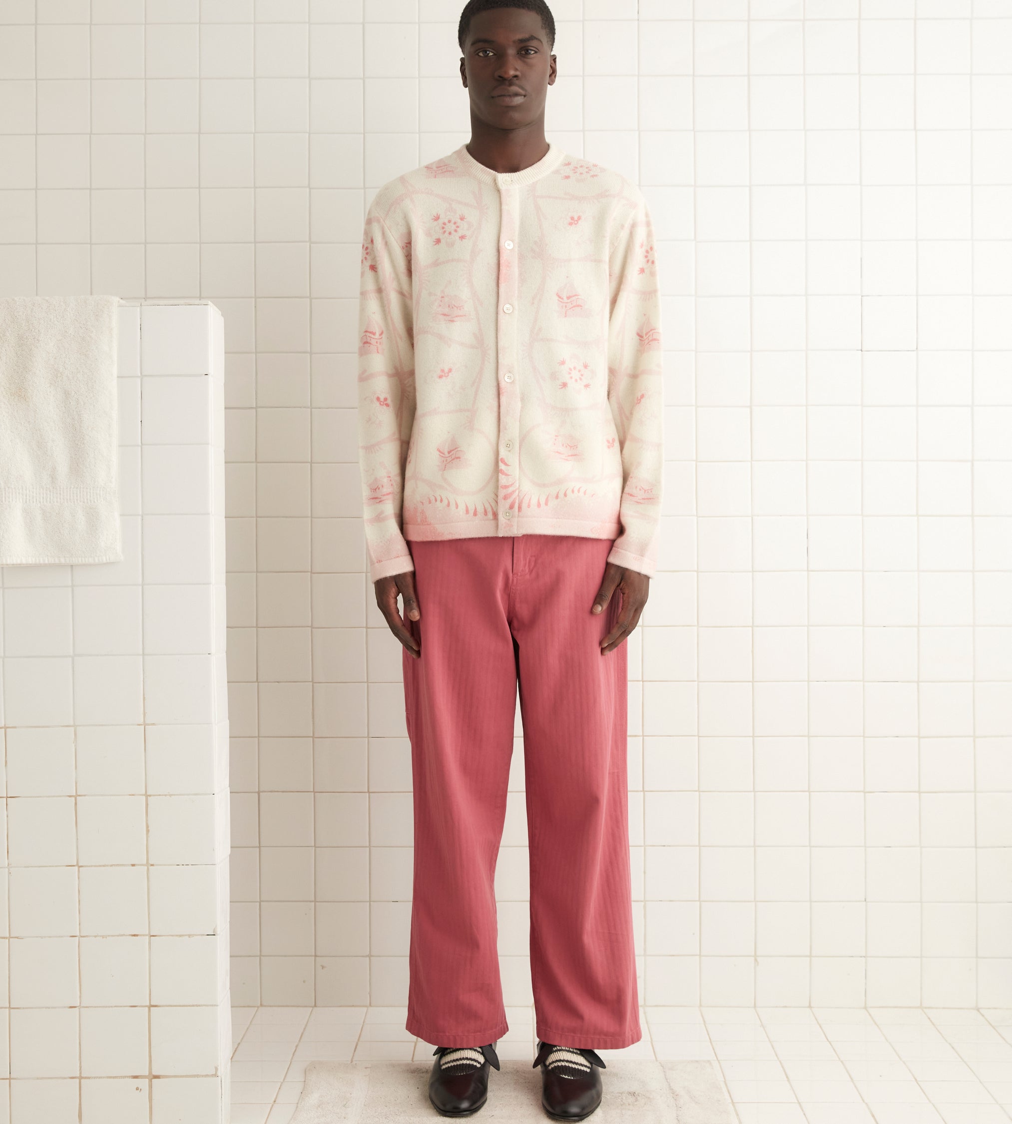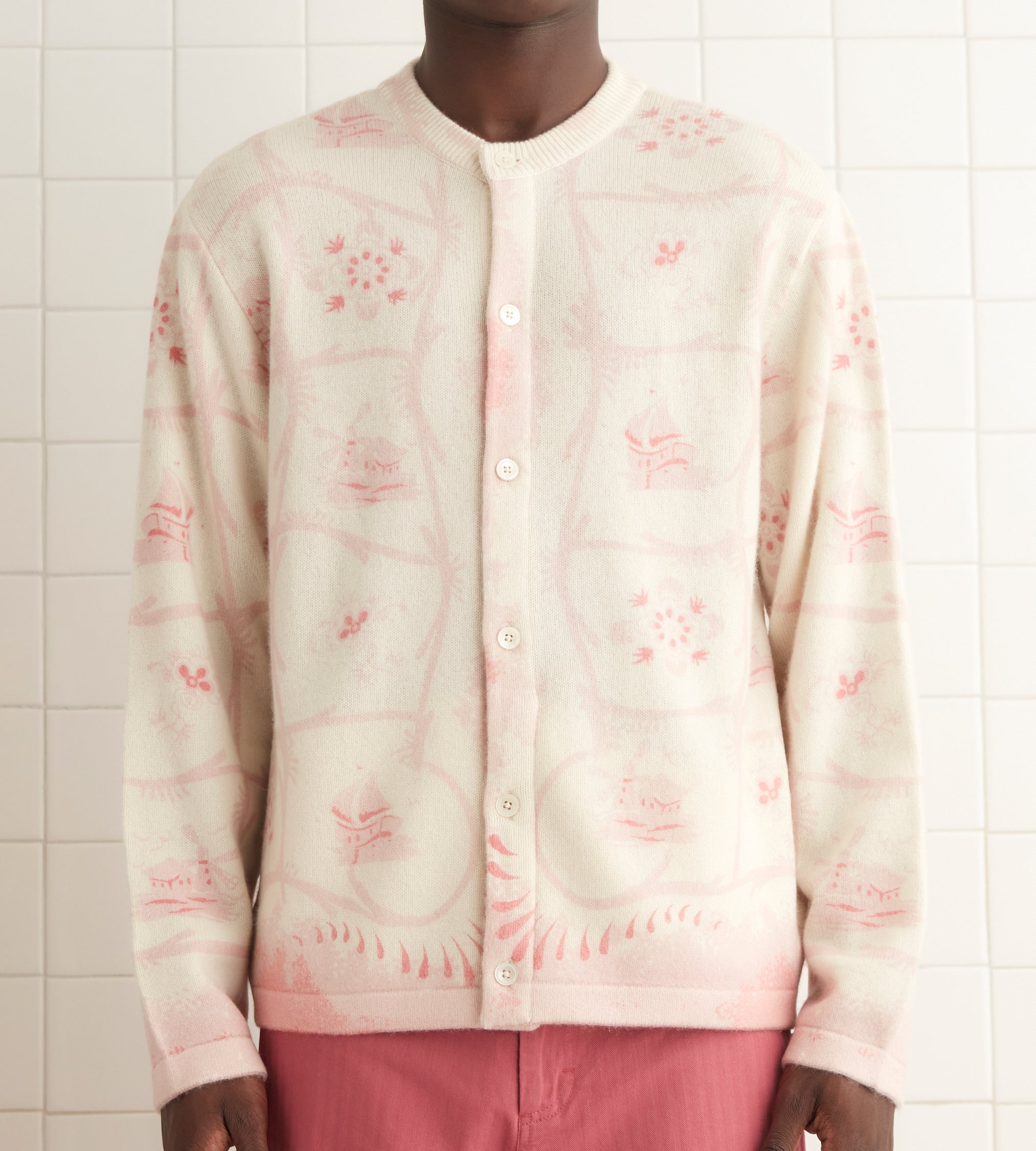 This cardigan is inspired by a novelty sweater from the 1950s-1960s. The original was printed with a floral, ship, and windmill pattern, which we have replicated here.