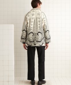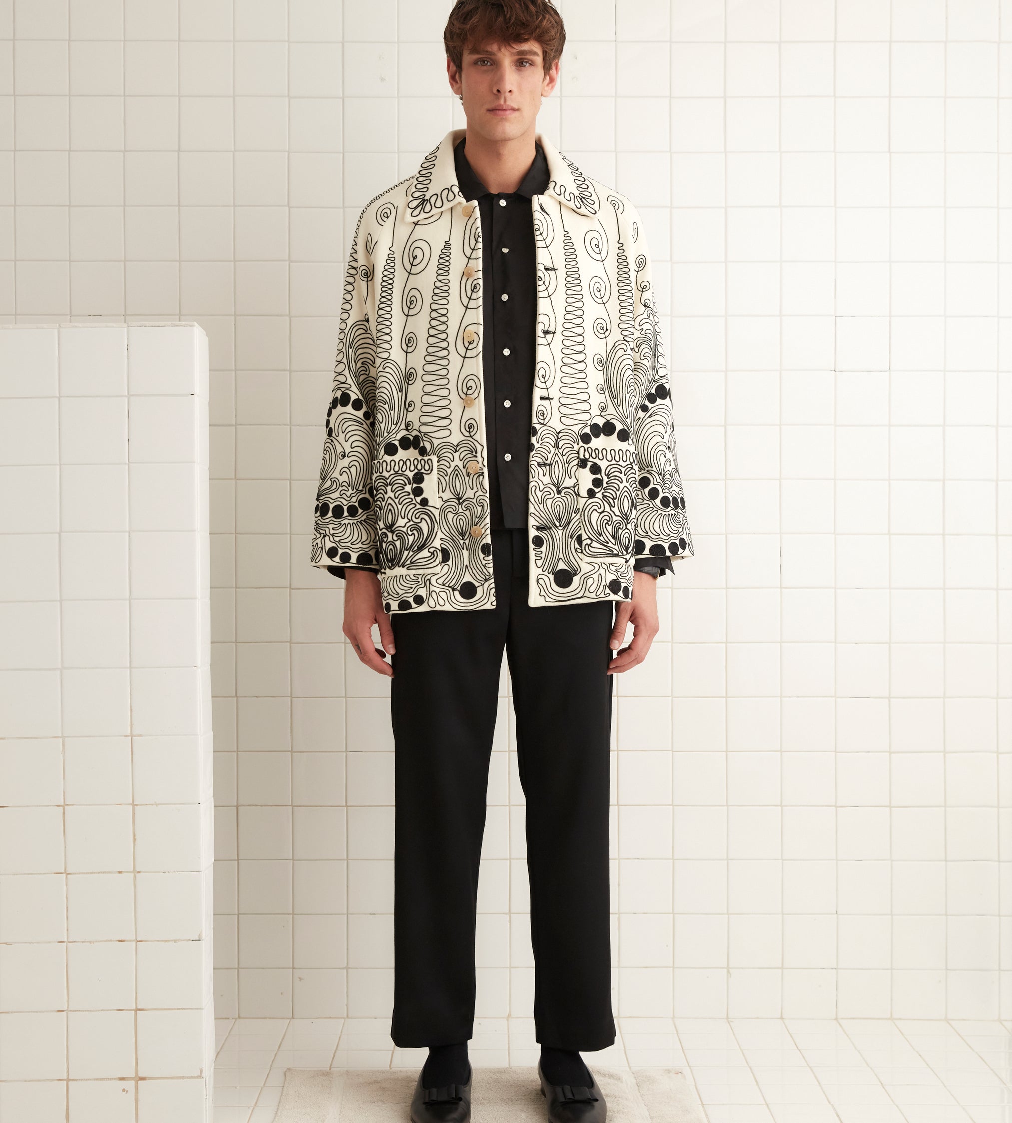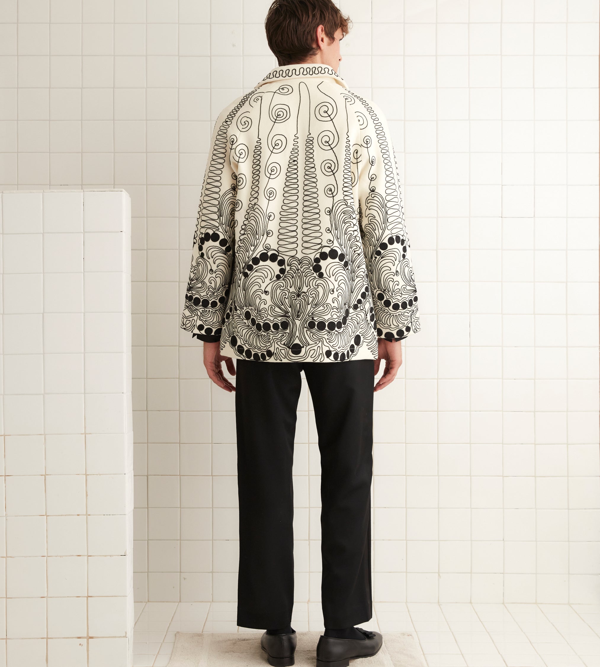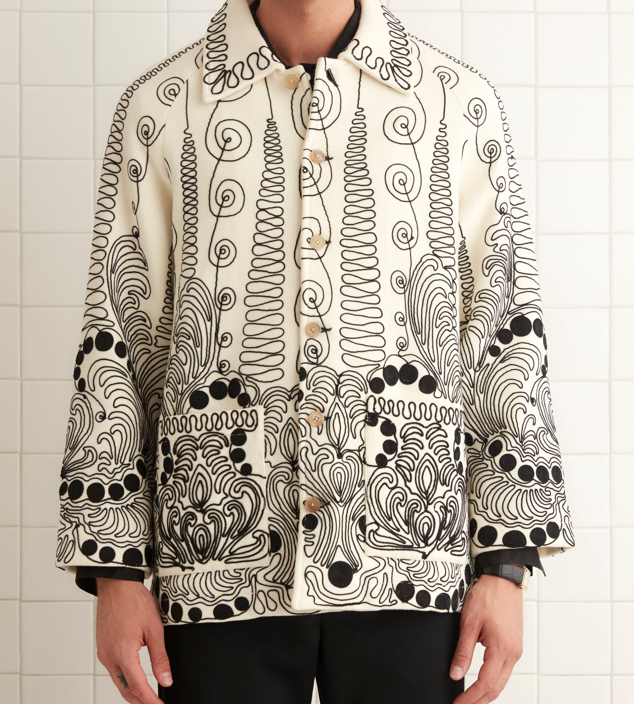 We reproduced a section of antique soutache embroidery, worked in rippling, feathered patterns, on this felted wool coat.