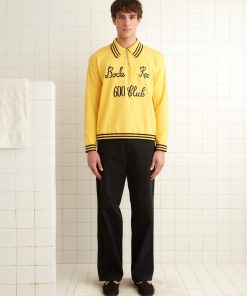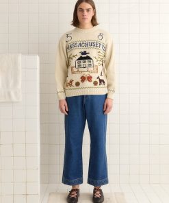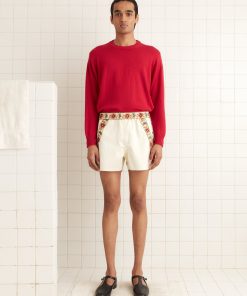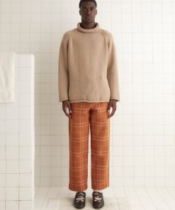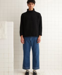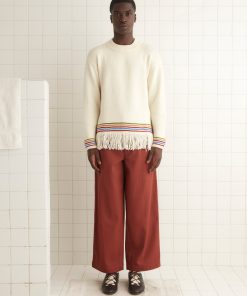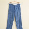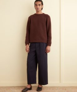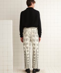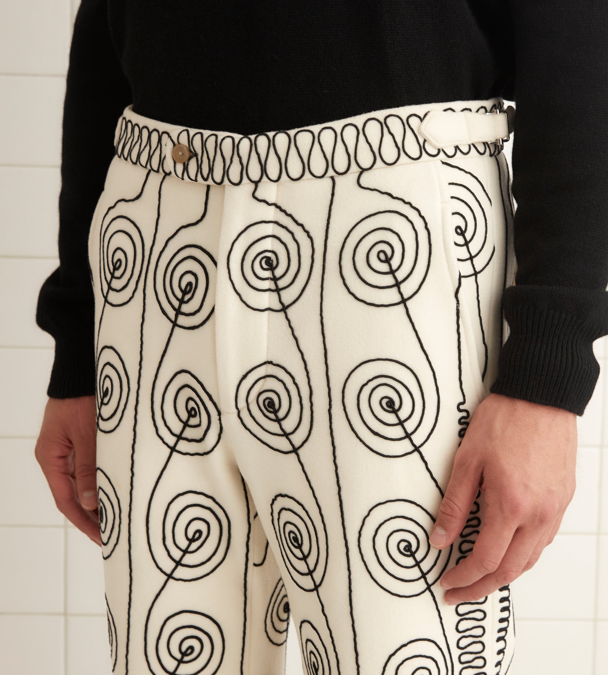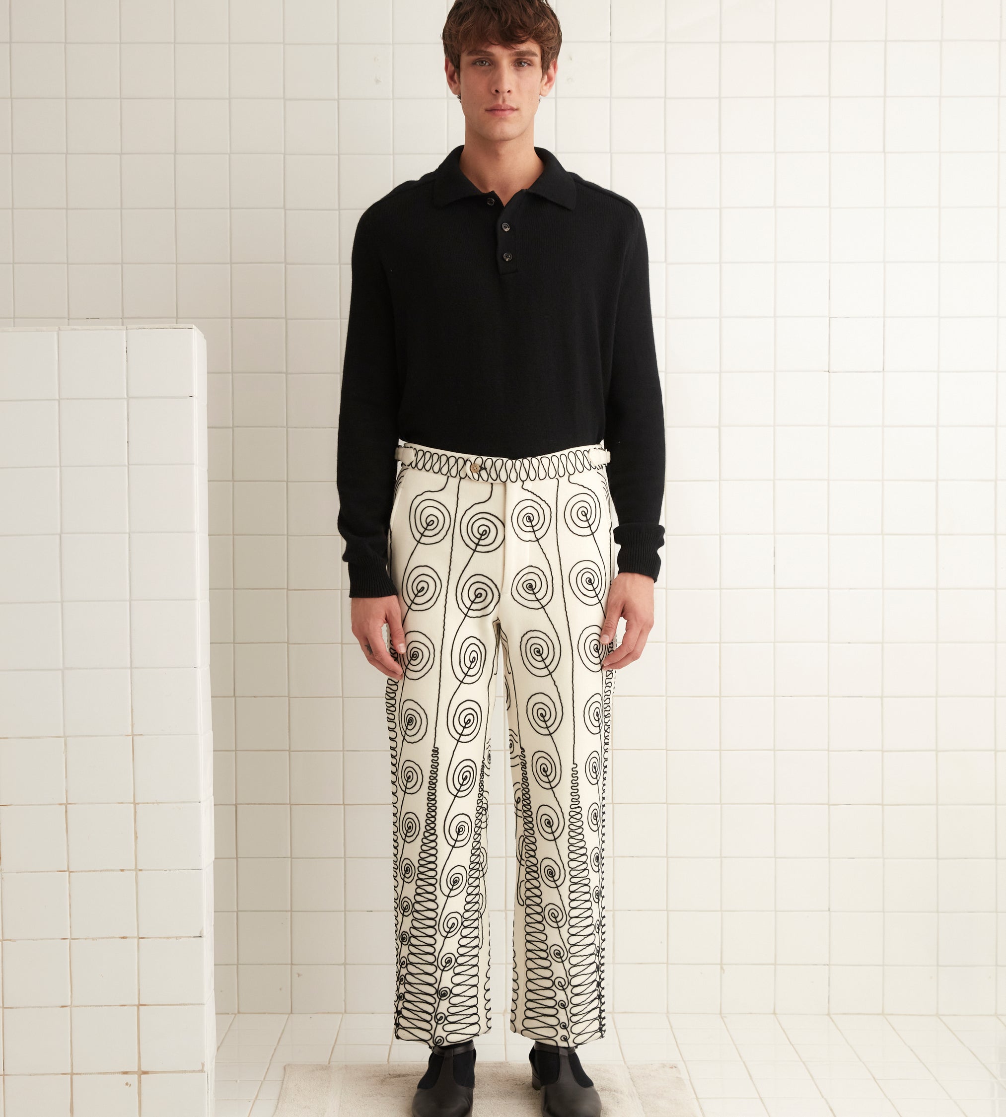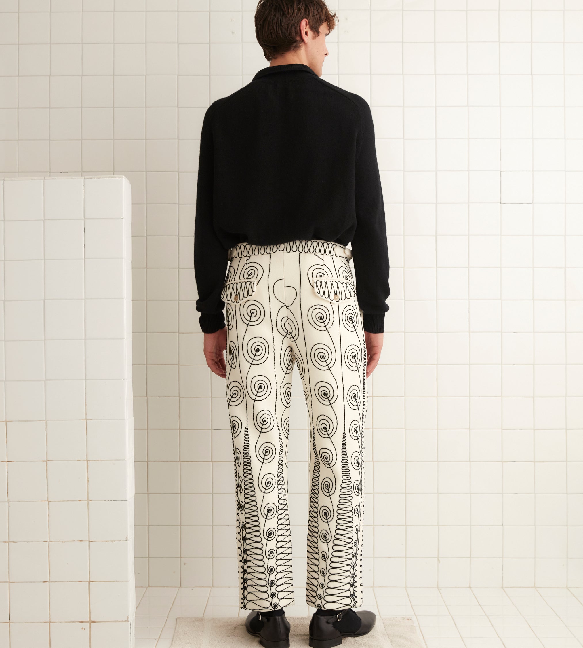 We reproduced a section of antique soutache embroidery, worked in rippling, feathered patterns, on these felted wool trousers, which have a mid-rise and a straight leg.