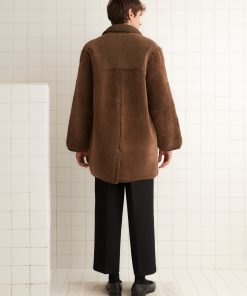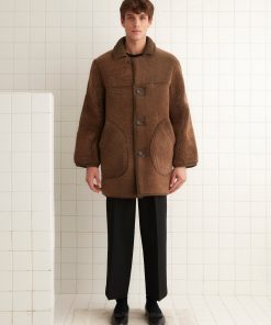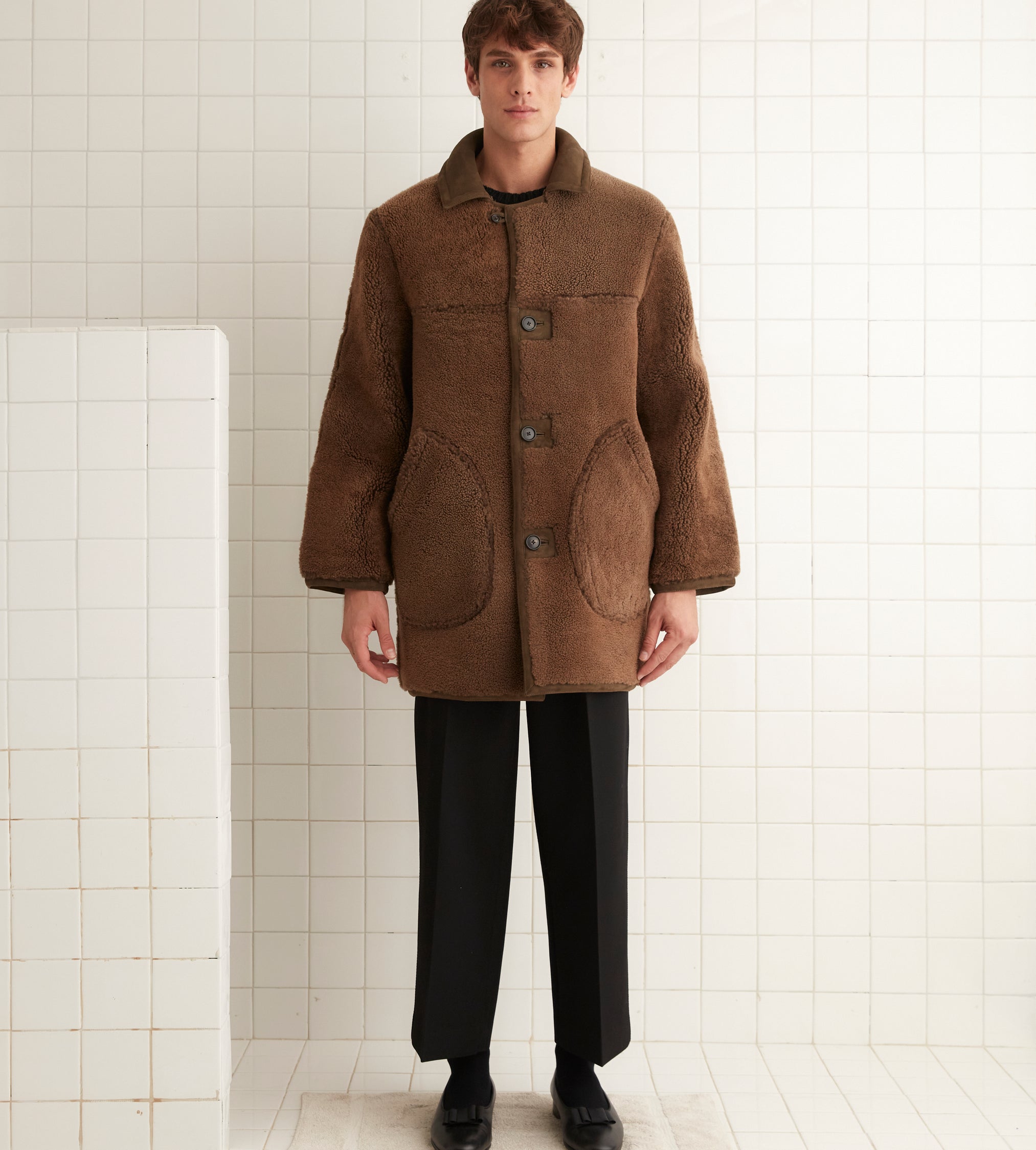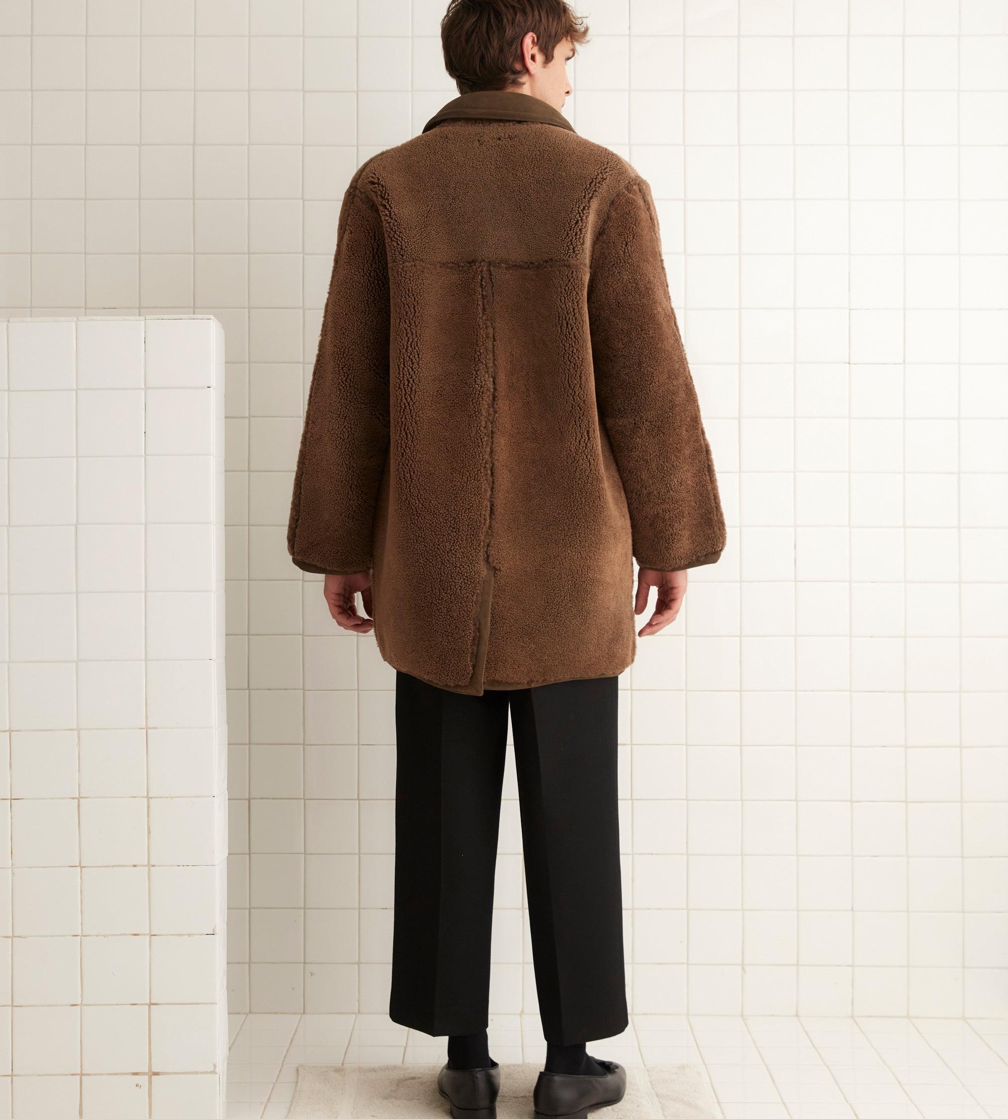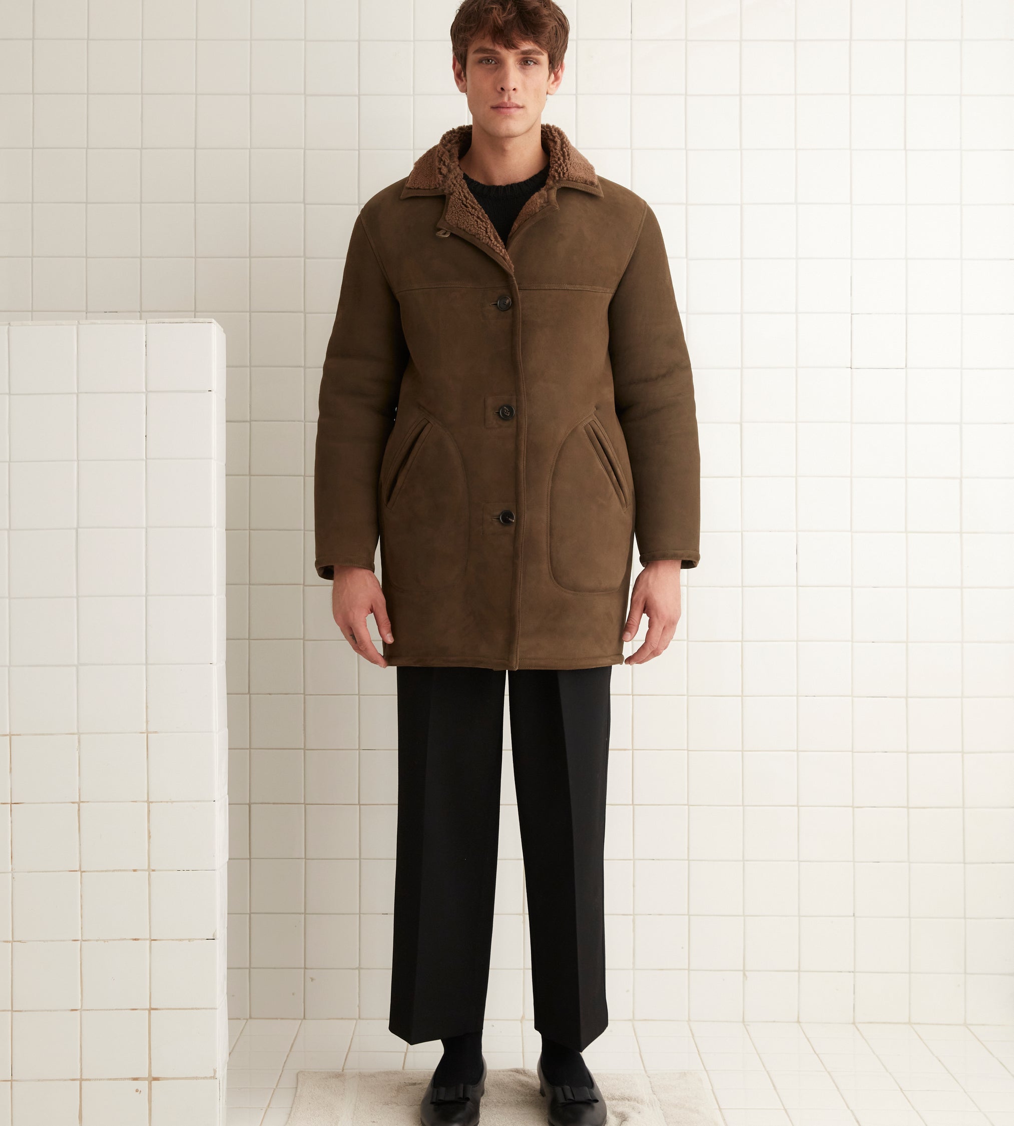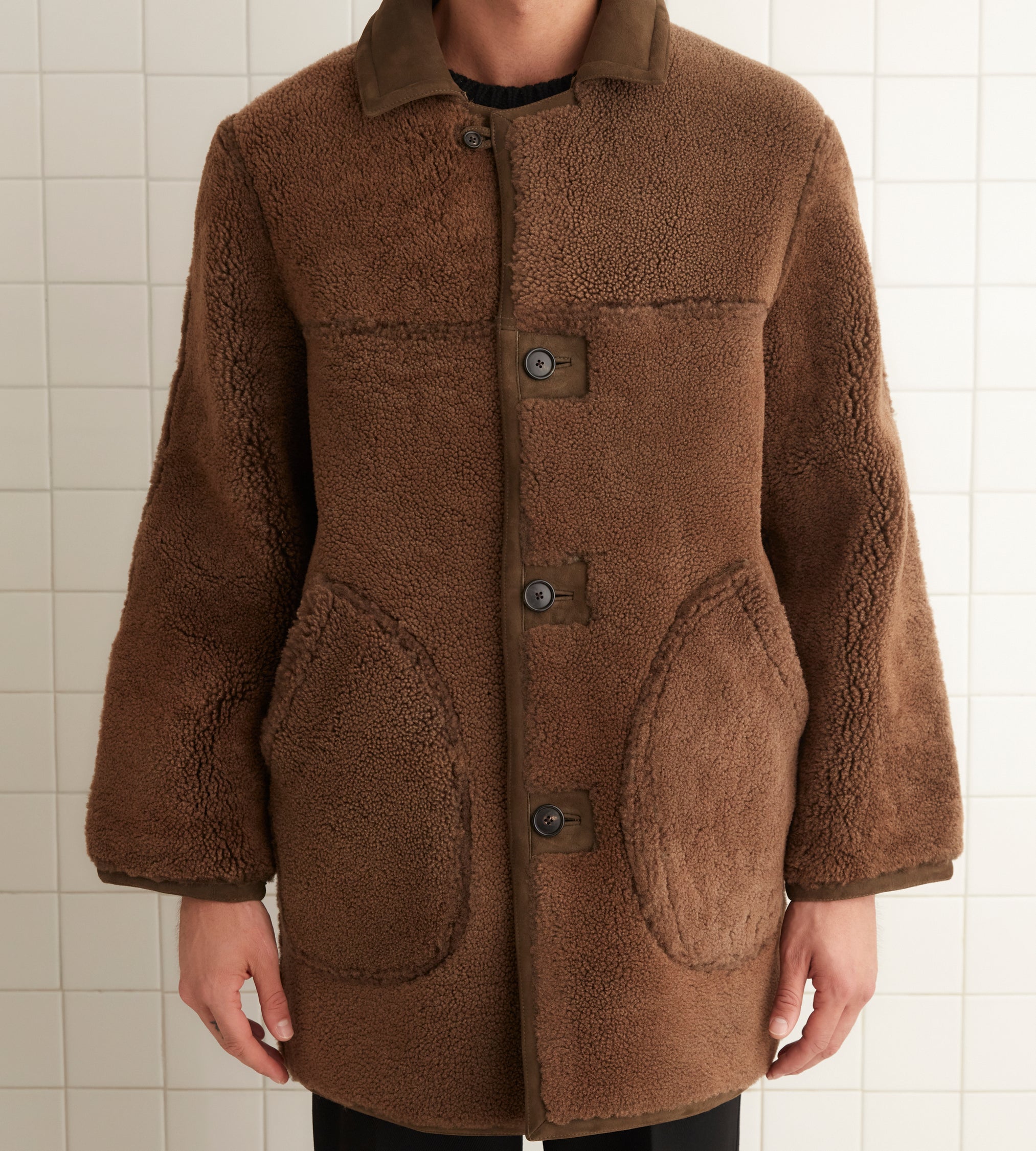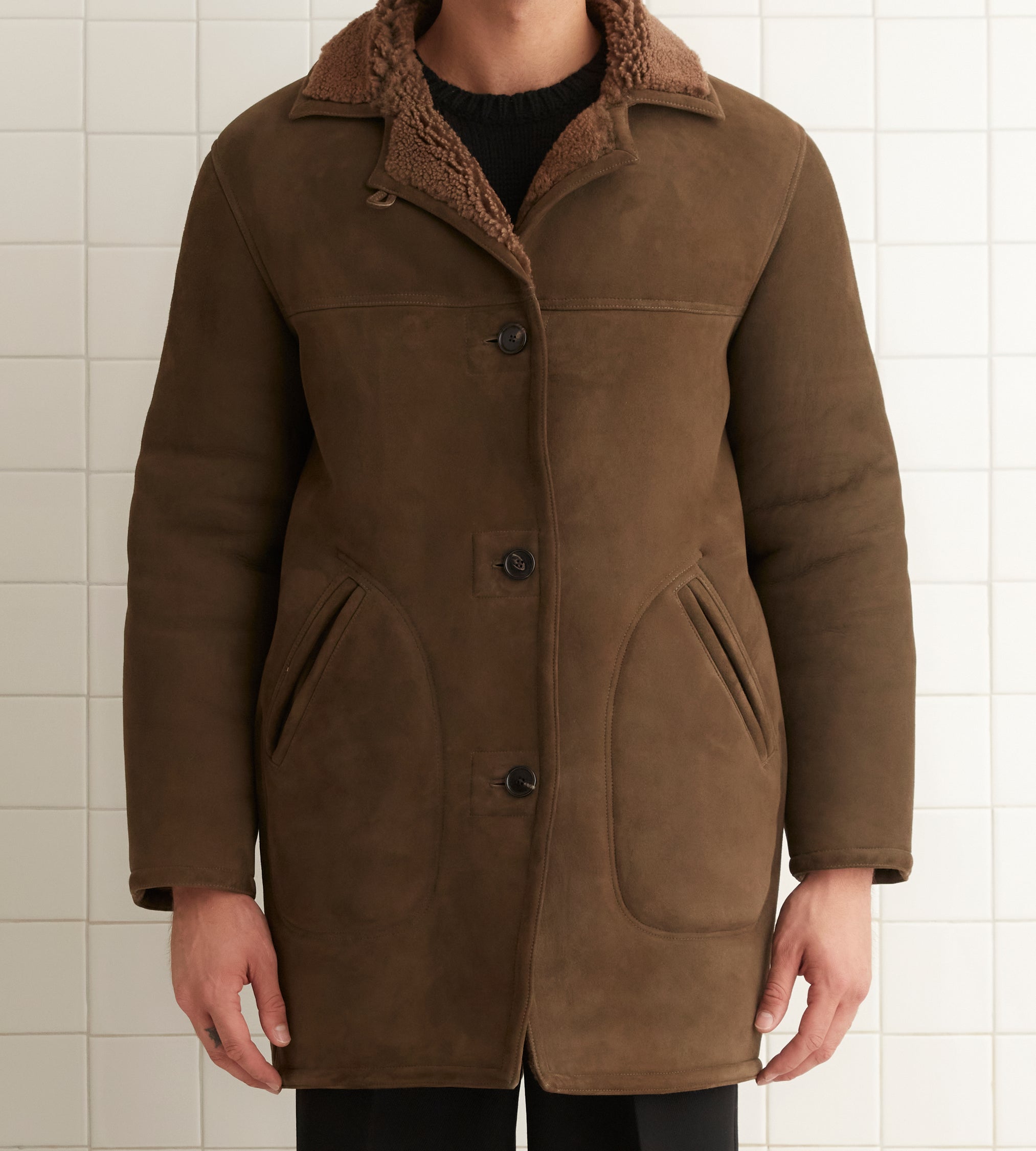 This coat is a historical reproduction of a shearling and suede ranch coat from the 1950s. It is reversible and can be worn either with the shearling or the suede facing out.