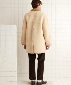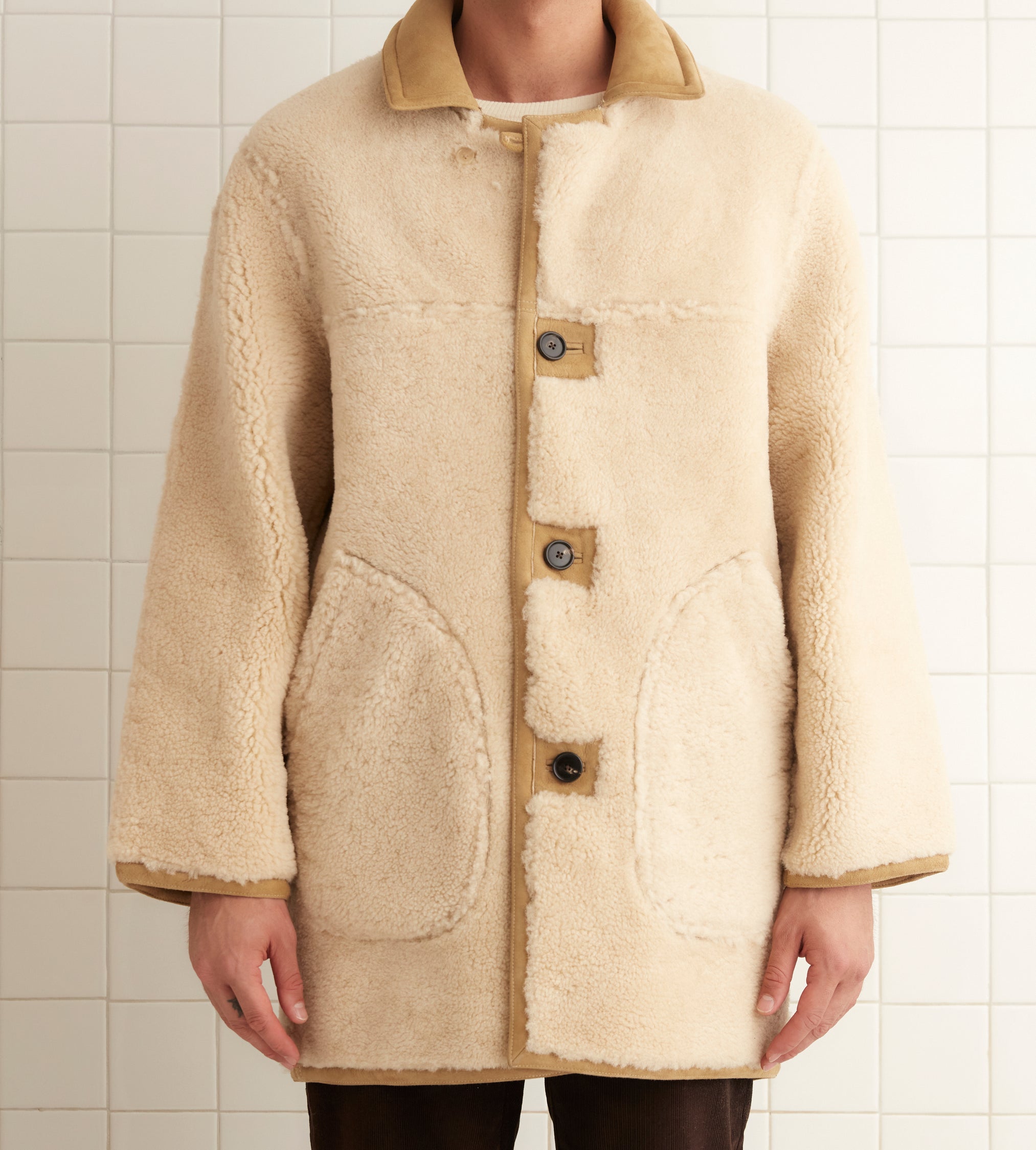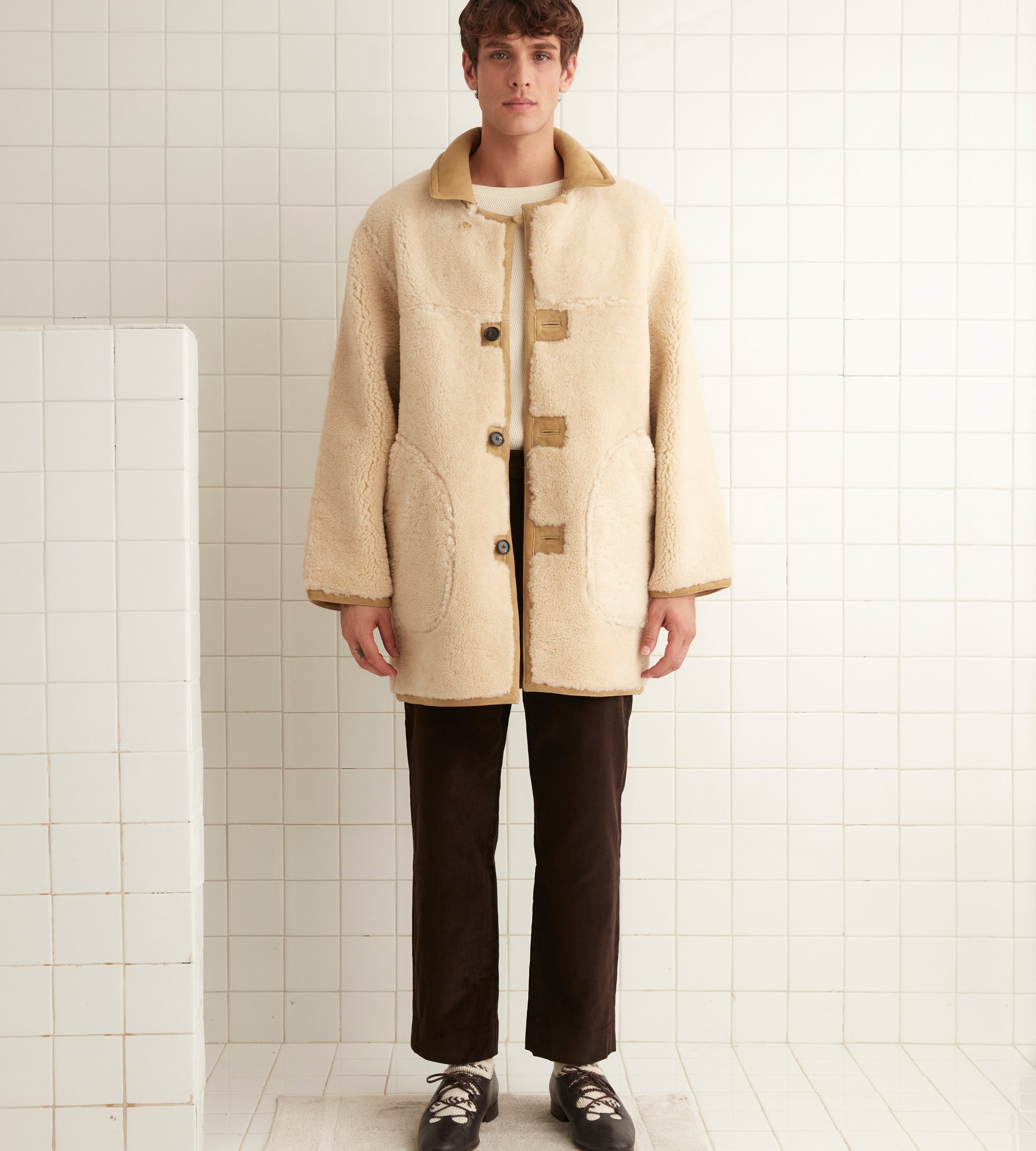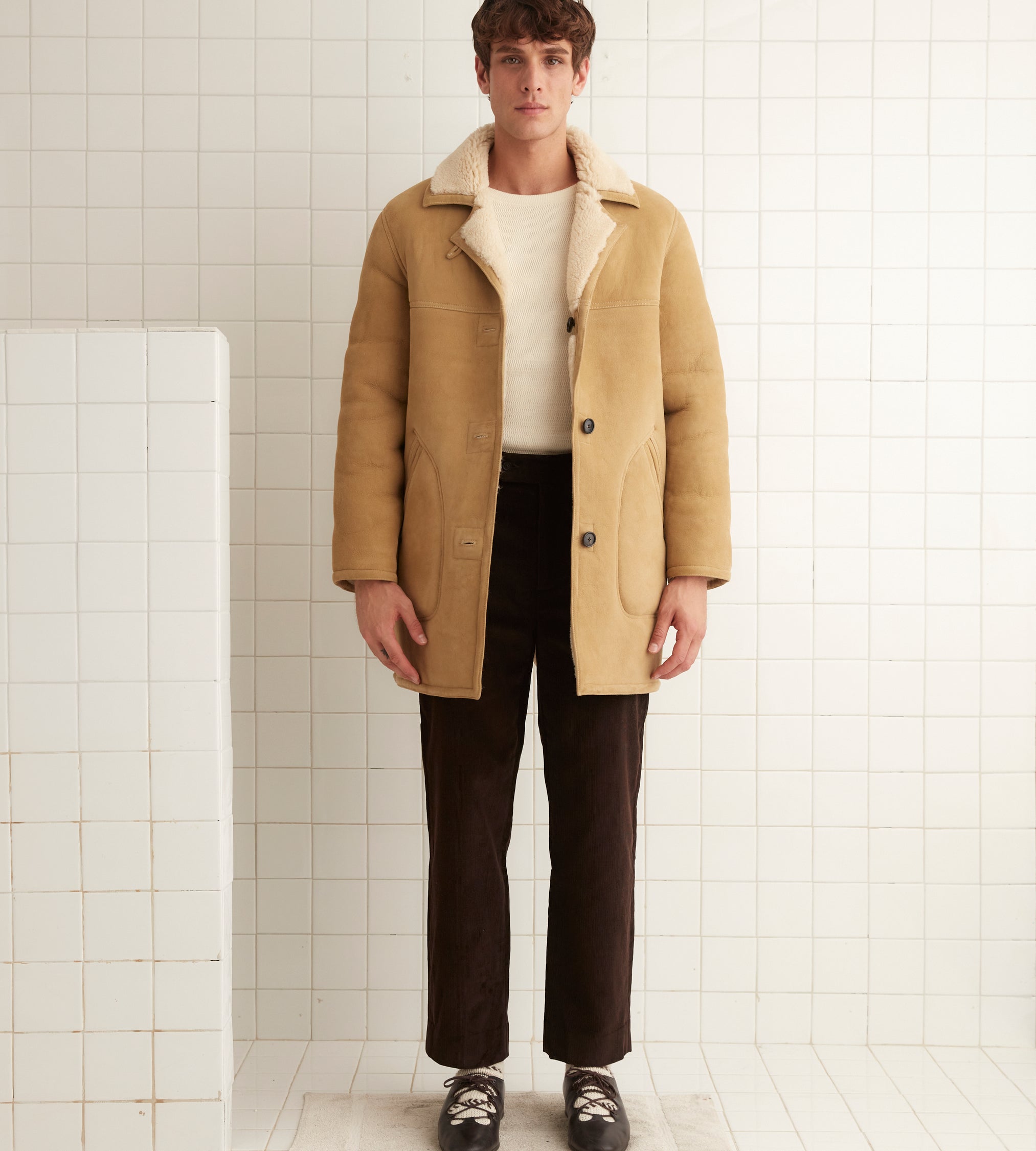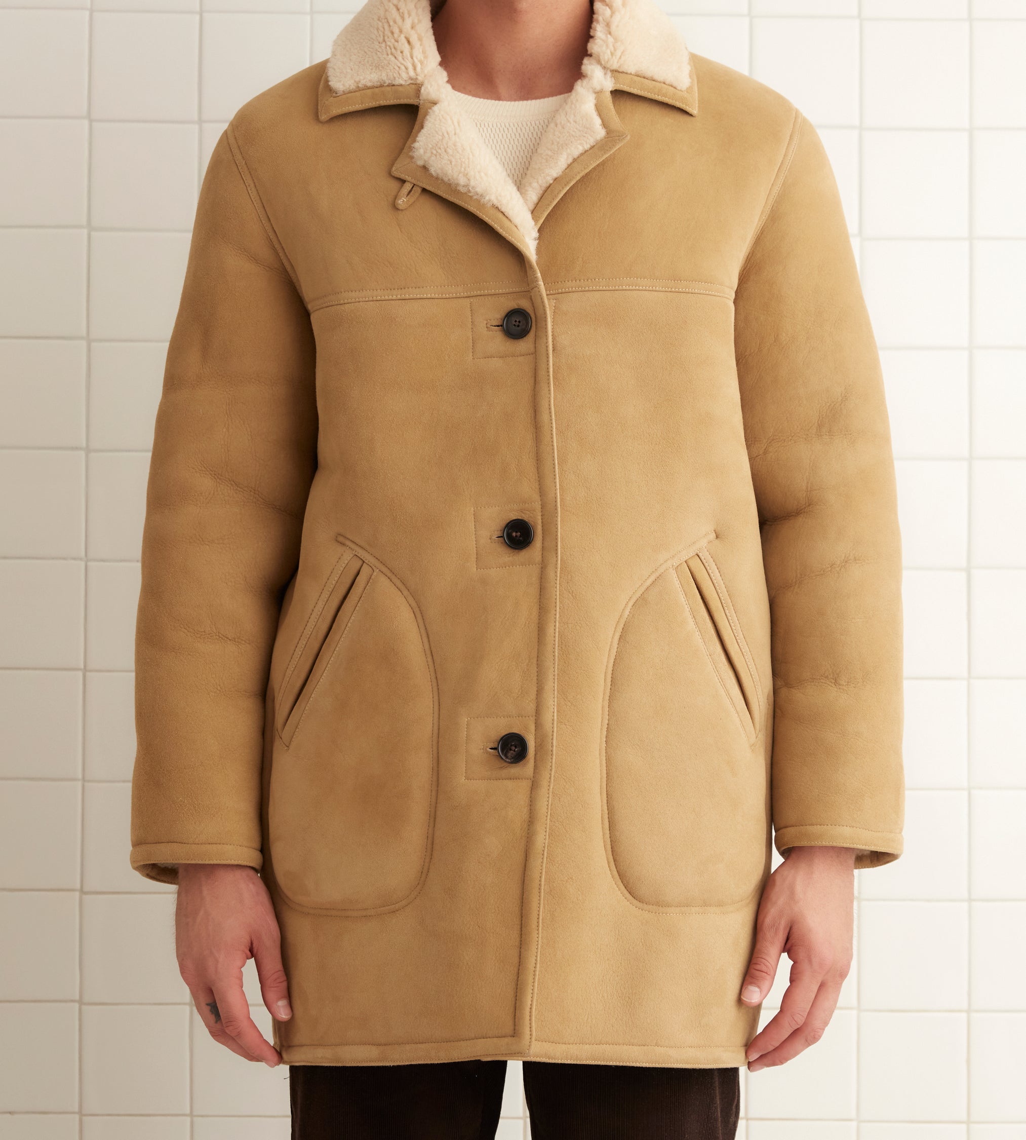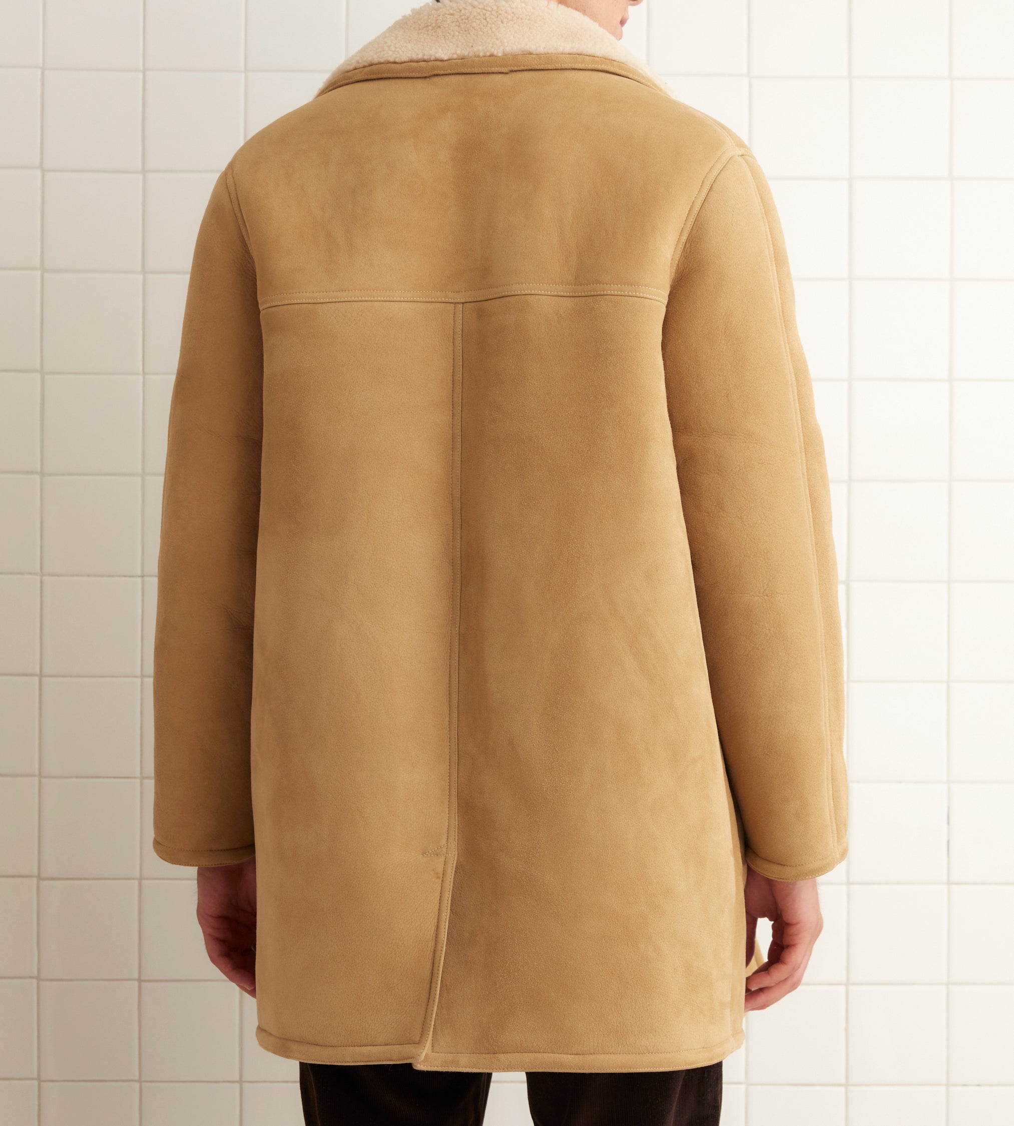 This coat is a historical reproduction of a shearling and suede ranch coat from the 1950s. It is reversible and can be worn either with the shearling or the suede facing out.